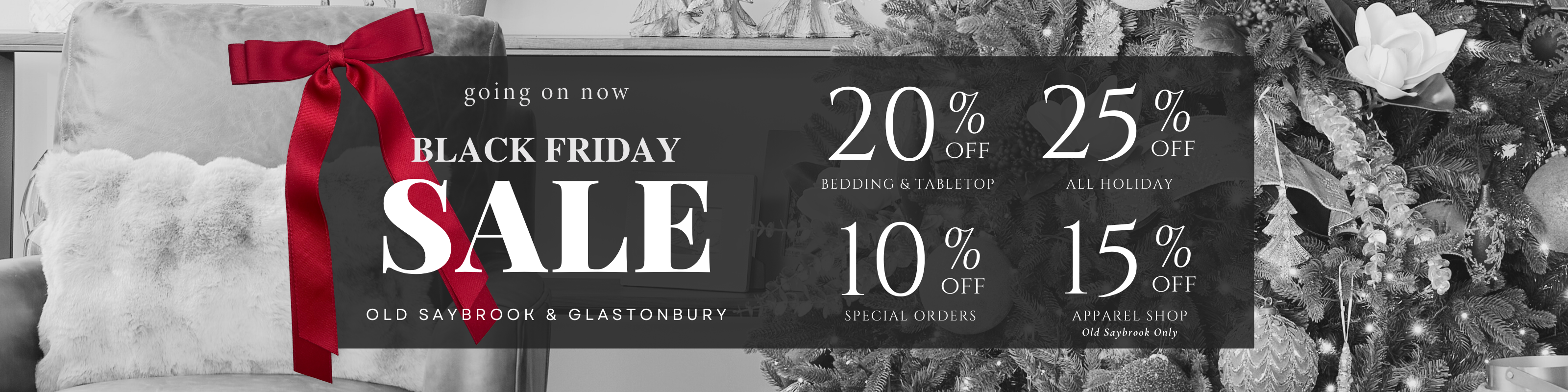 Nov. 28 - Dec. 1 Warehouse Sale - Floor sample markdowns up to 50% off msrp 10% off all special order furniture* 25% off all holiday decor 20% off all Tabletop and Bedding 15% off all apparel -...