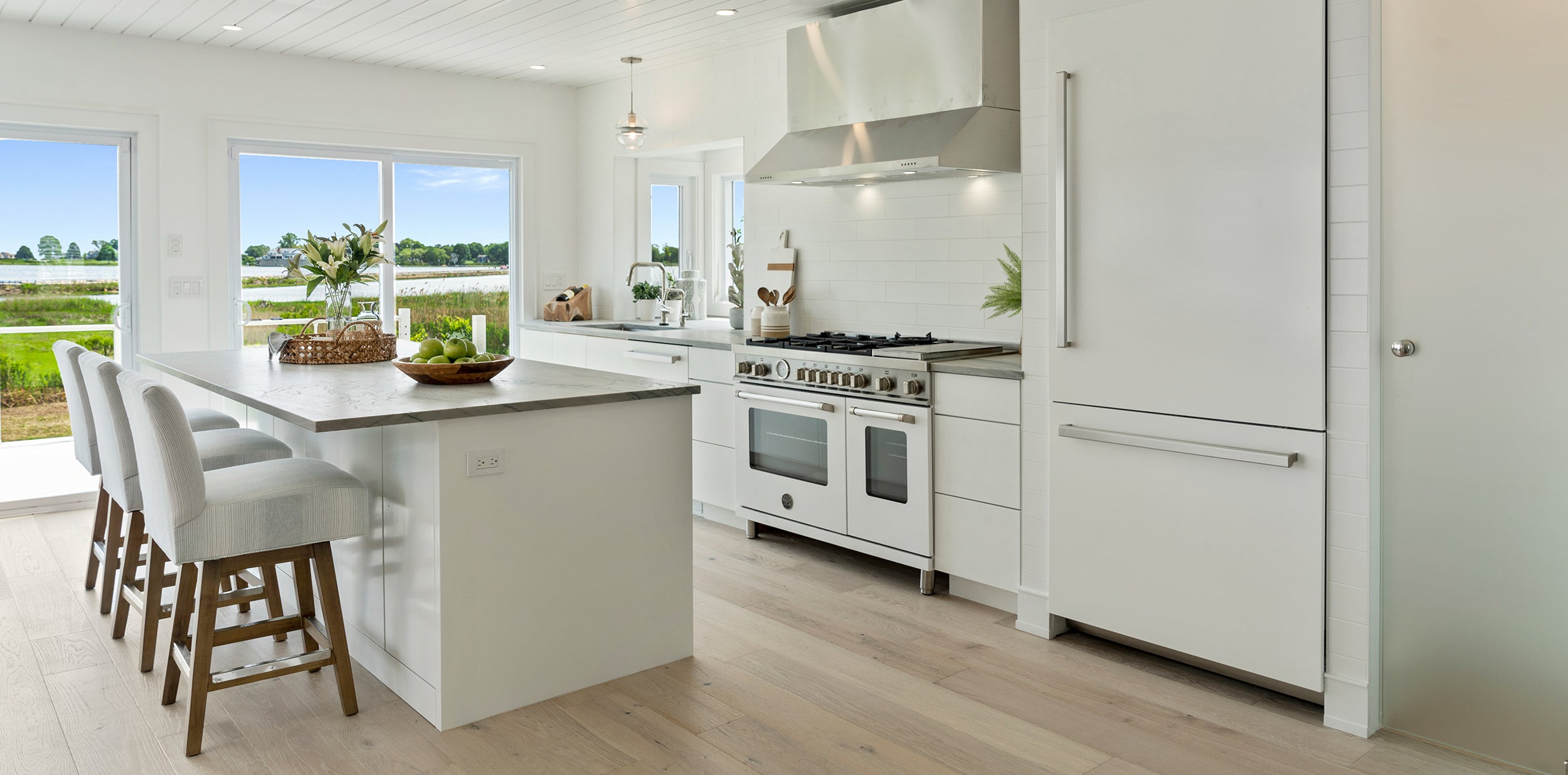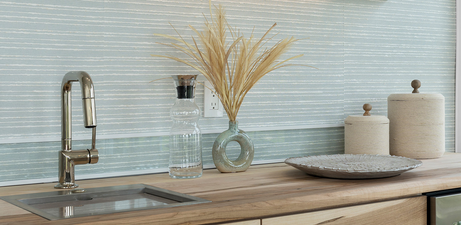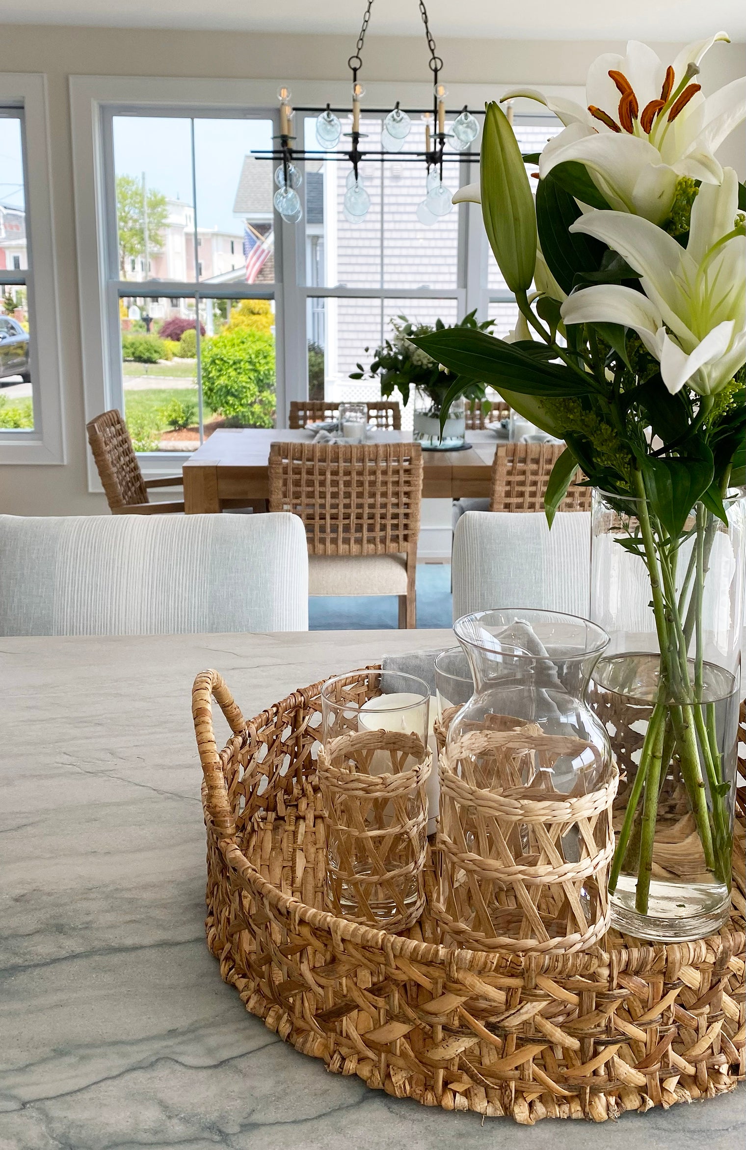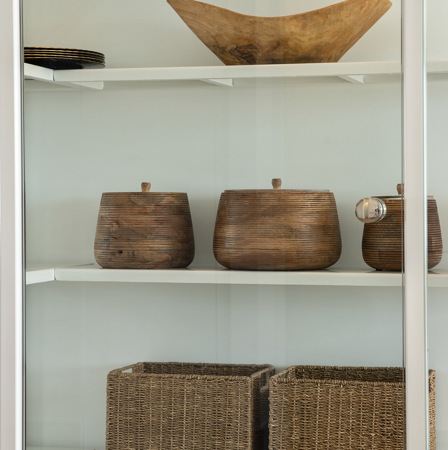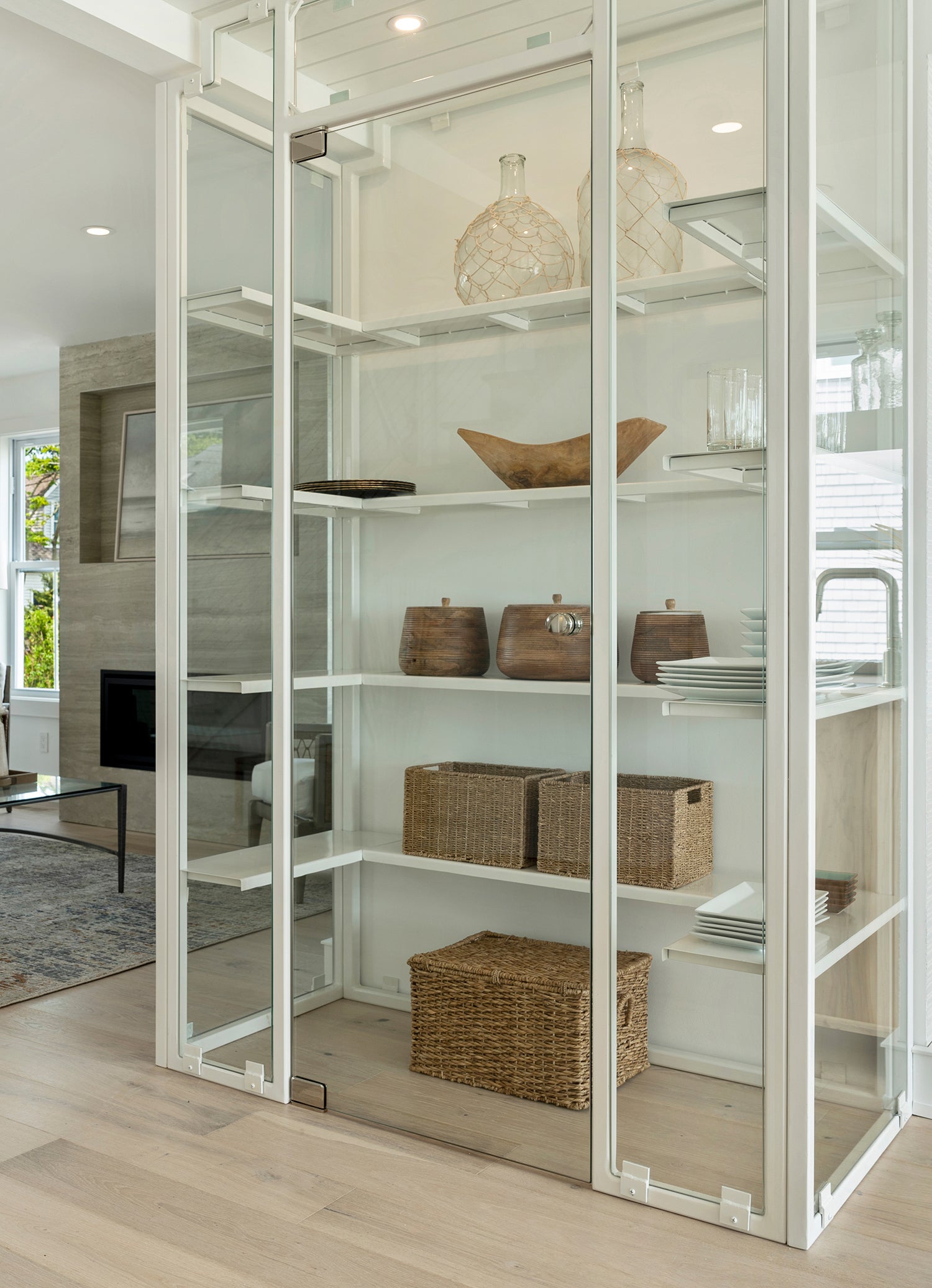 Unique elements such as the glass kitchen pantry called for accessories that accentuated the feature without detracting from it. While the space leaned toward contemporary, the pantry space was grounded by more traditional, demure accessory items.