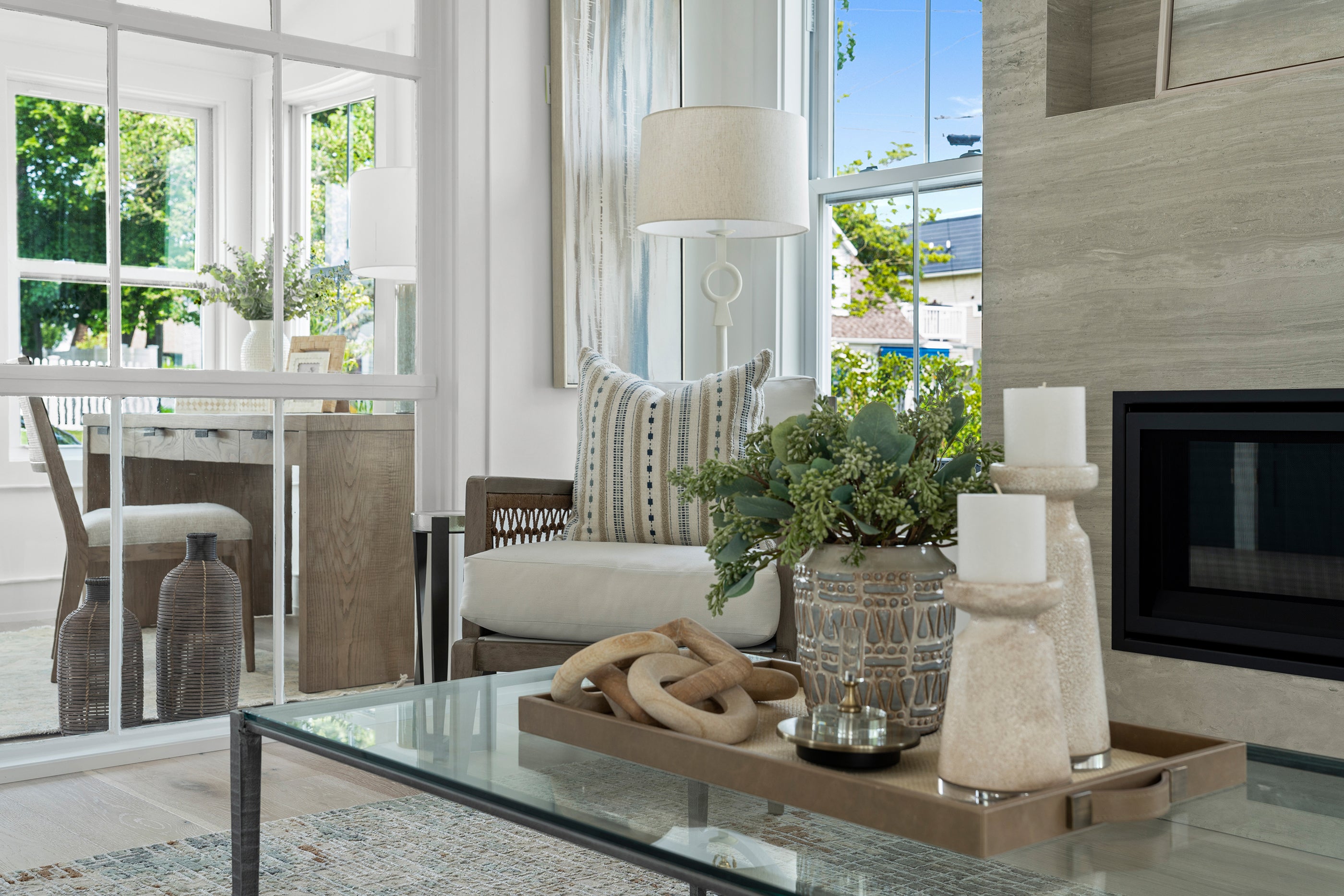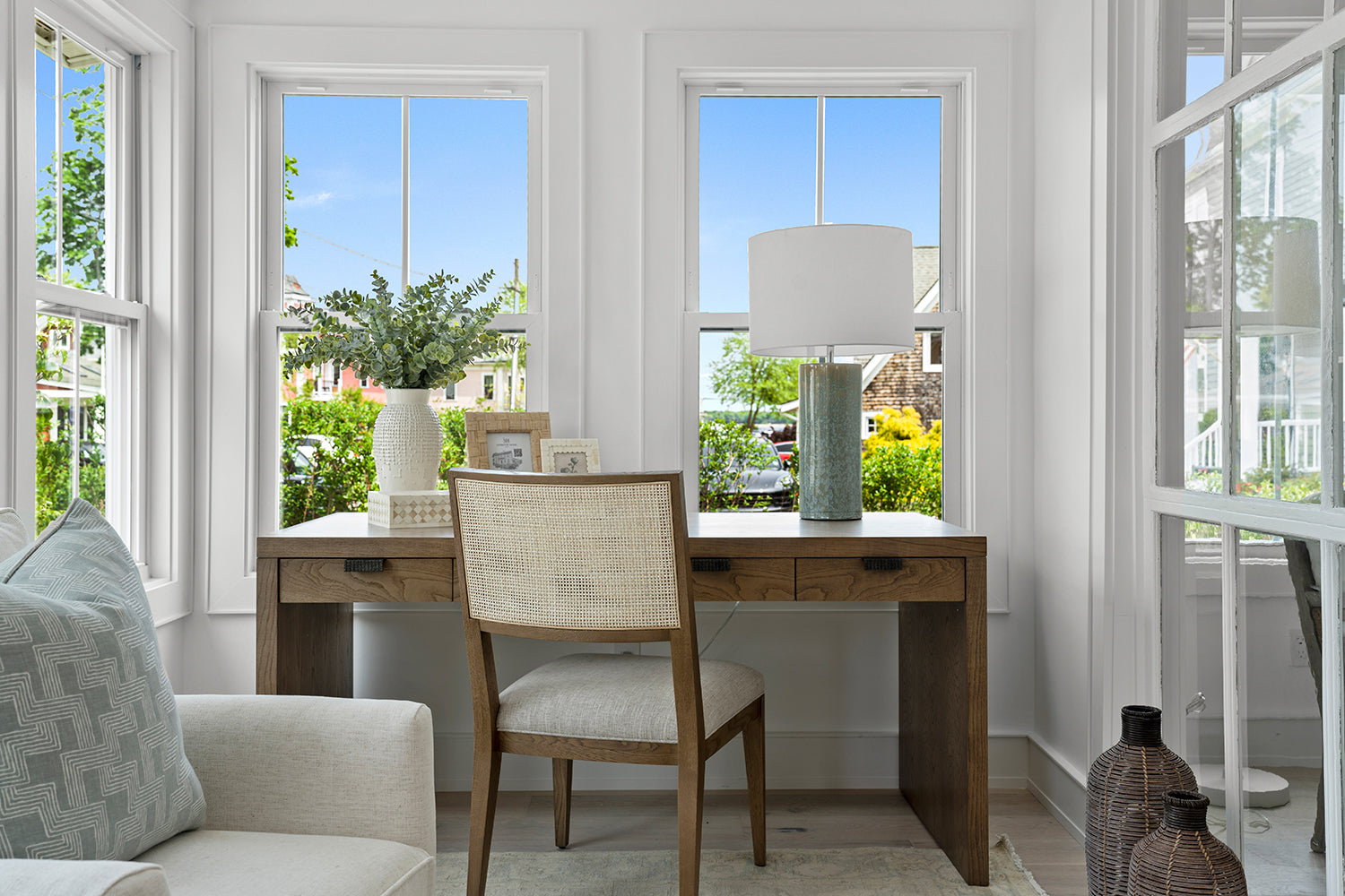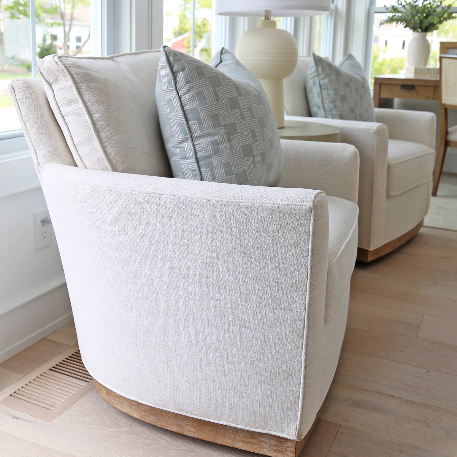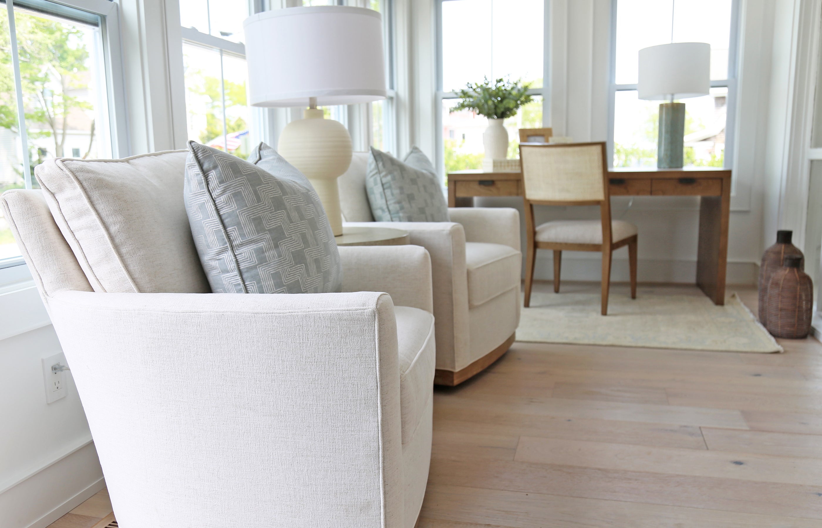 Because of the home's petite footprint, our designers had to get creative with how to use the furniture within each of the spaces. The front sitting room doubles as a home office. Swivel chairs with an understated profile ensure comfort without taking up too much space.