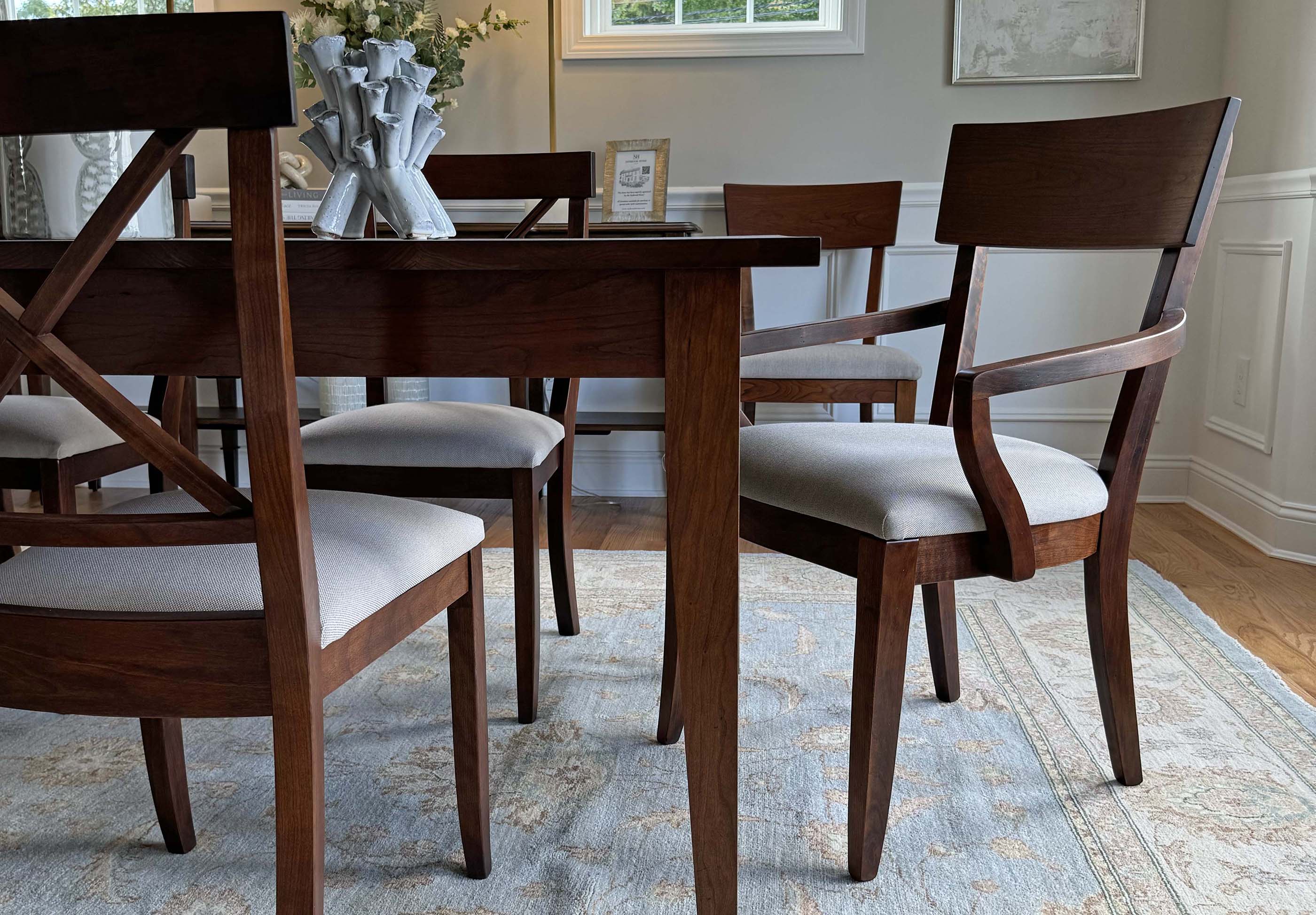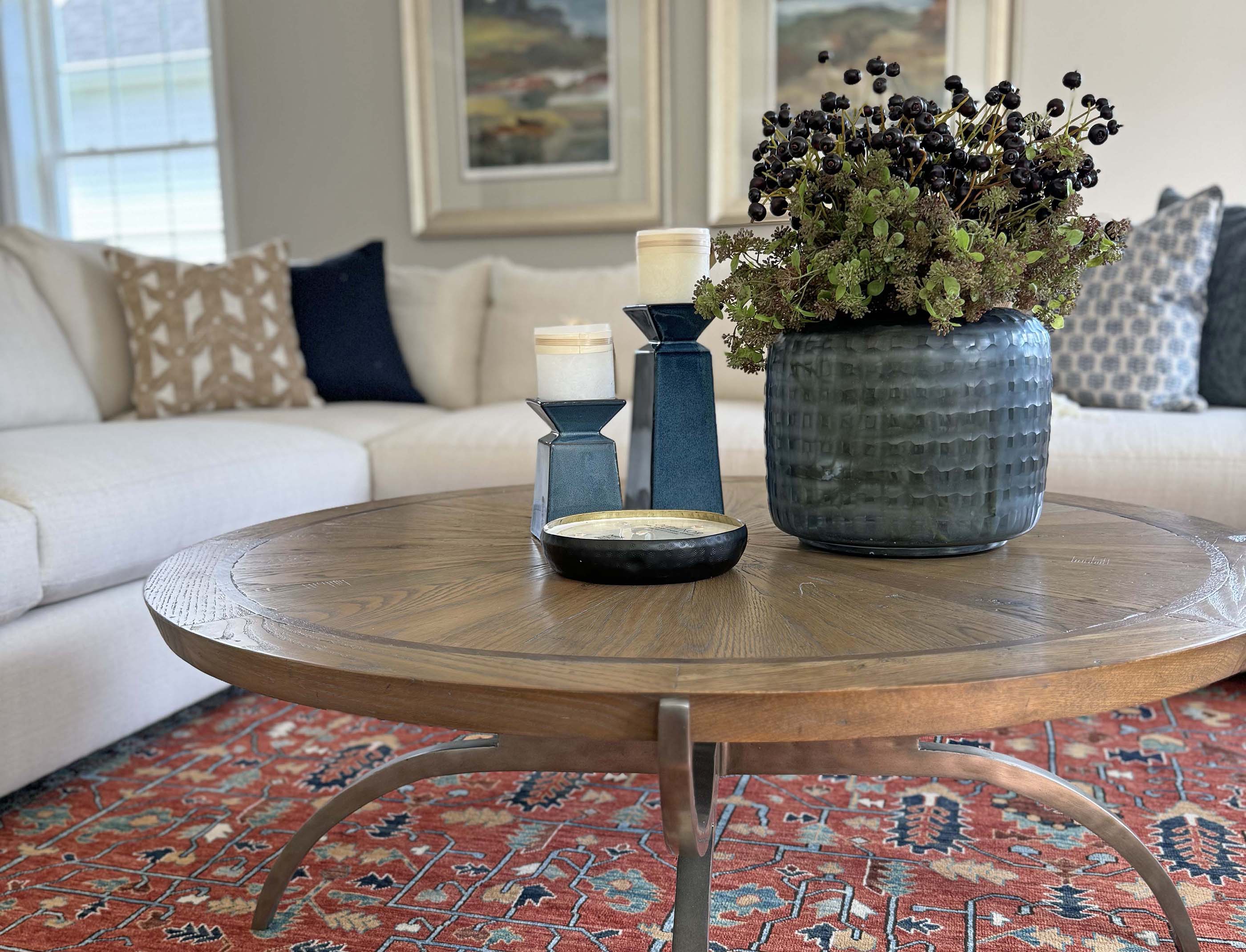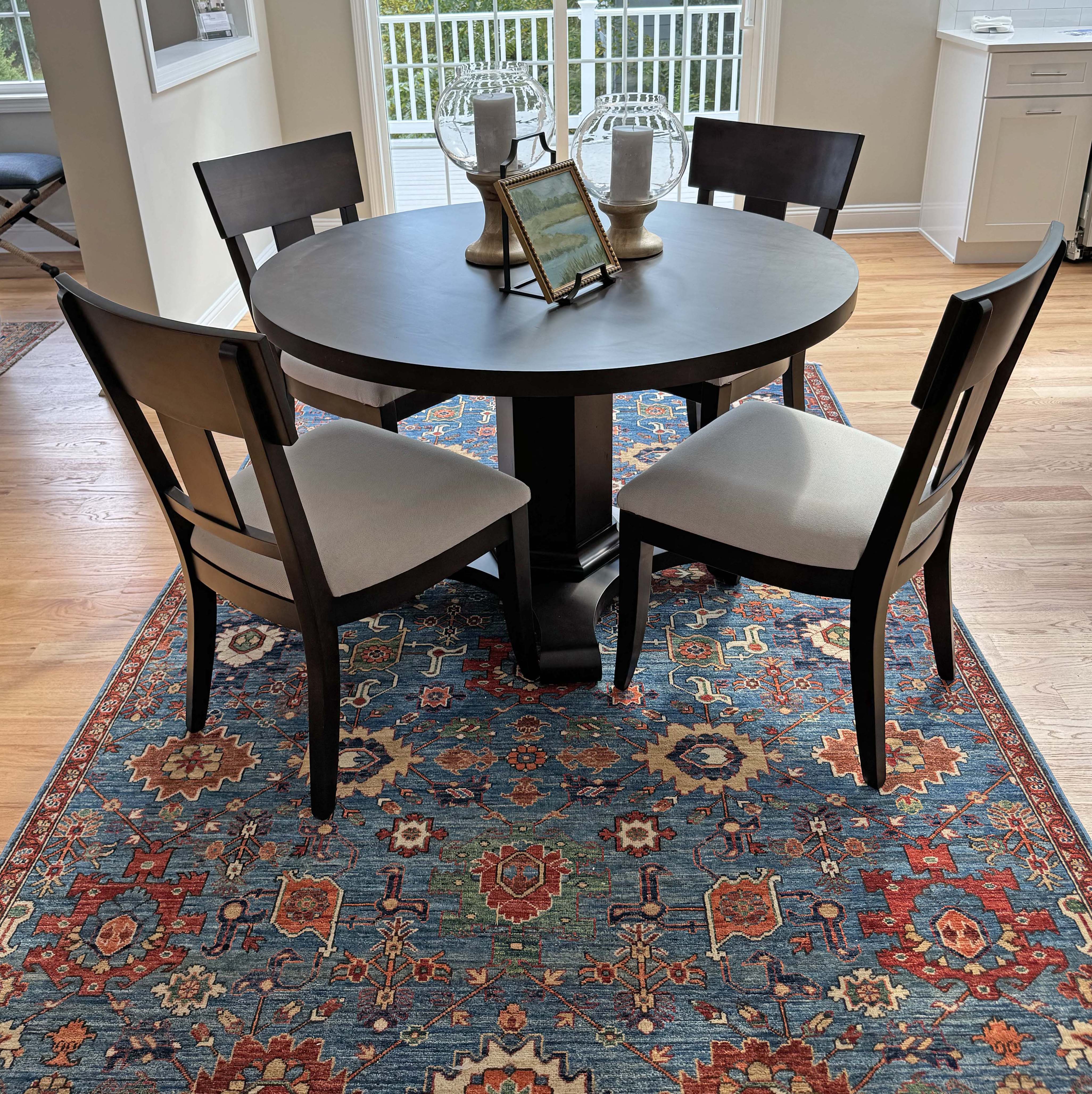 The kitchen dinette is grounded by a stately Serapi hand-knotted rug. The lighter side faces in toward the room to showcase the blue color, complementing the palette from the great room.