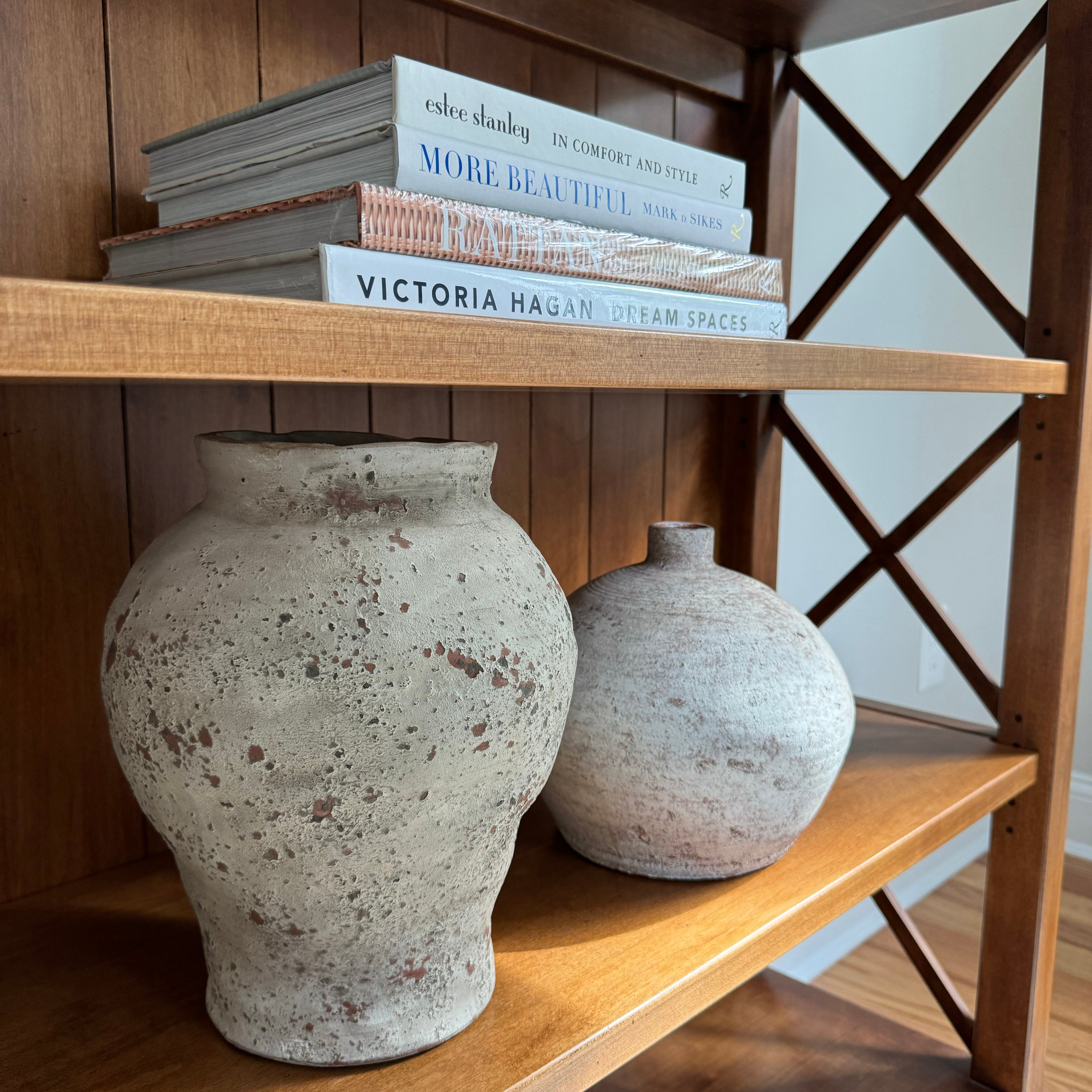 Two classic leather chairs flank a set of etageres in the great room creating a separate reading nook within the larger space.