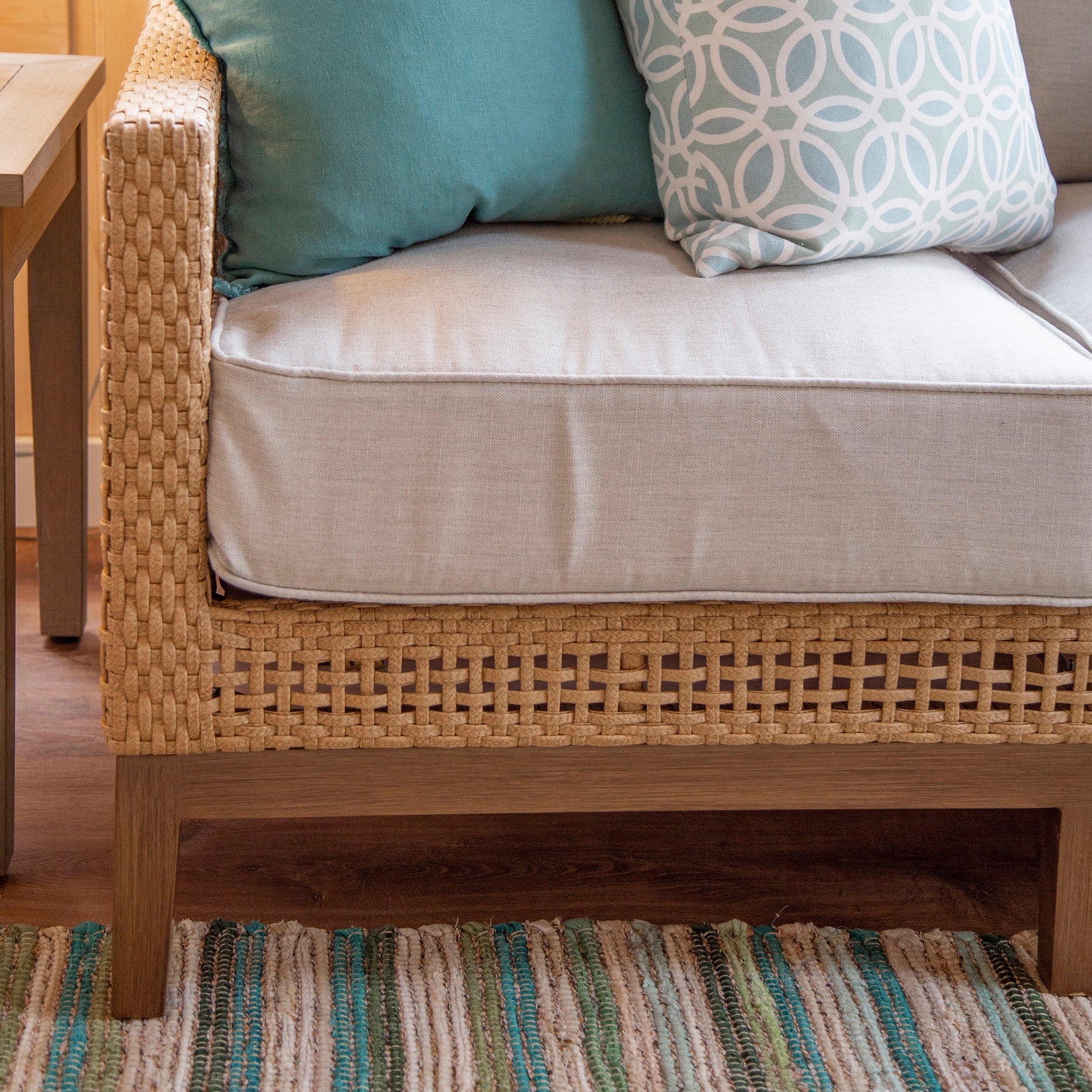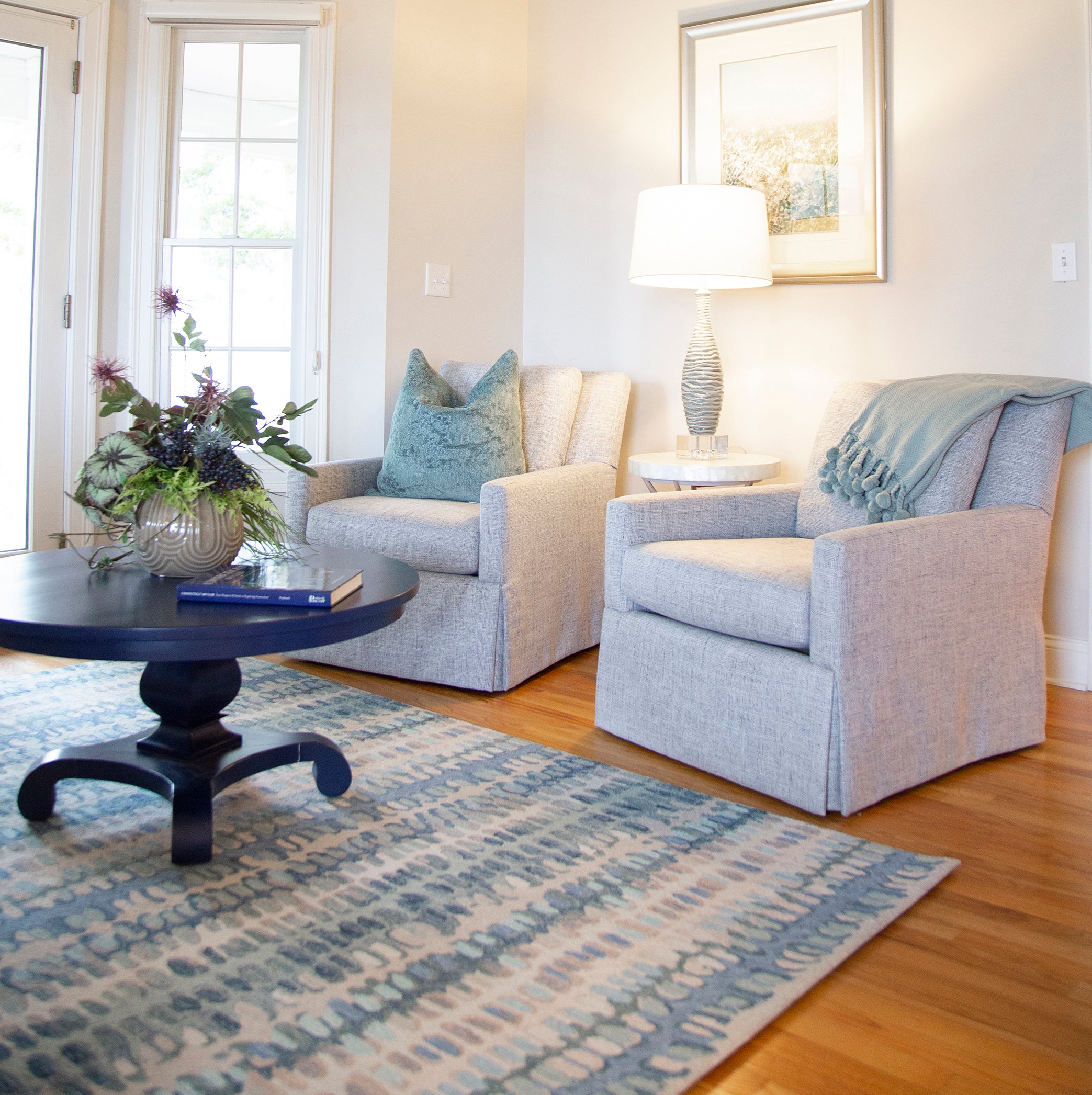 The home's sunroom was the perfect place to implement a coastal vibe. Teals and greens with a mix of natural material pieces gave the space character. A great retreat for a summer afternoon!