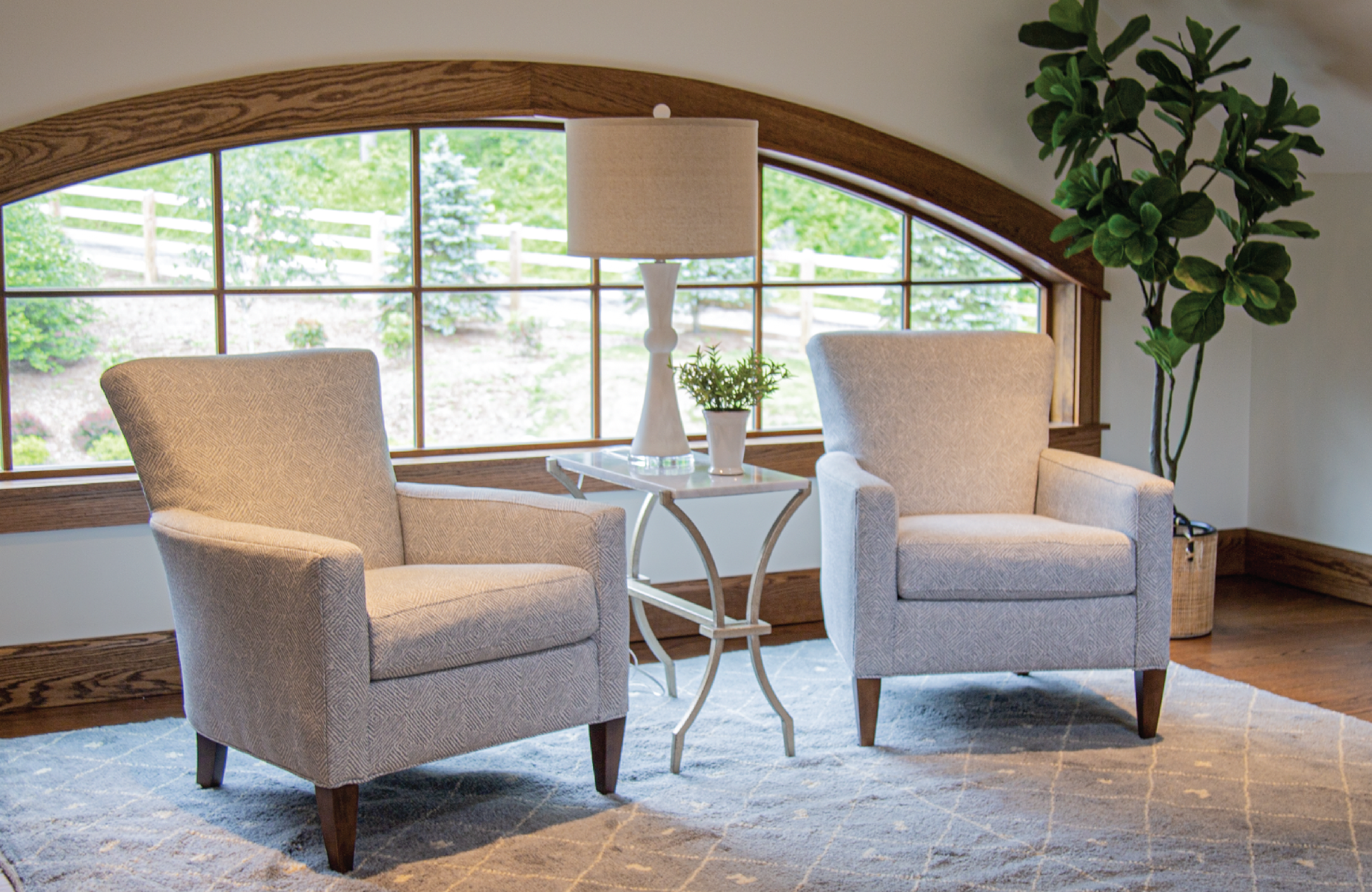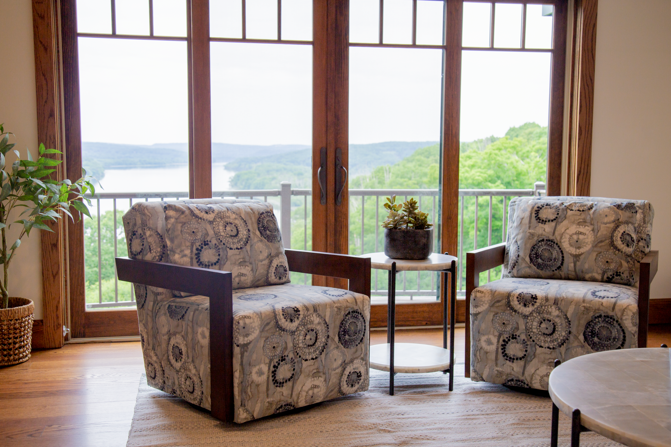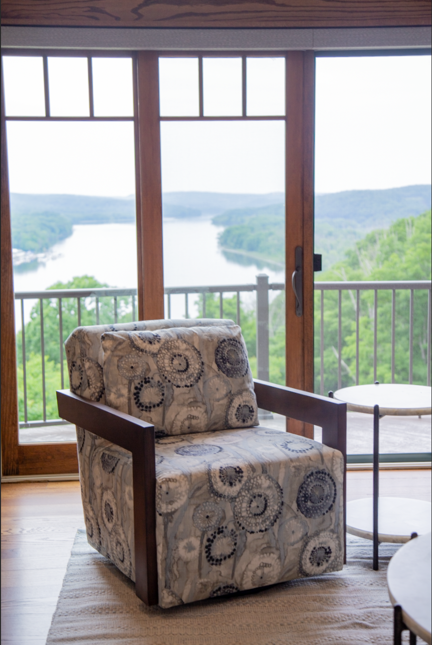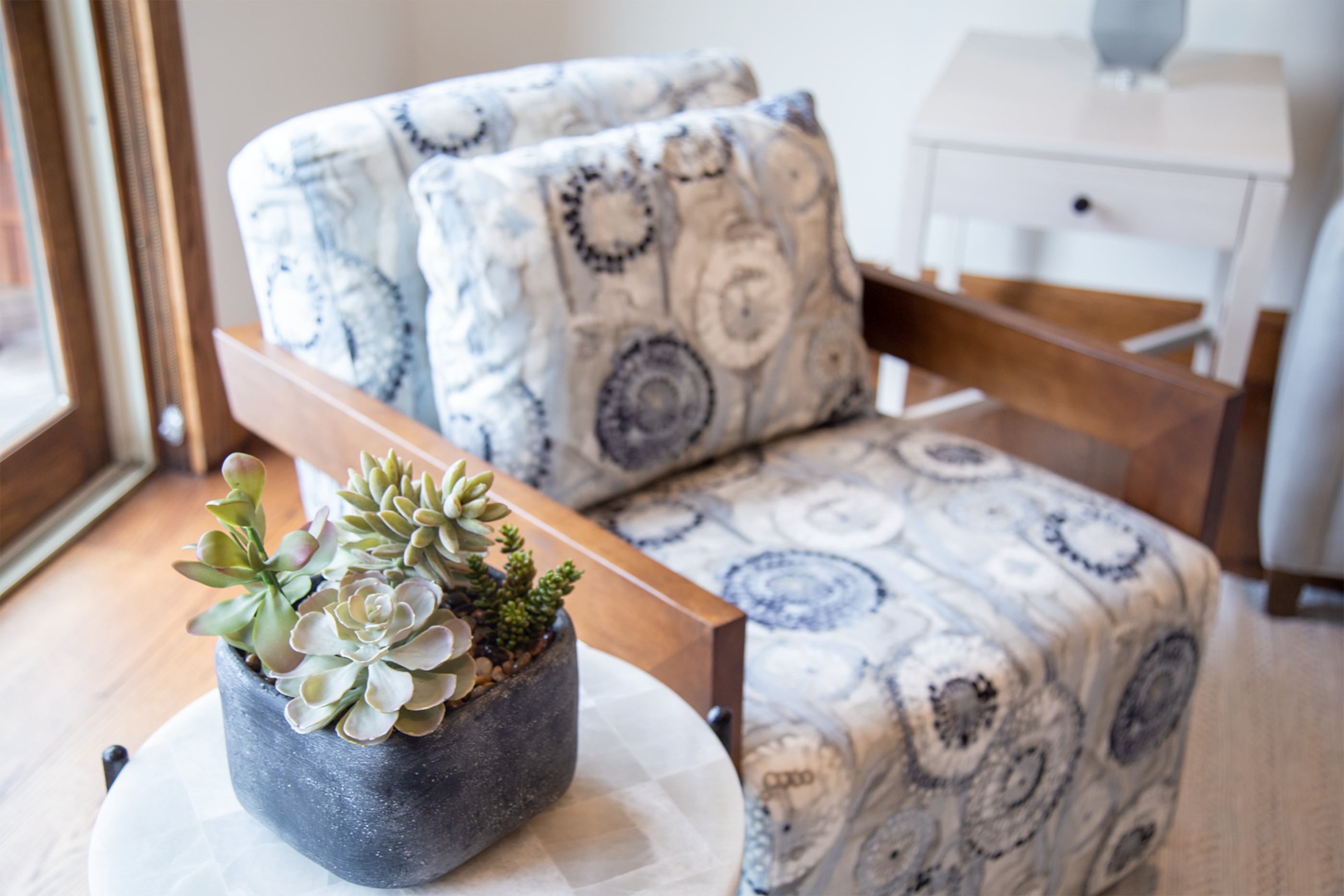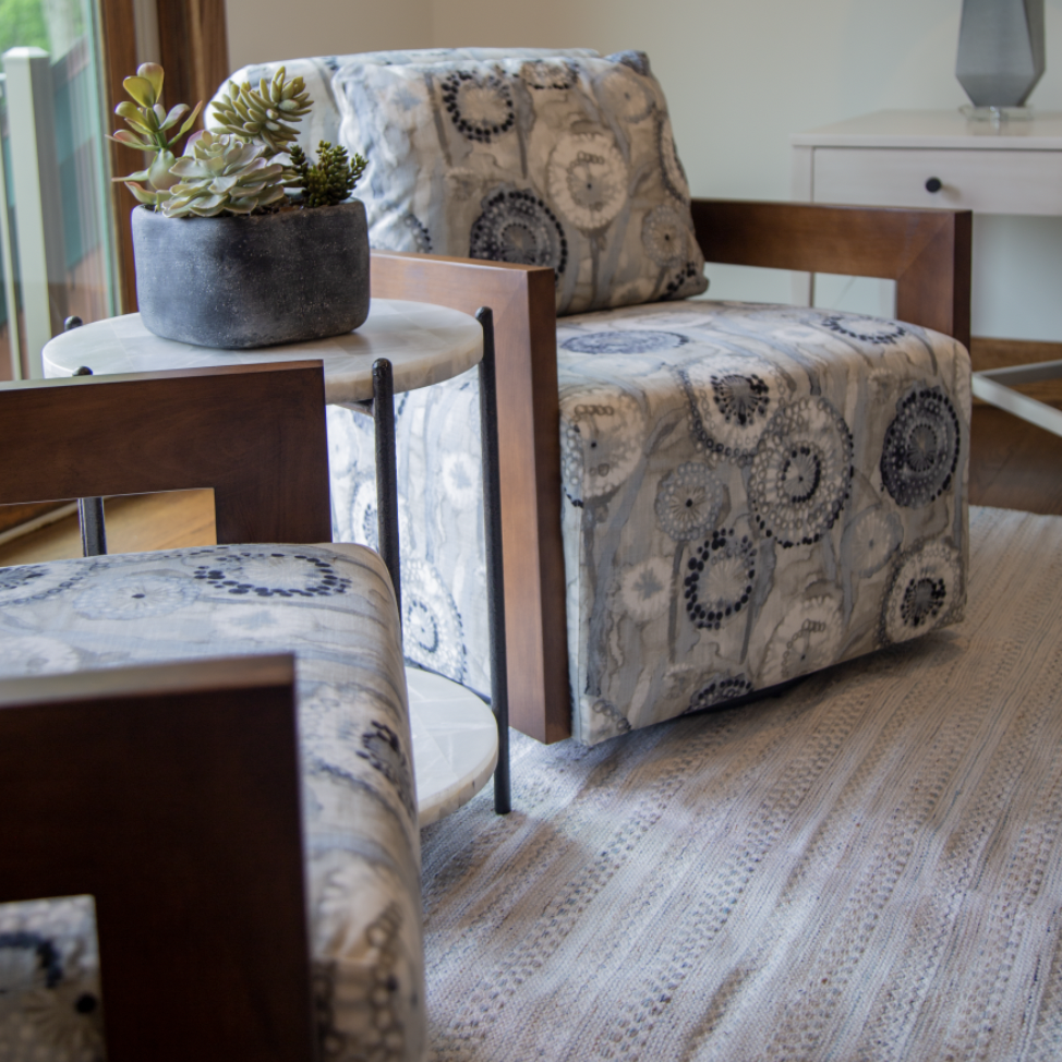 The sleek wood-stained arms create bold design lines for a true contemporary style. Pairing it with such a playful fabric, allowed it to connect with the rest of pieces in the room.