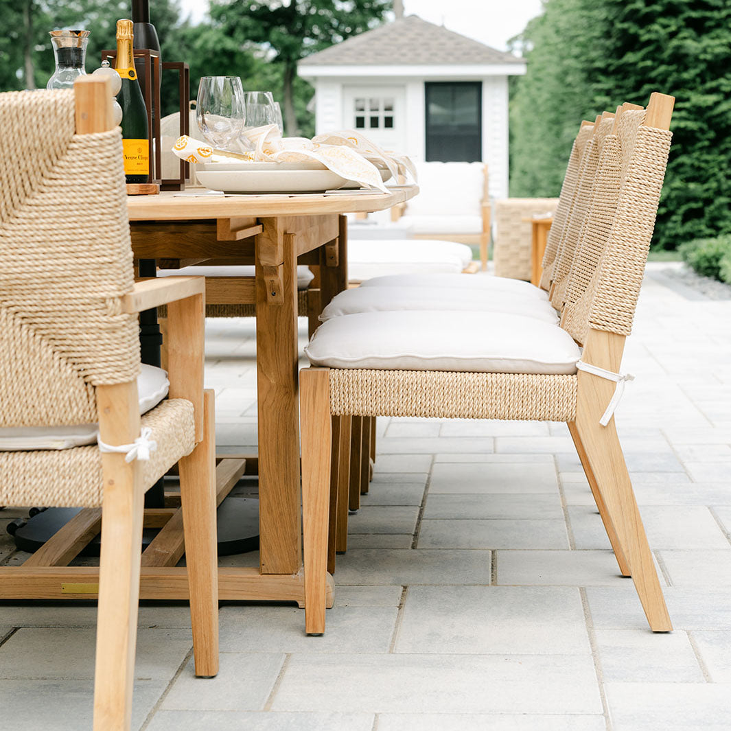 Dining al fresco doesn't mean sacrificing elegance with the Essex table and Hadley chairs from Kingsley Bate. There are plenty of spots for guests to gather around and share a meal together poolside!
