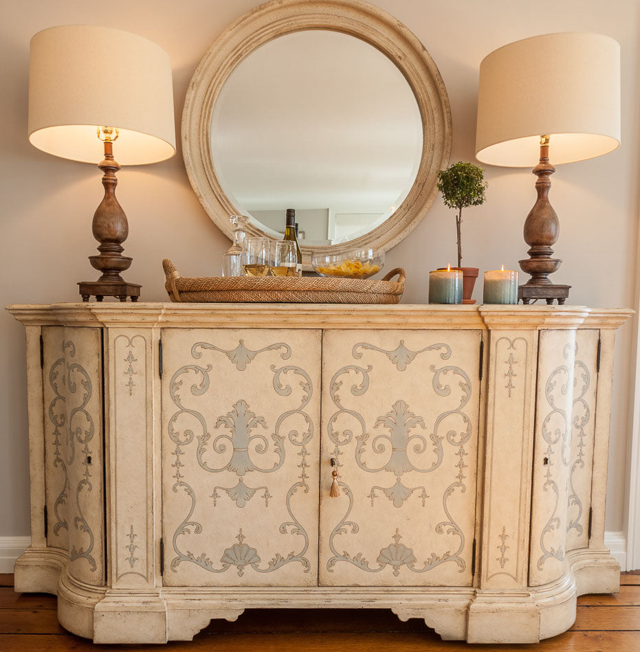 Traditional statement pieces elevate the look beyond it's neutral color story, adding intrigue and drama.