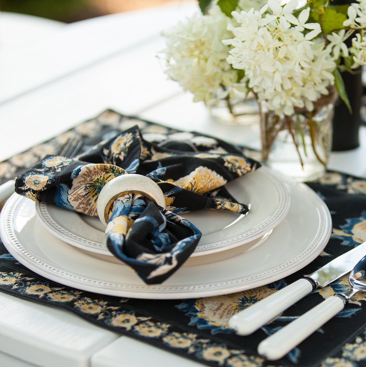 Colorful details to mirror the river elevate the outdoor dining area, a great spot for entertaining guests in the summer months.
