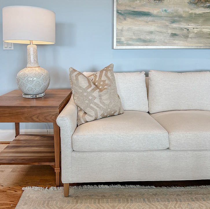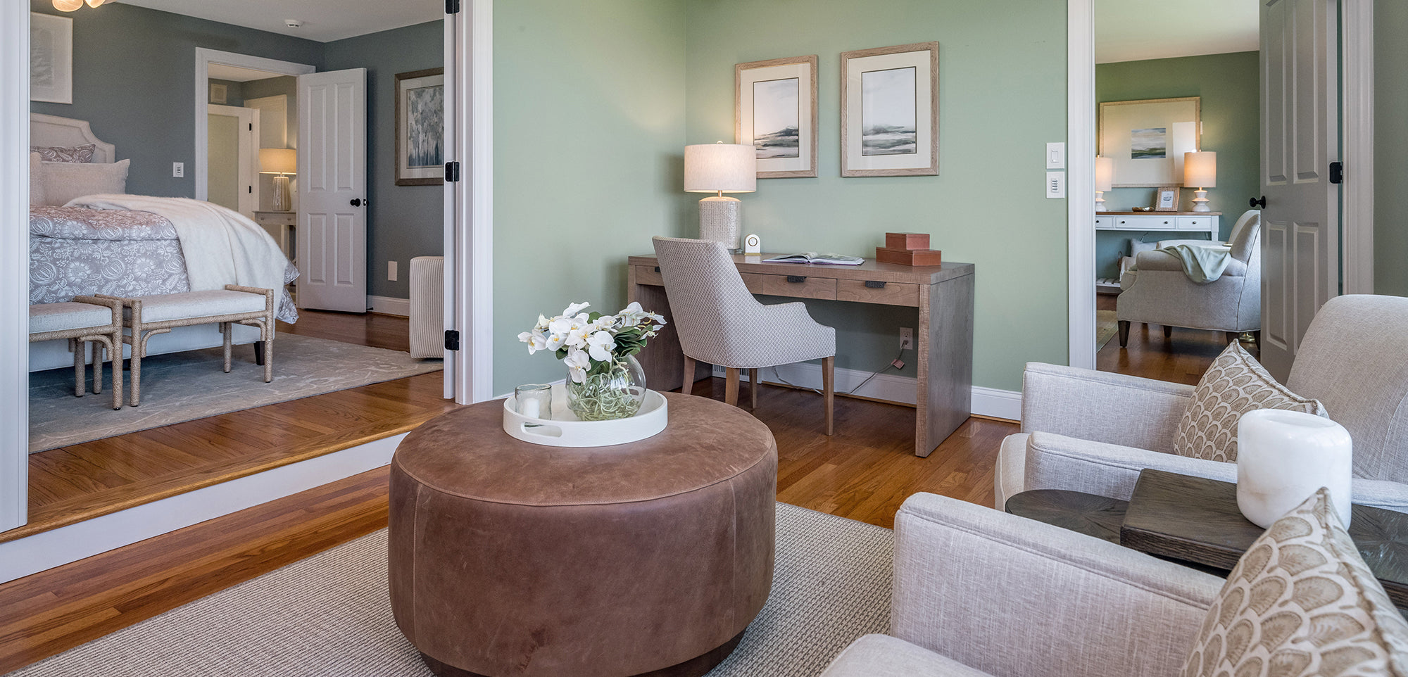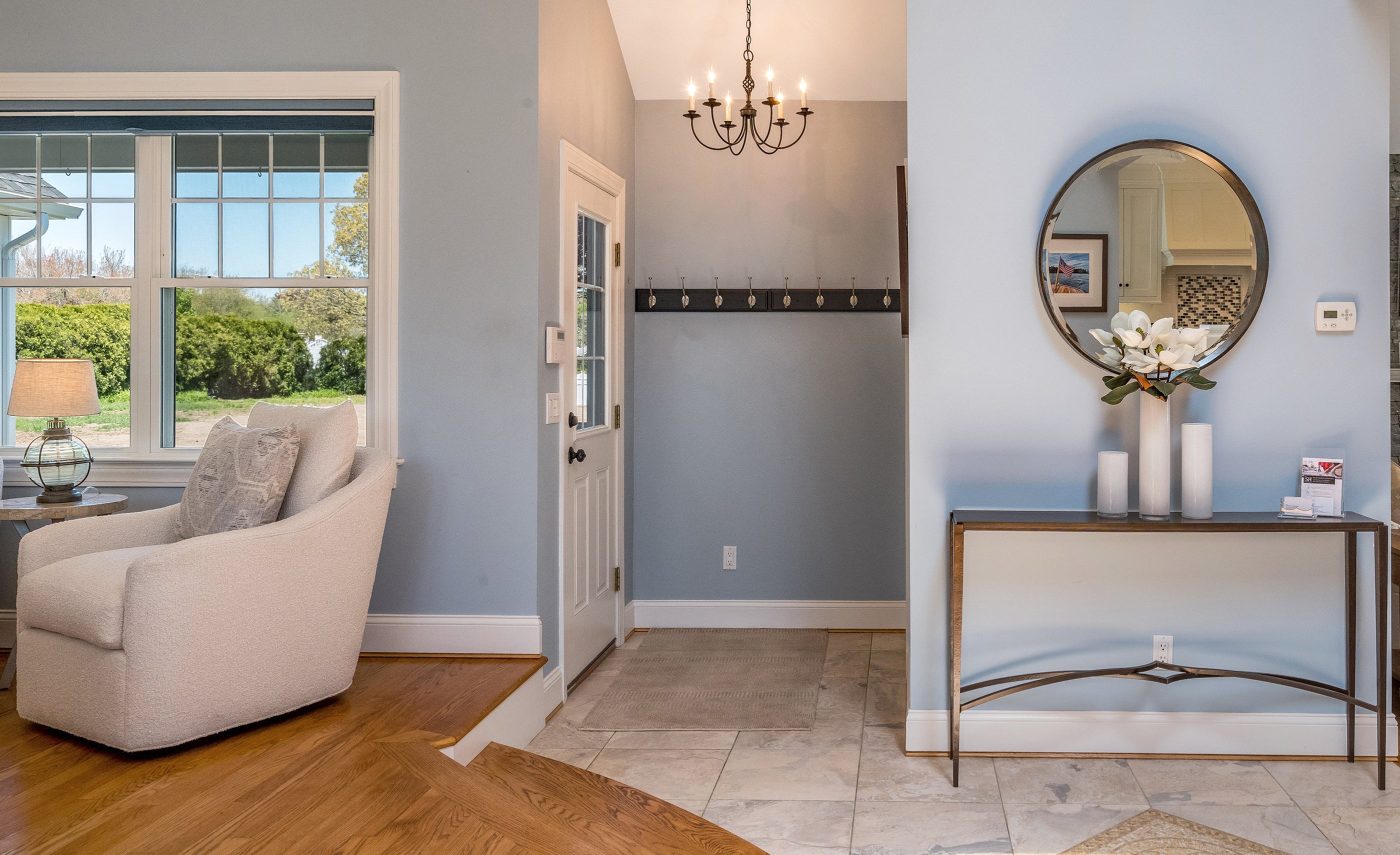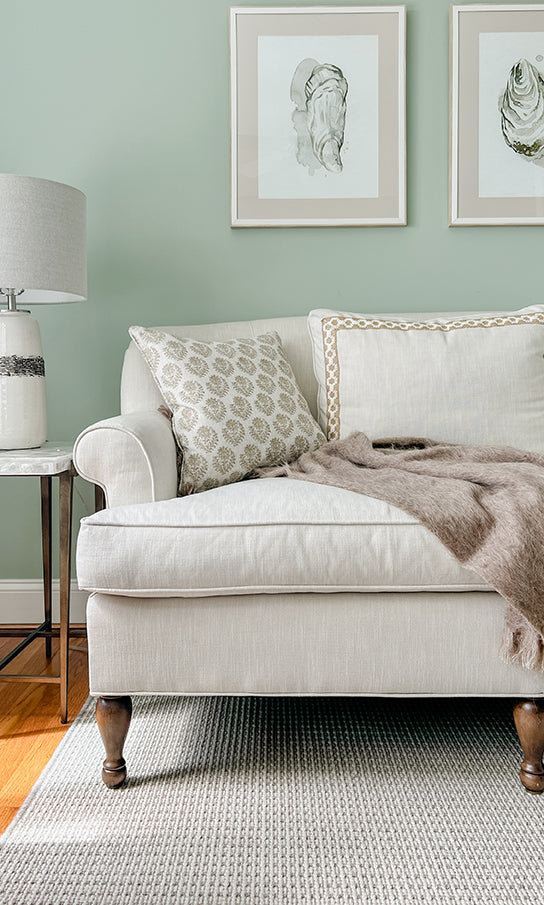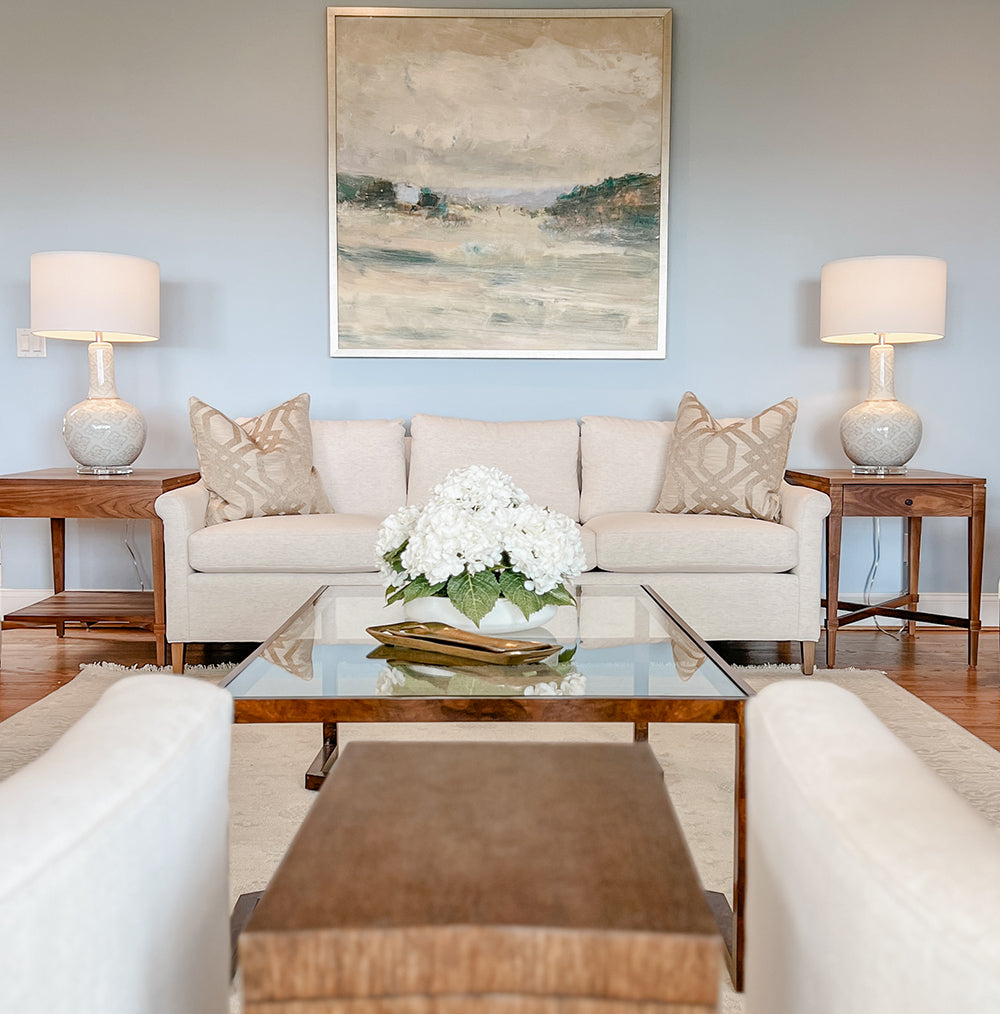The waterfront home's paint scheme consisted of a lot of blues and greens, so Teresa opted for neutrals in the upholstery and accessories, with hints of color to tie the look together.