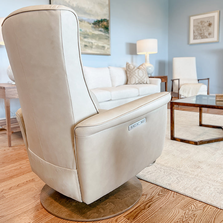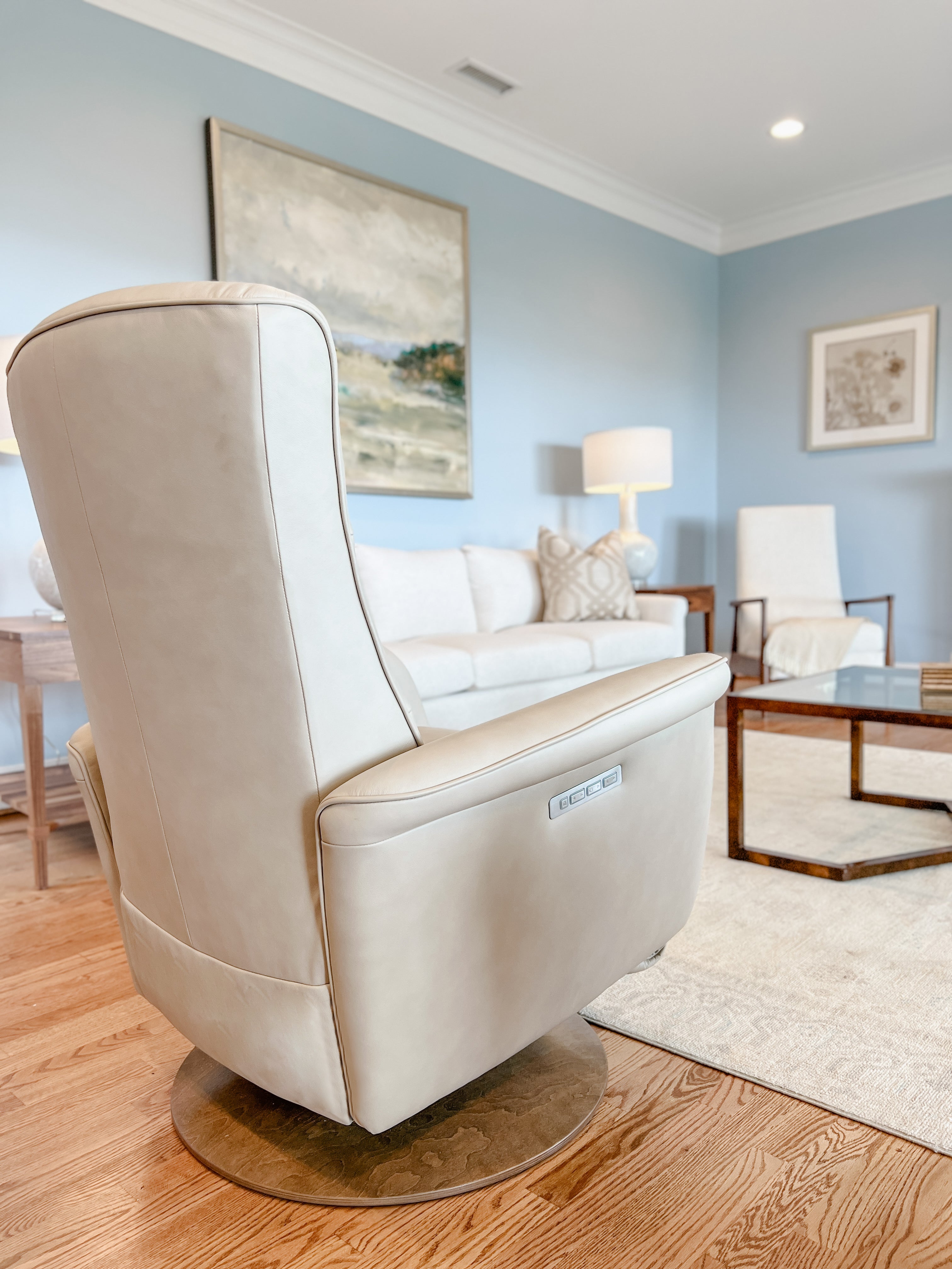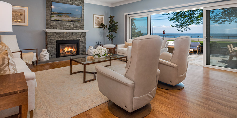 Teresa kept the look and feel of the living room minimalistic, with clean lines and geometric accents. A thoughtfully planned space, the neutral palette complements the waterfront vista through the sliding glass doors.