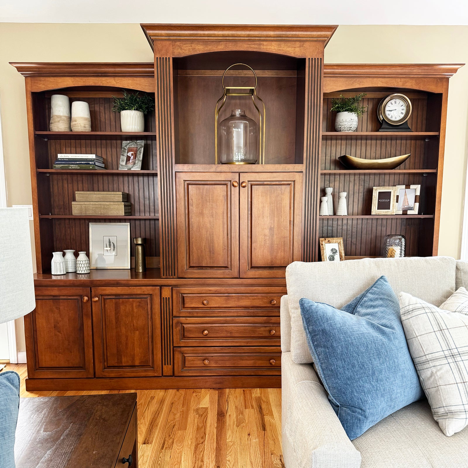 A built-in bookcase offers additional space to style with decorative accessories, family heirlooms and books.