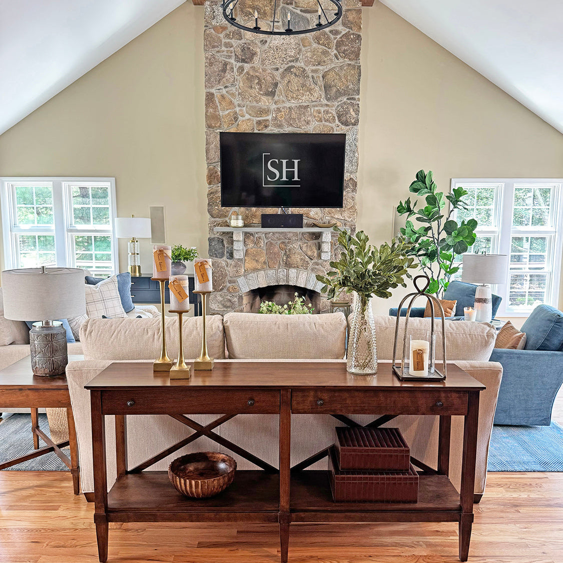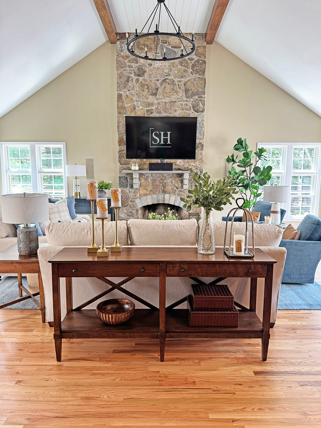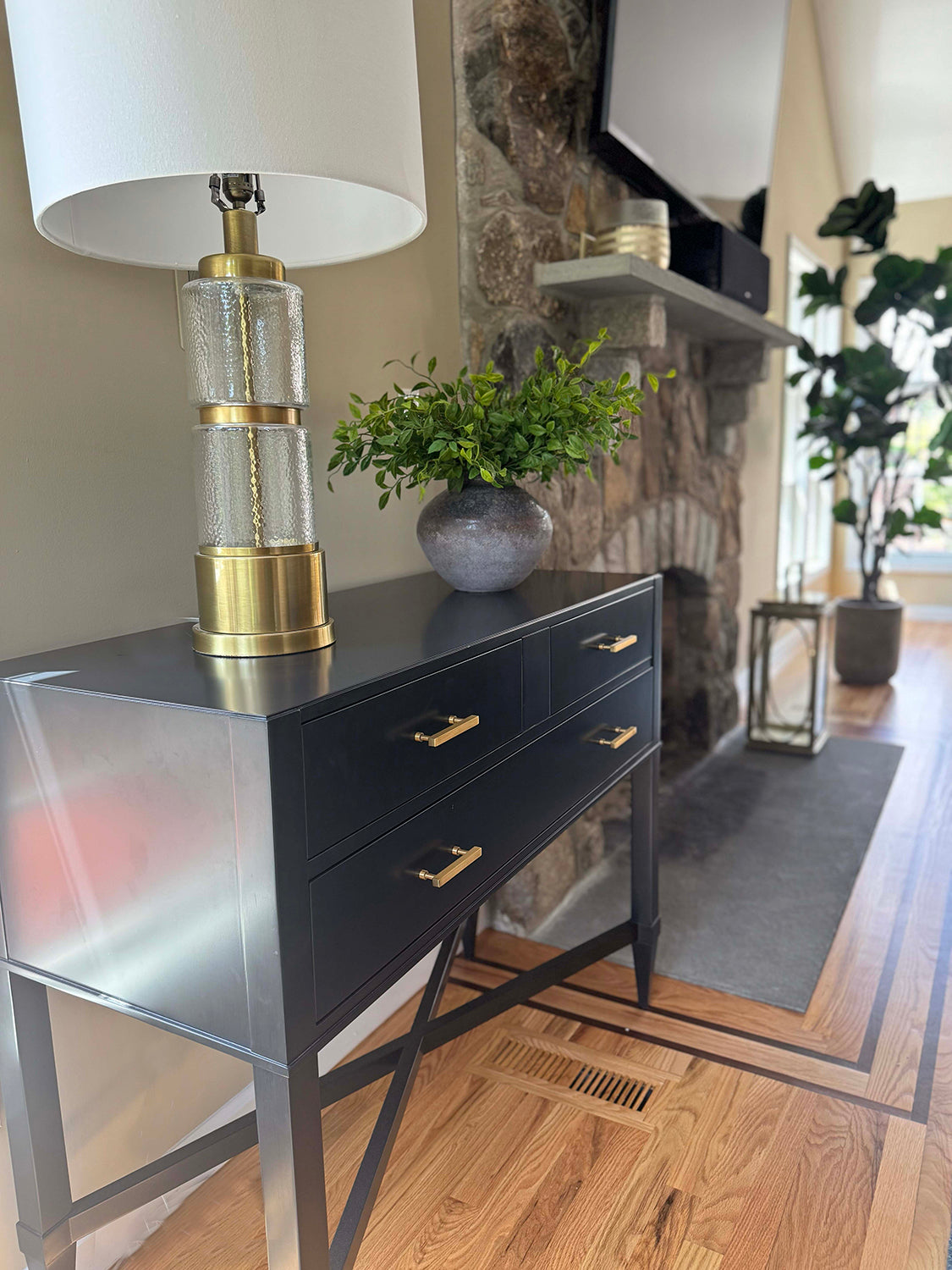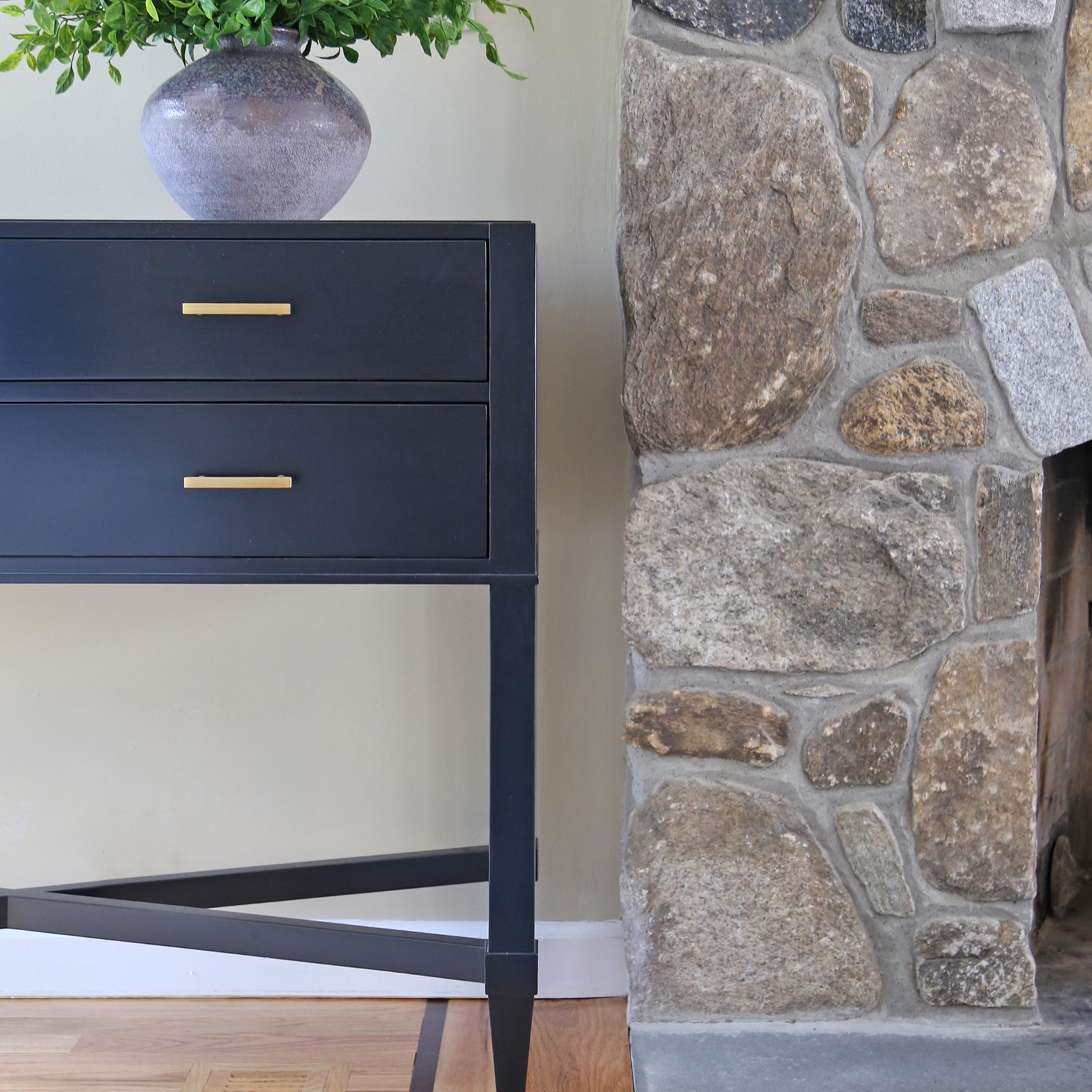 Adjacent to the room's fieldstone fireplace, the Provence Hall Chest in black provides the perfect contrast and an additional focal point in the room.