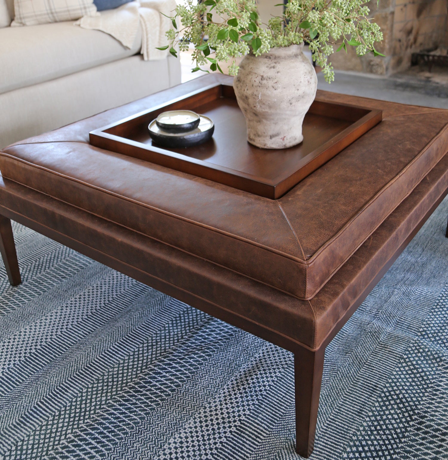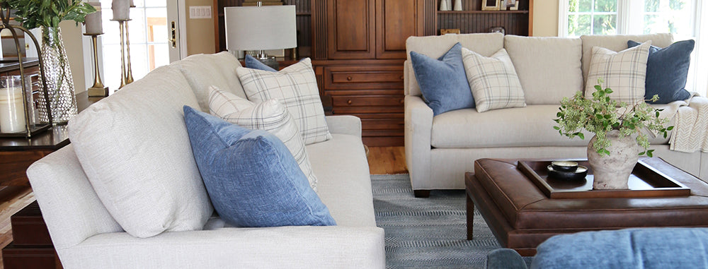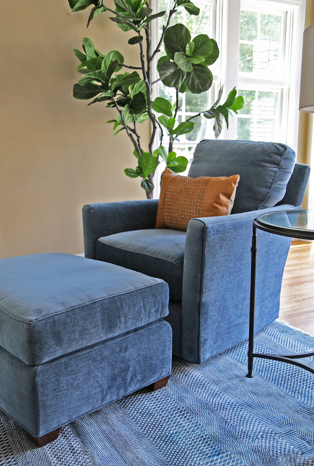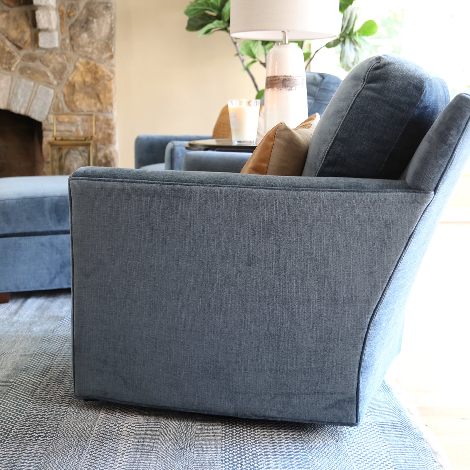 A sophisticated chenille/velvet fabric in a deep blue looks absolutely stunning on a pair of Murphey Swivel Chairs and matching ottoman. To tie the look together, toss pillows in the same fabric can be found on both sofas.
