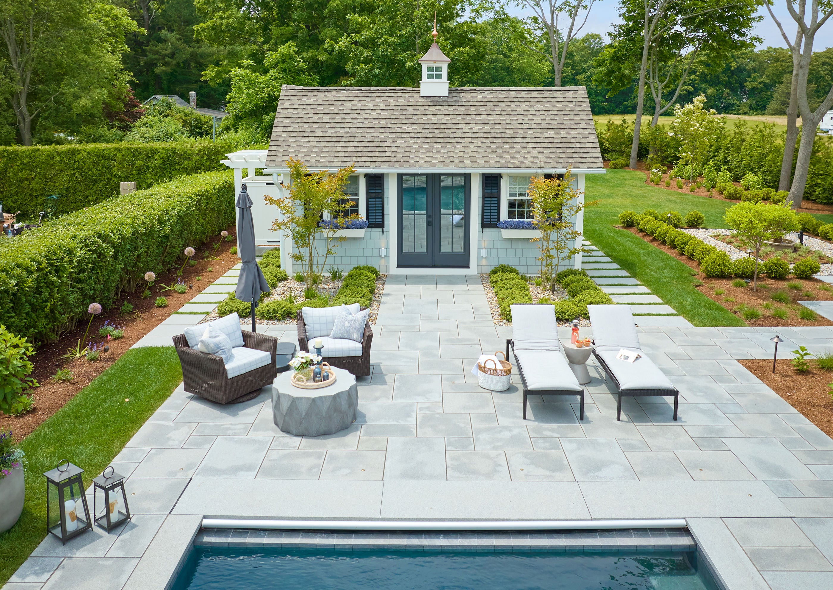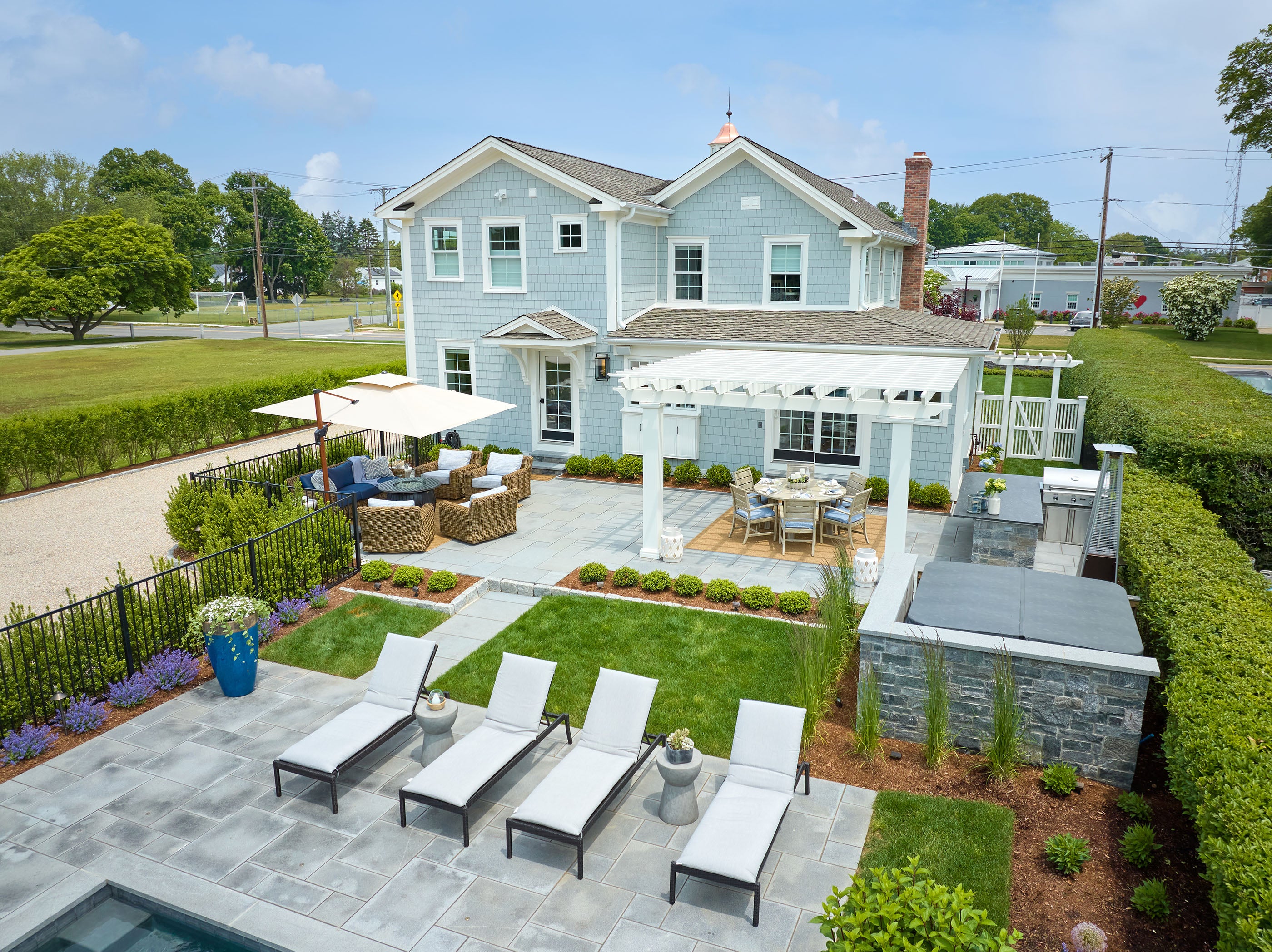 The theme of a pop of navy carries over from the home's interior and pays homage to the home's shoreline location.
