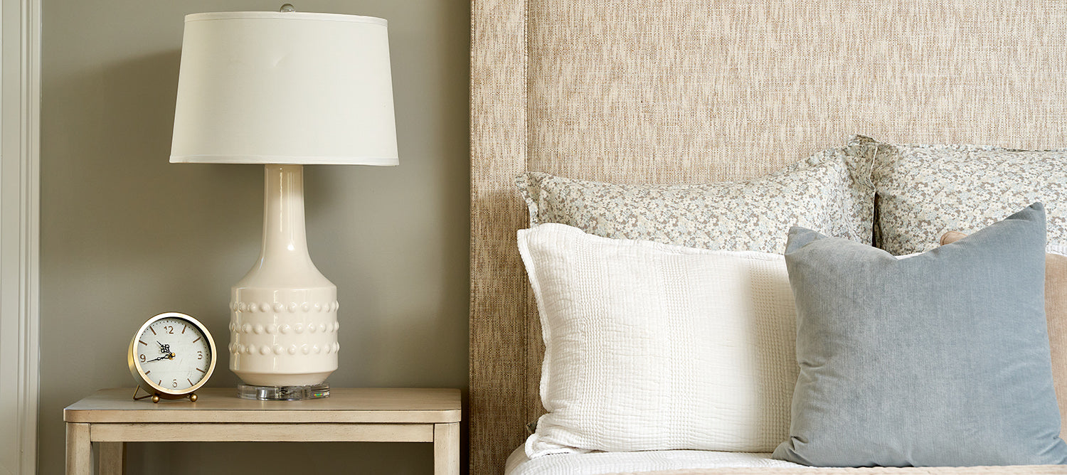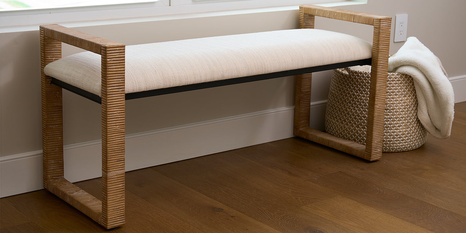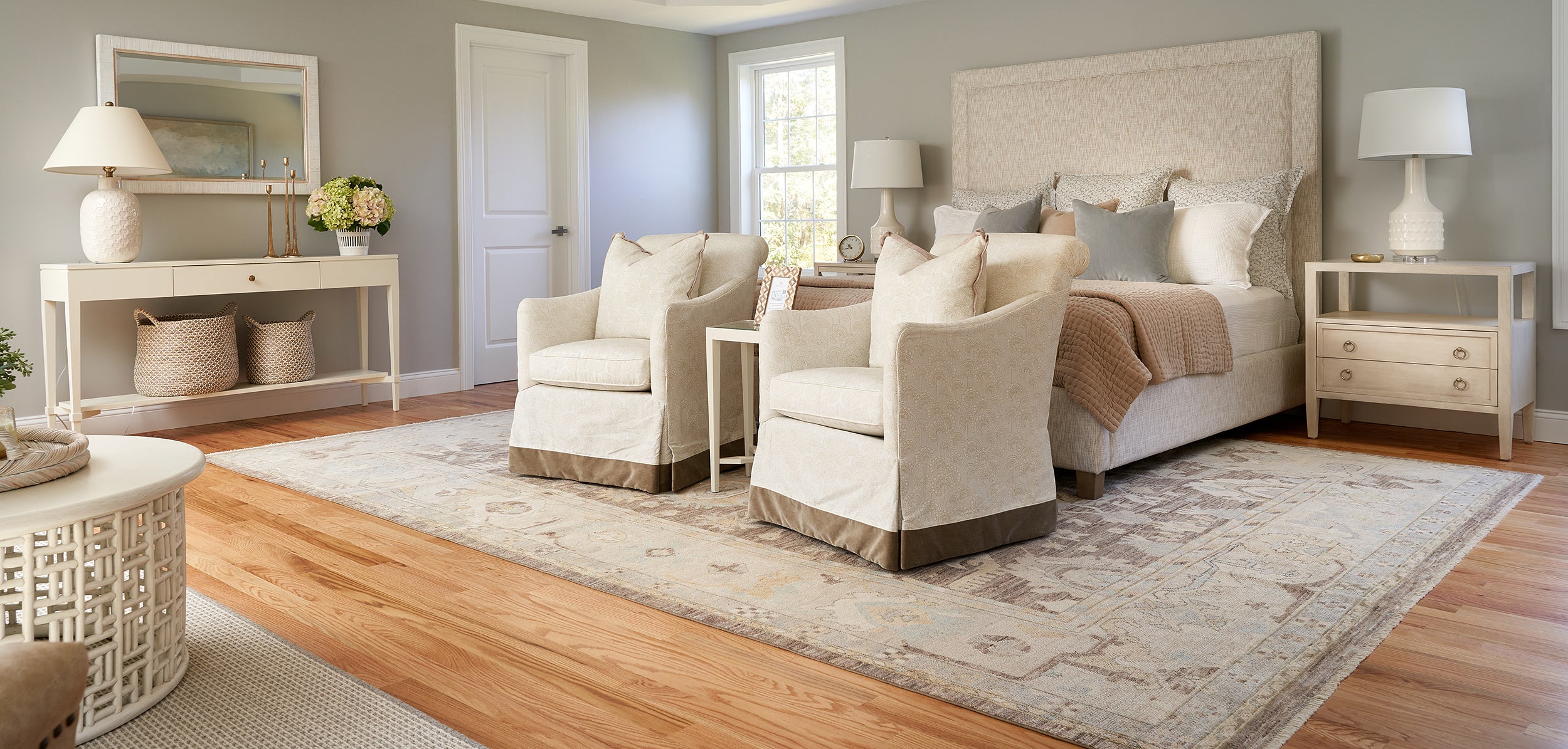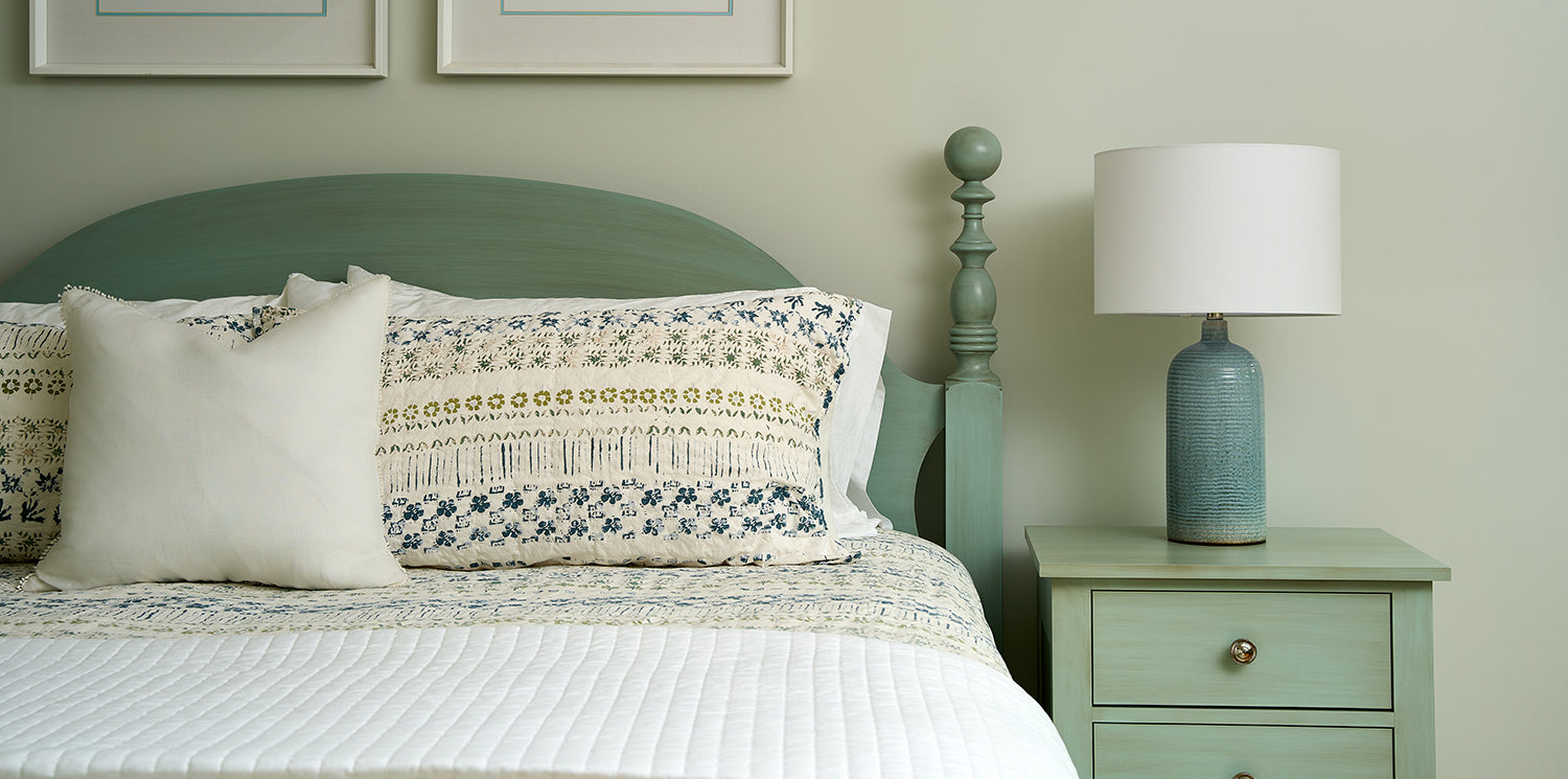 King Bed: Rustic oak in Dawn finish, upholstered headboard with tapered leg, W 81½ x D 85 x H 60
