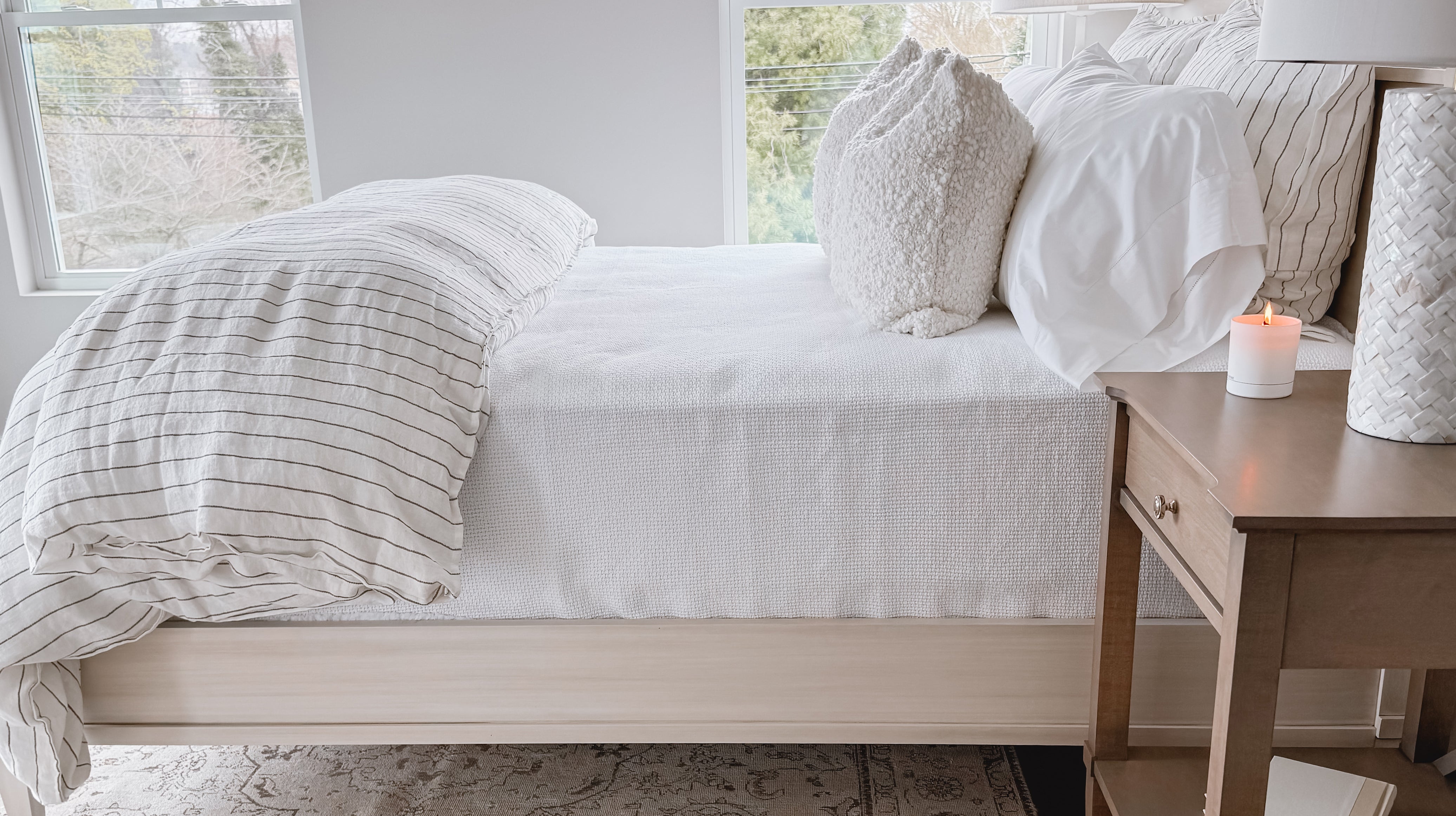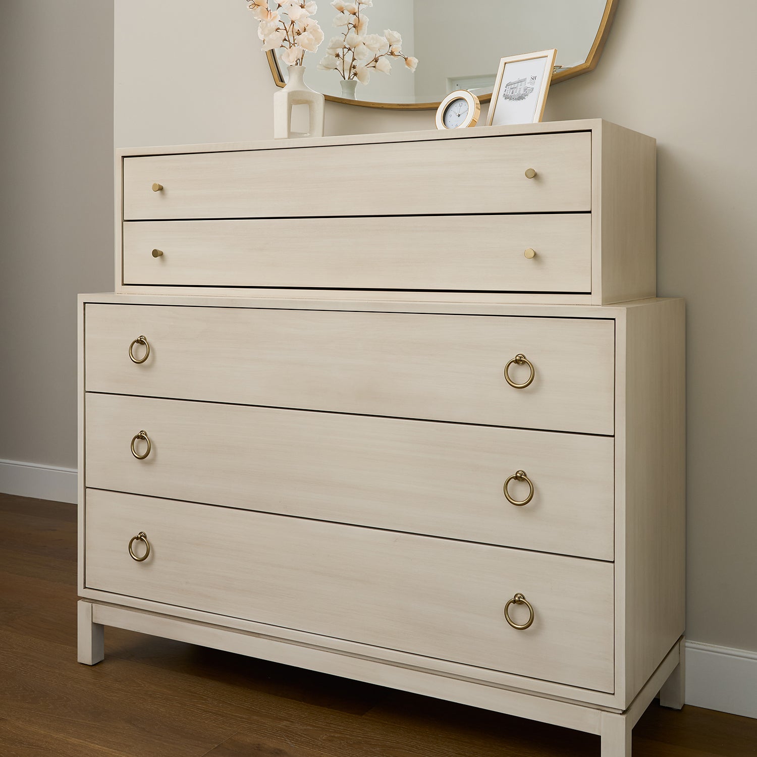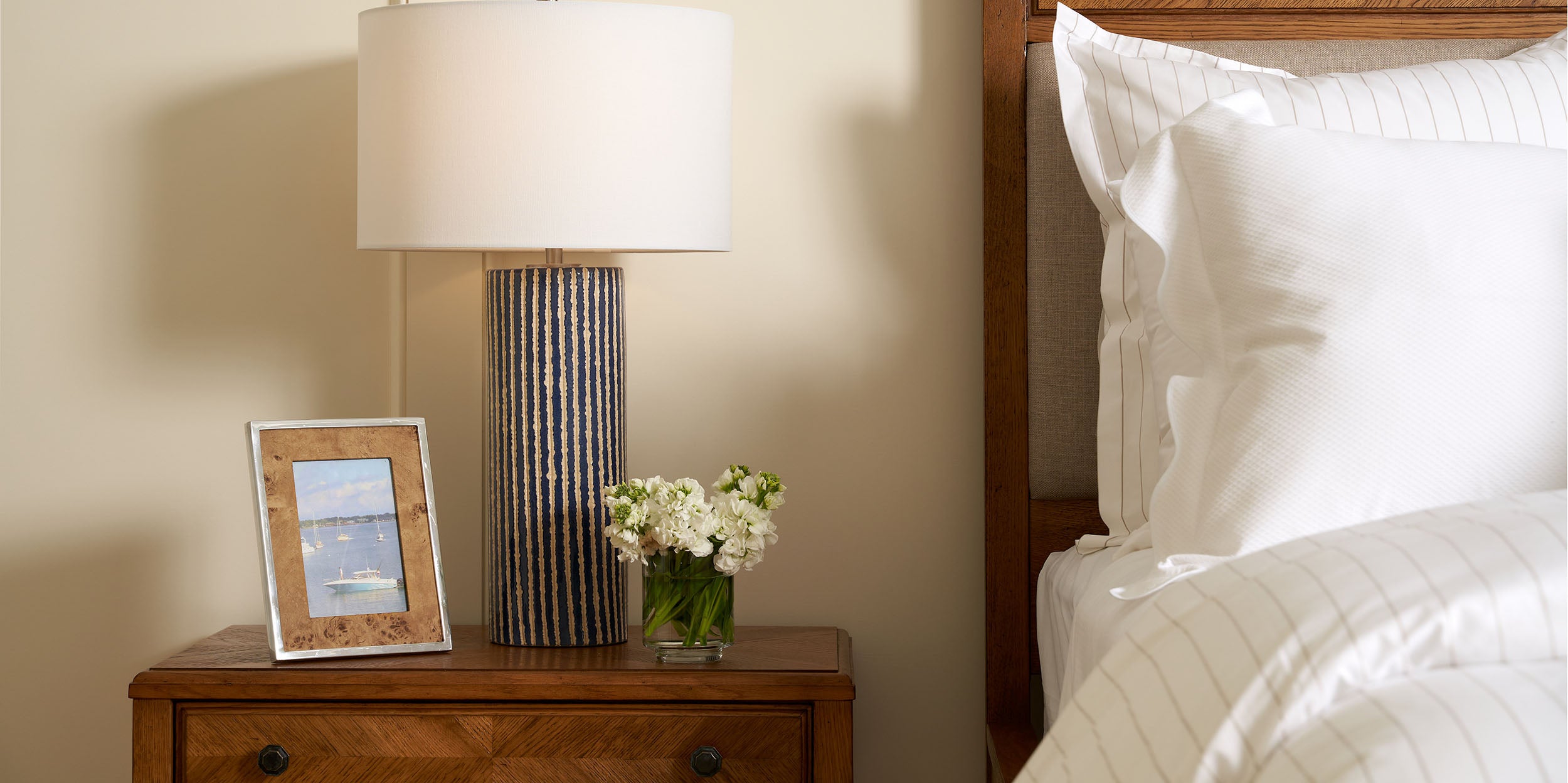King Bed: Rustic oak in Dawn finish, upholstered headboard with tapered leg, W 81½ x D 85 x H 60