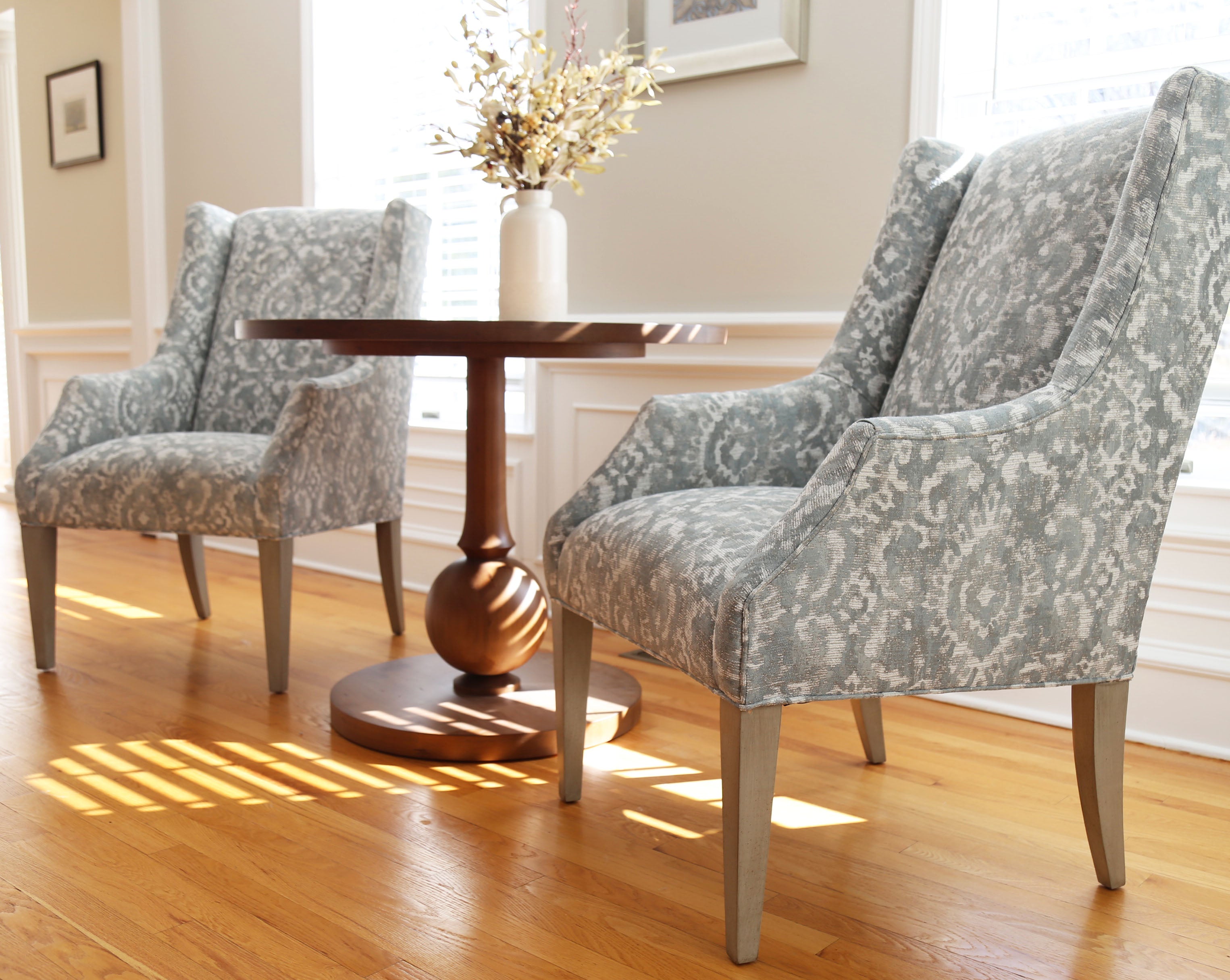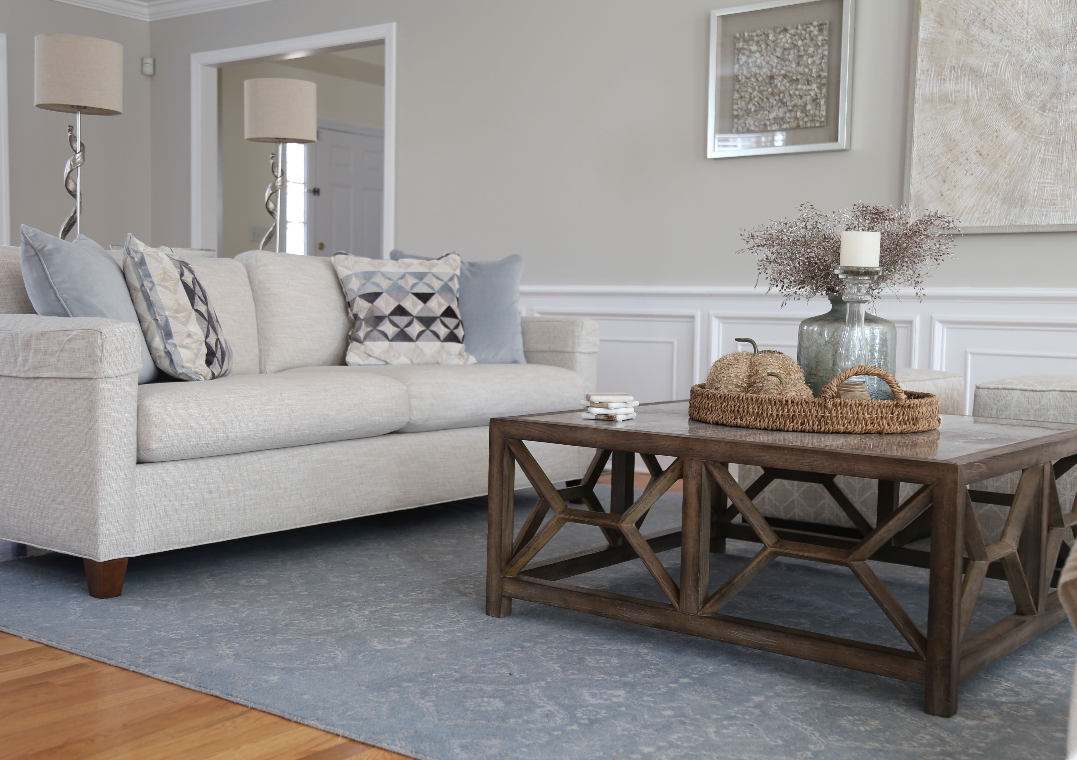 A very traditional hand knotted rug in a soft blue kept the room on the conservative side of contemporary.