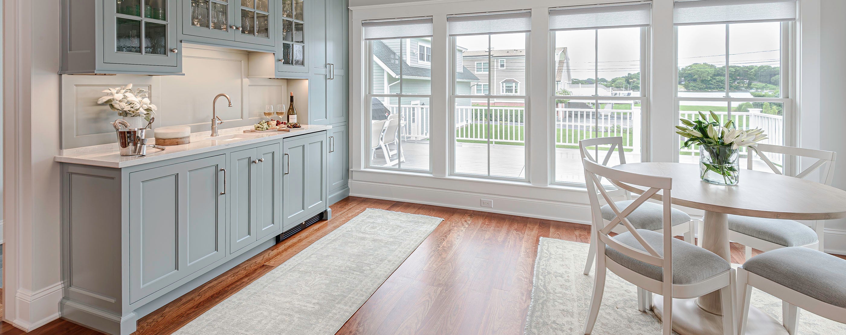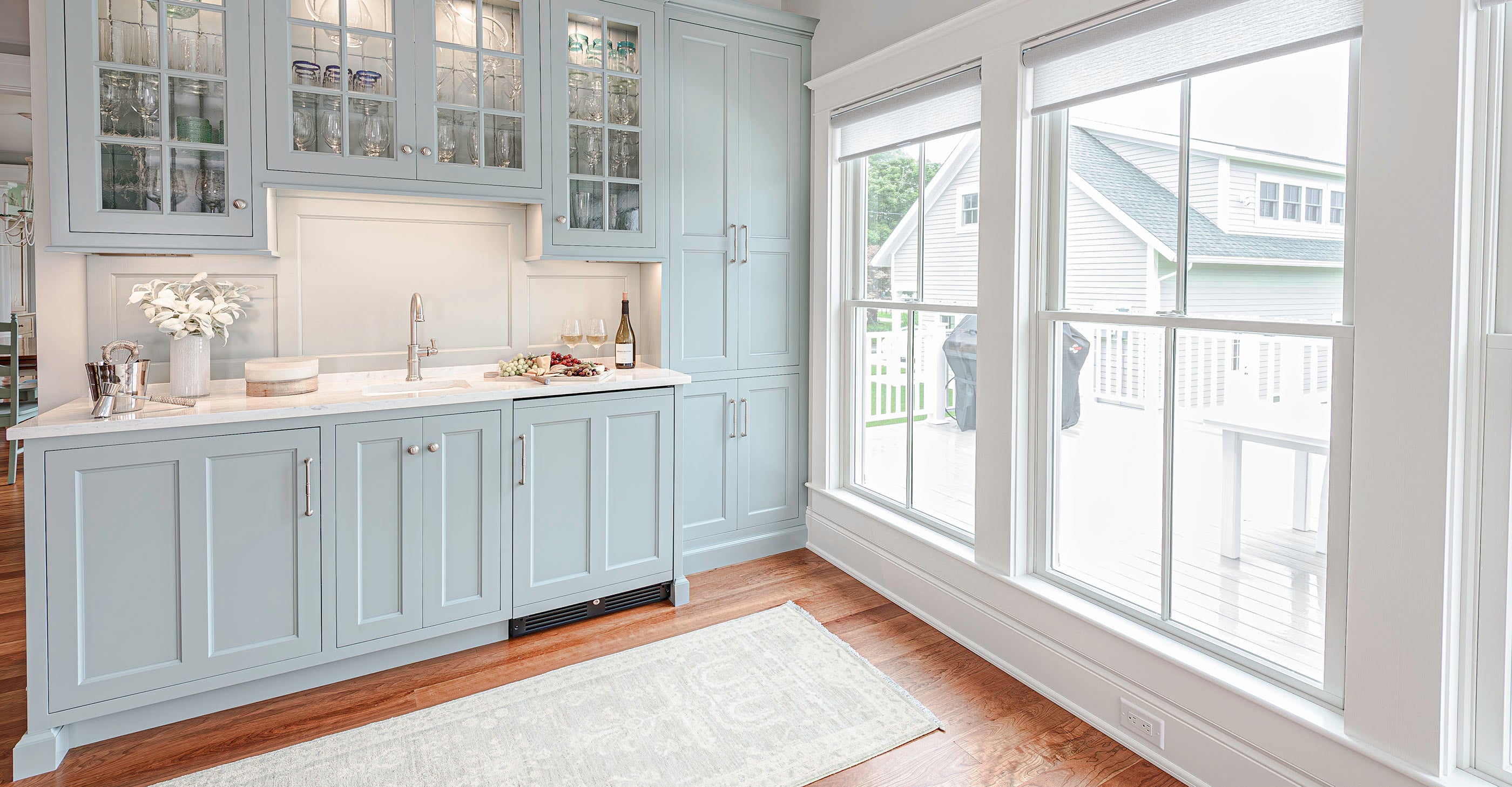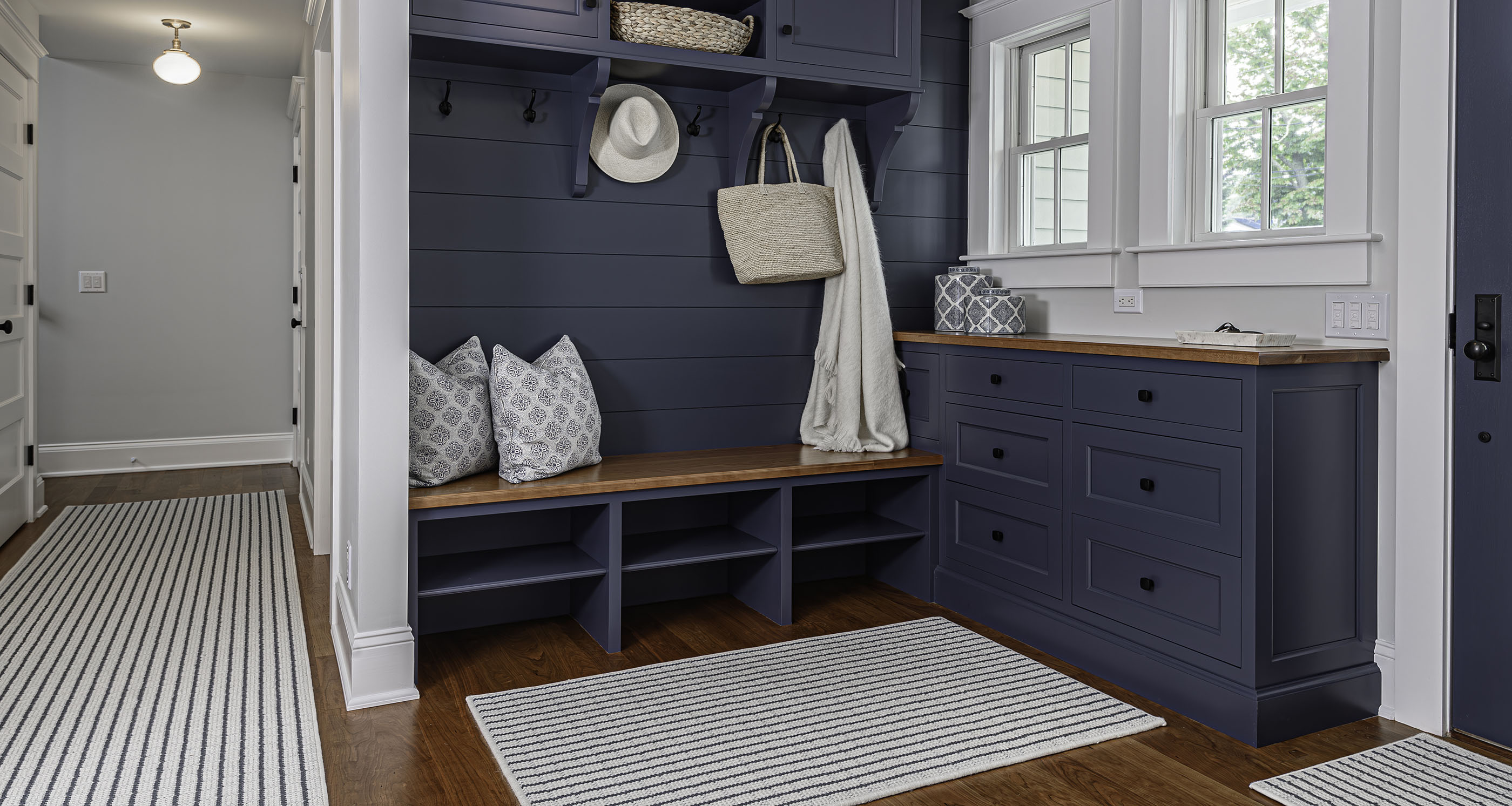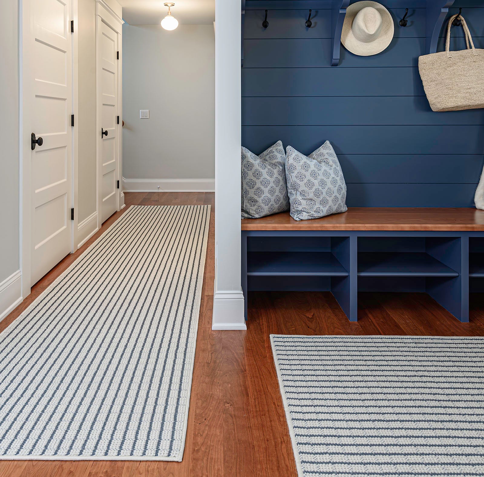 For the mudroom and hallway, Jackie helped the client design these custom area rugs and runners to fit the space perfectly. A blue stripe adds just the right nautical touch to the space.
