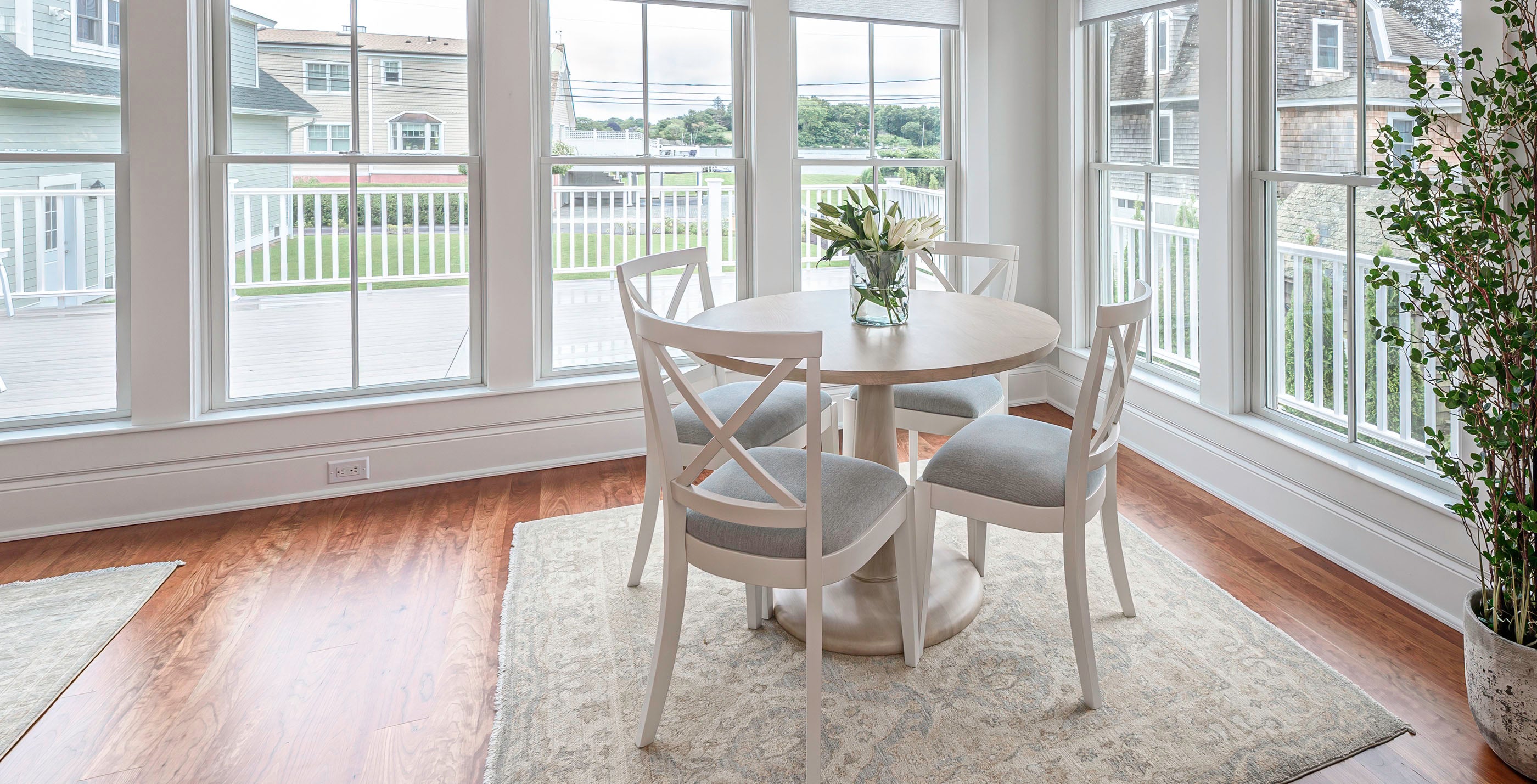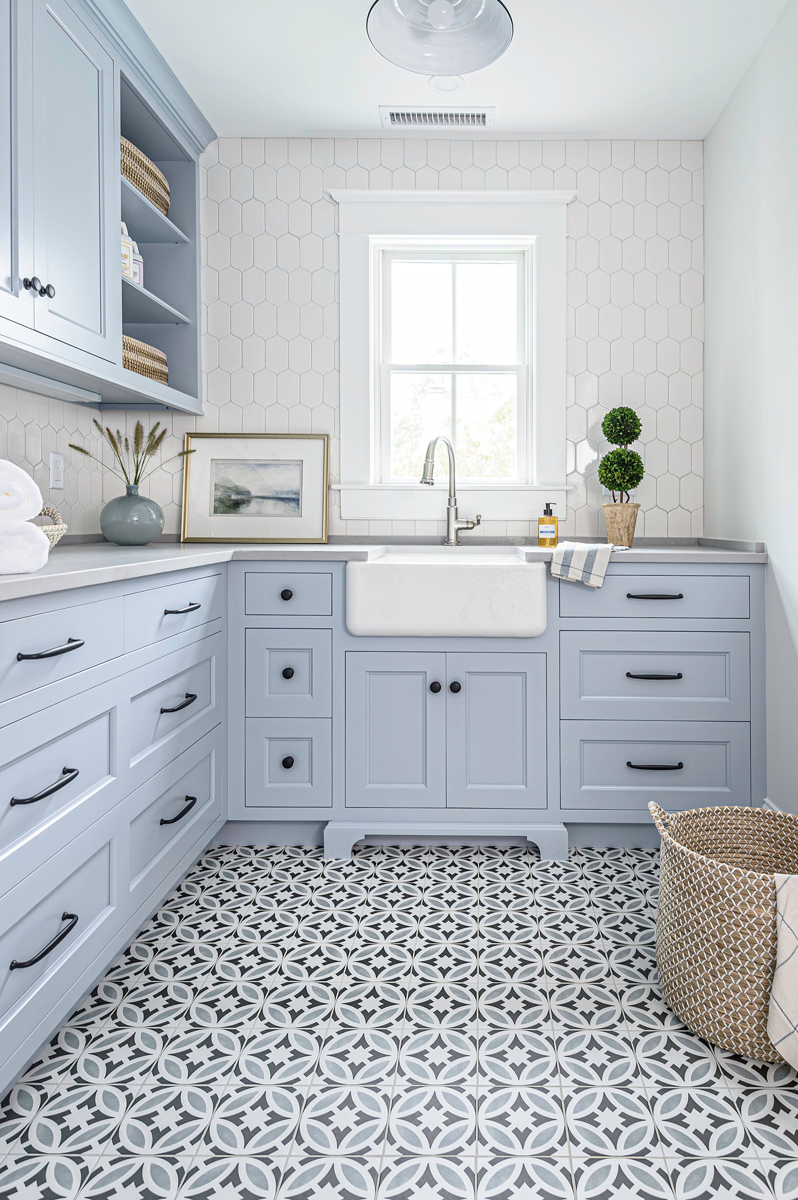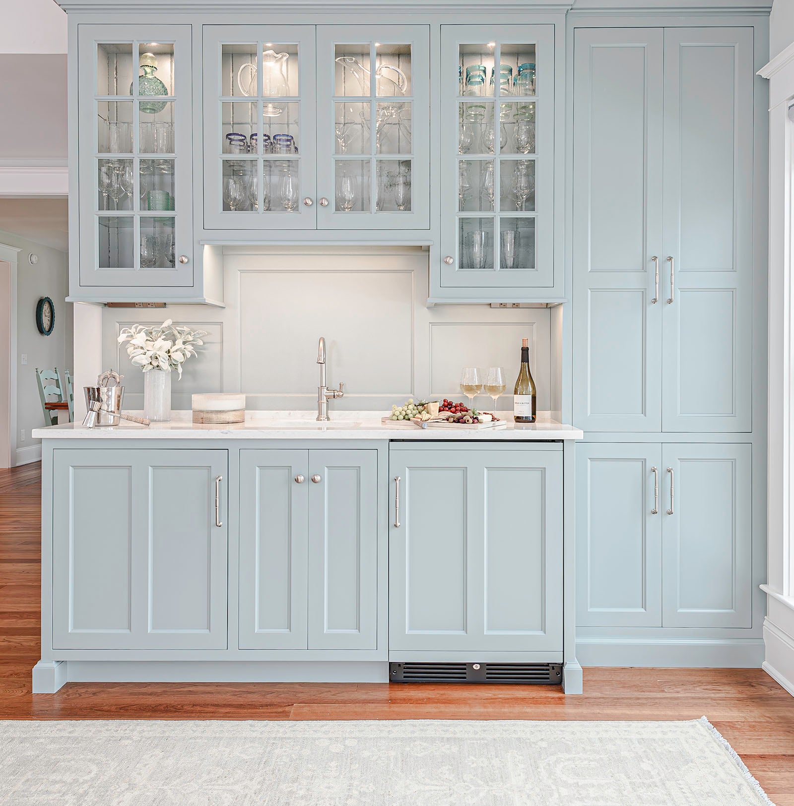 For the mudroom and hallway, Jackie helped the client design these custom area rugs and runners to fit the space perfectly. A blue stripe adds just the right nautical touch to the space.