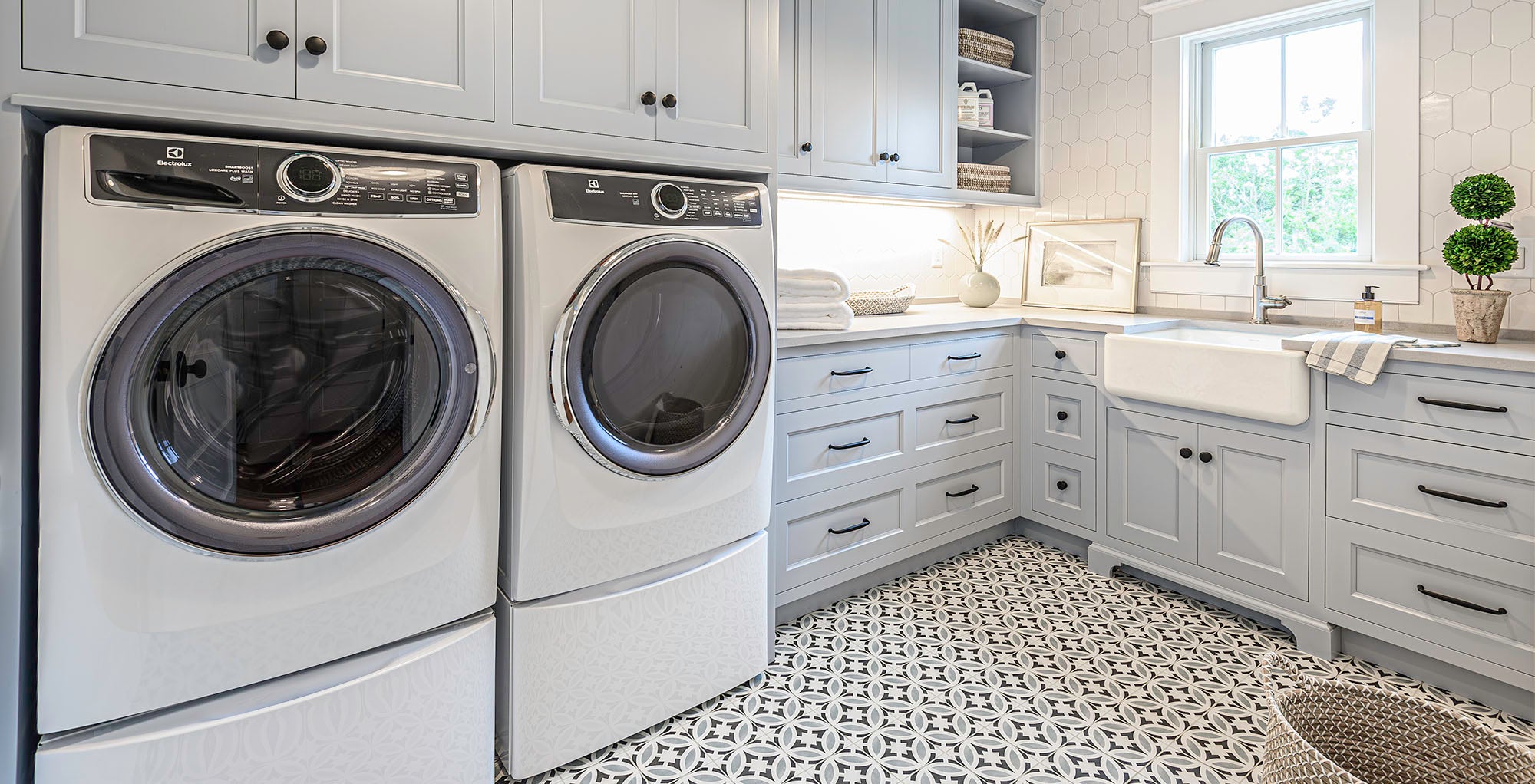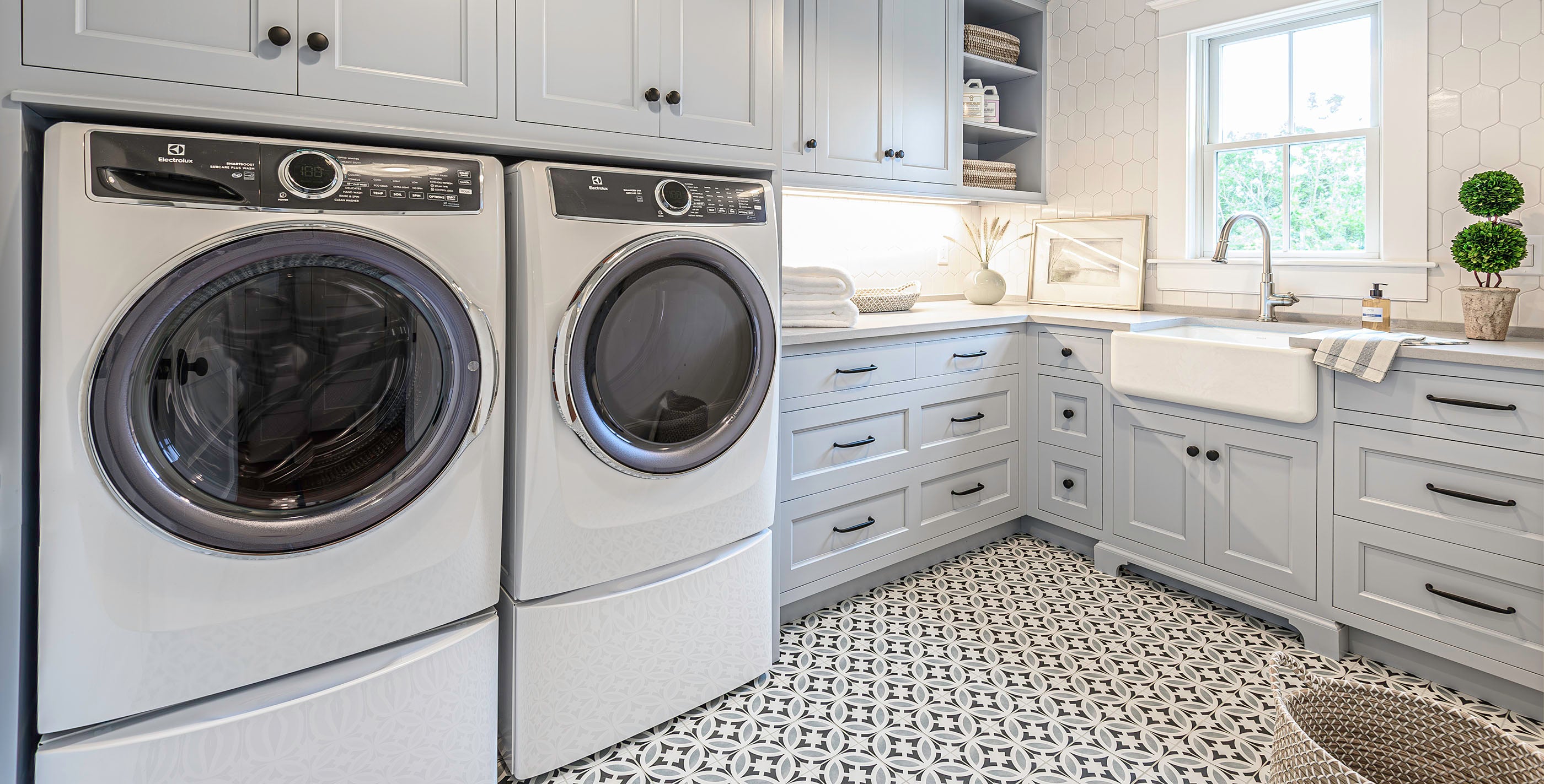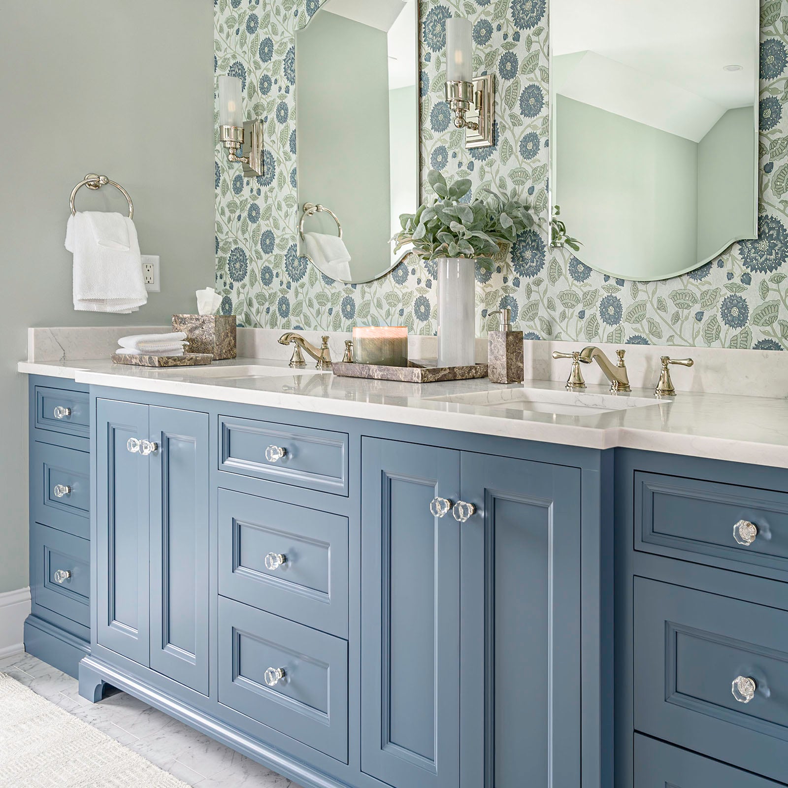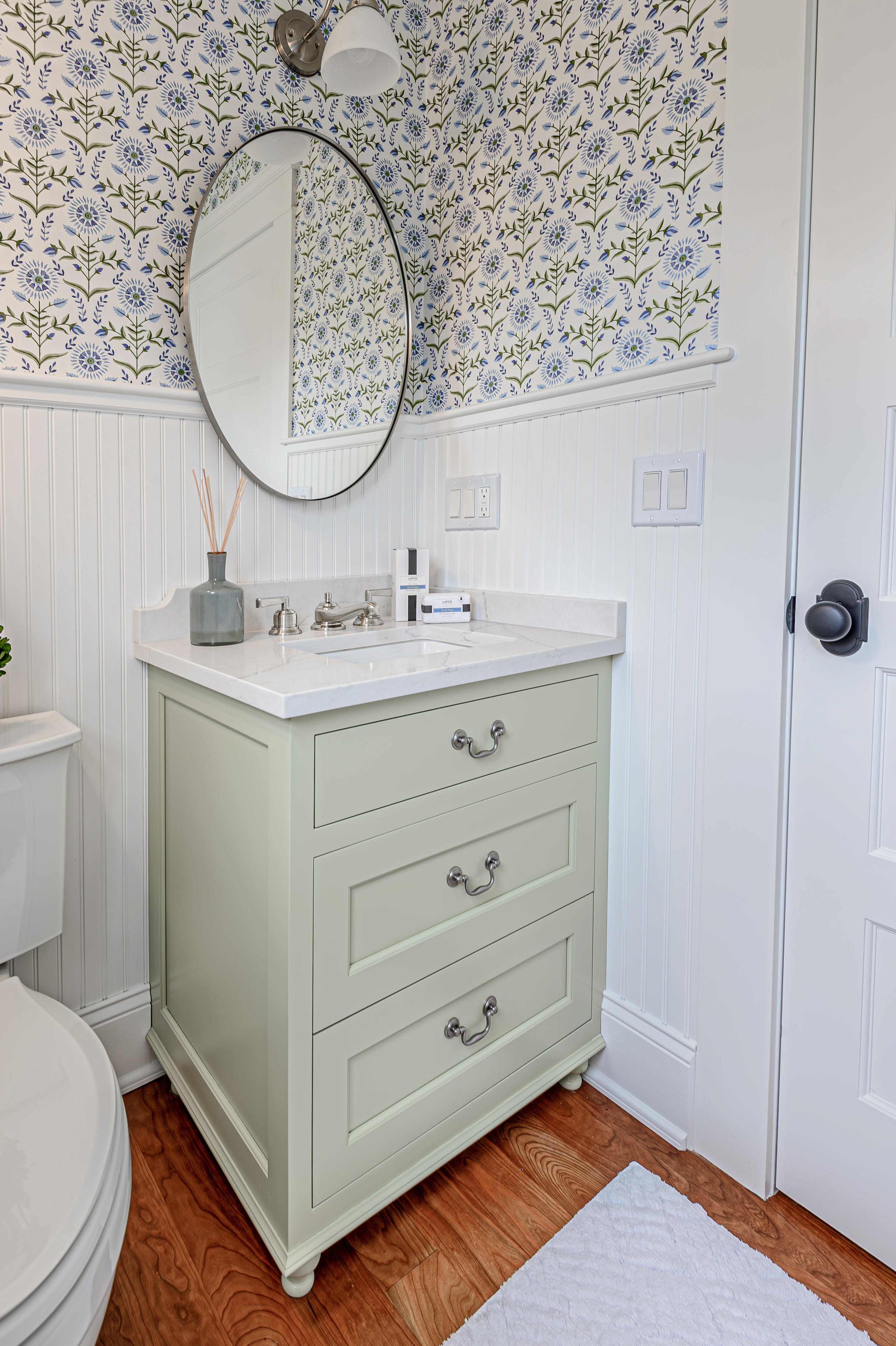 For the mudroom and hallway, Jackie helped the client design these custom area rugs and runners to fit the space perfectly. A blue stripe adds just the right nautical touch to the space.
