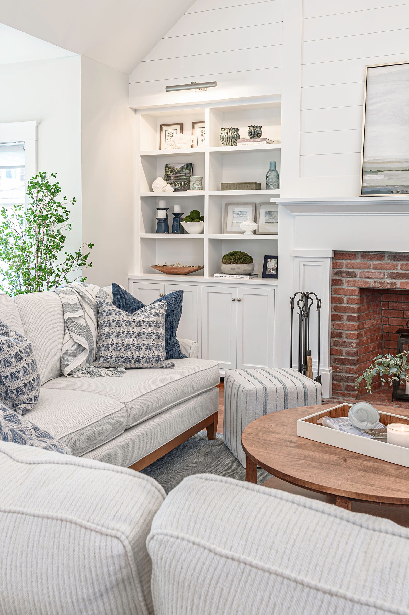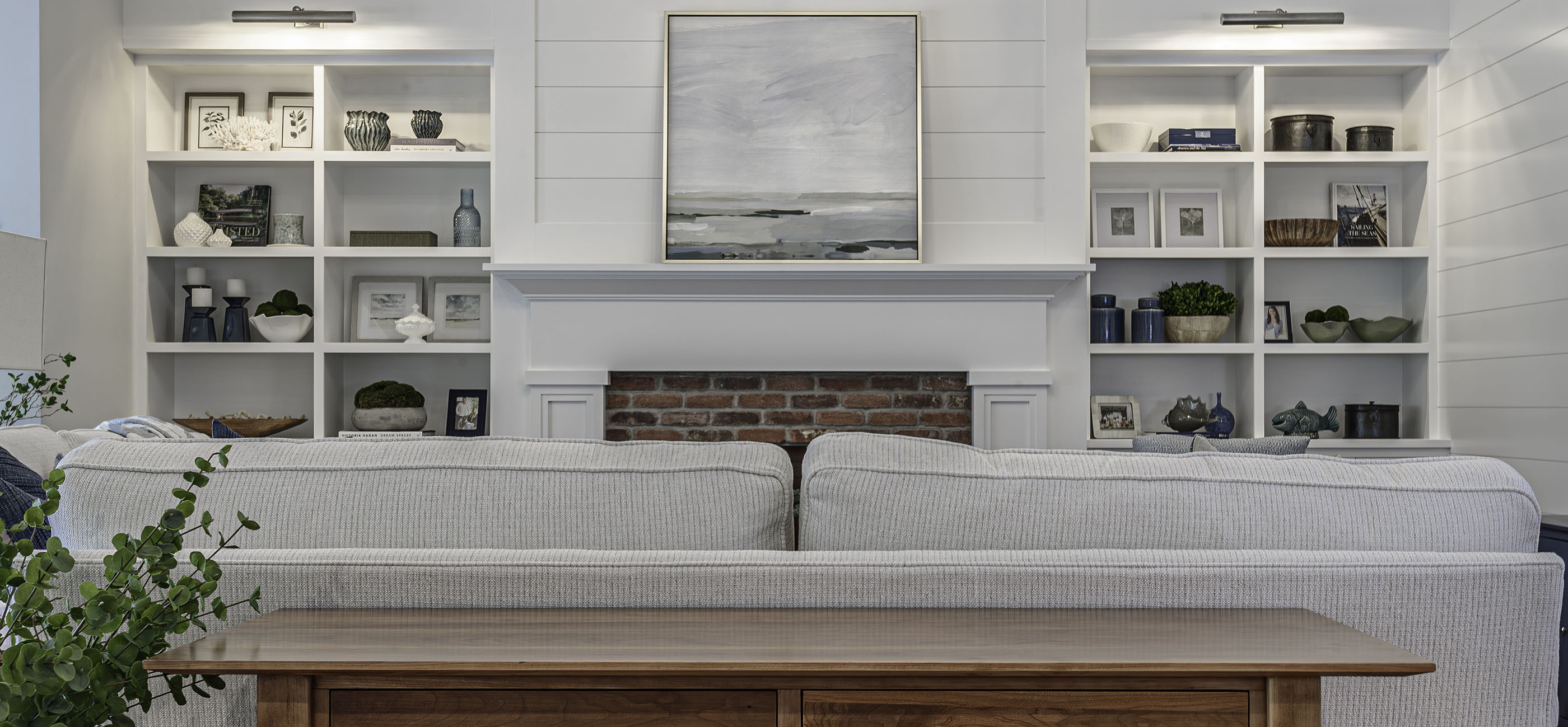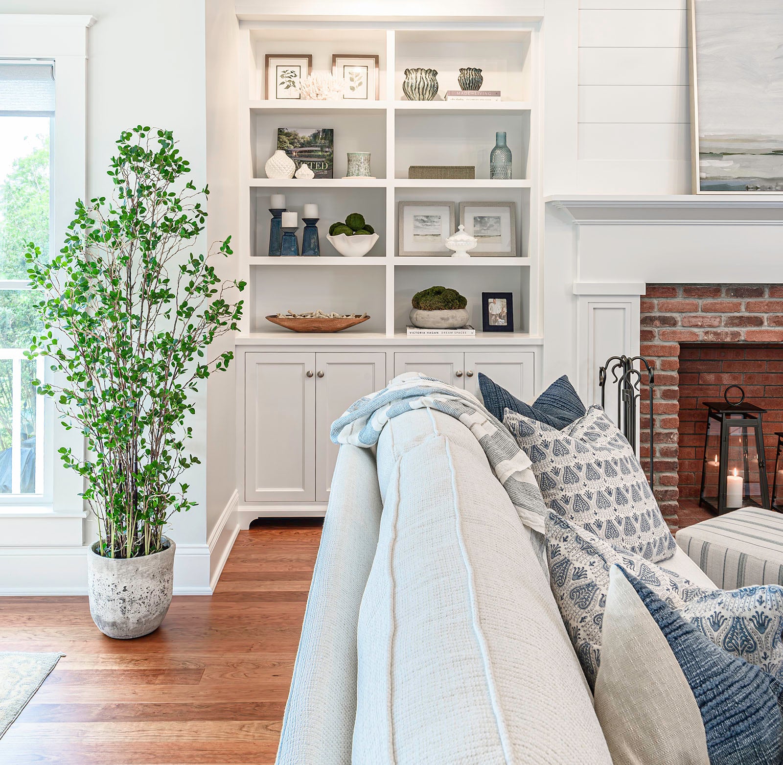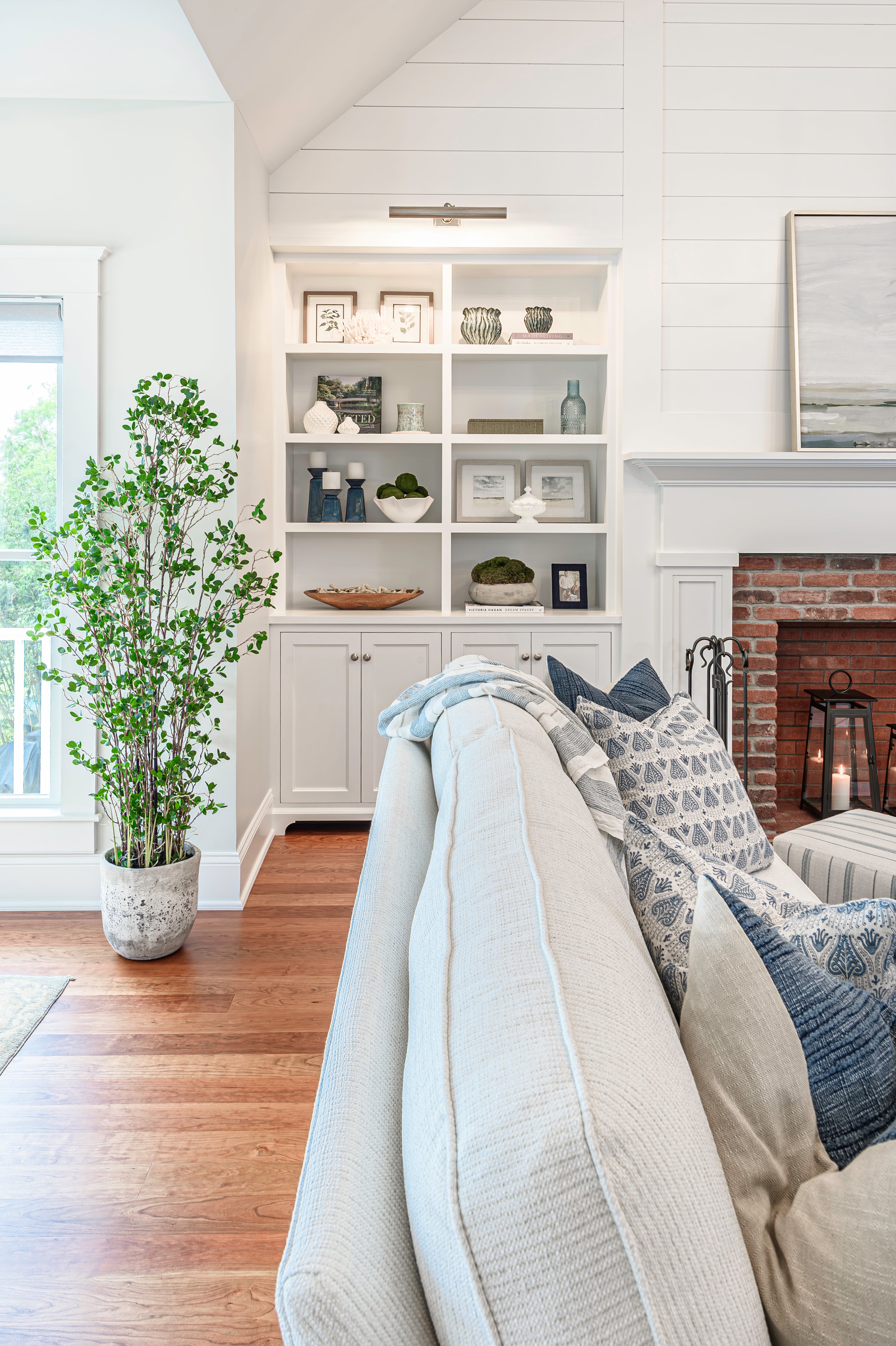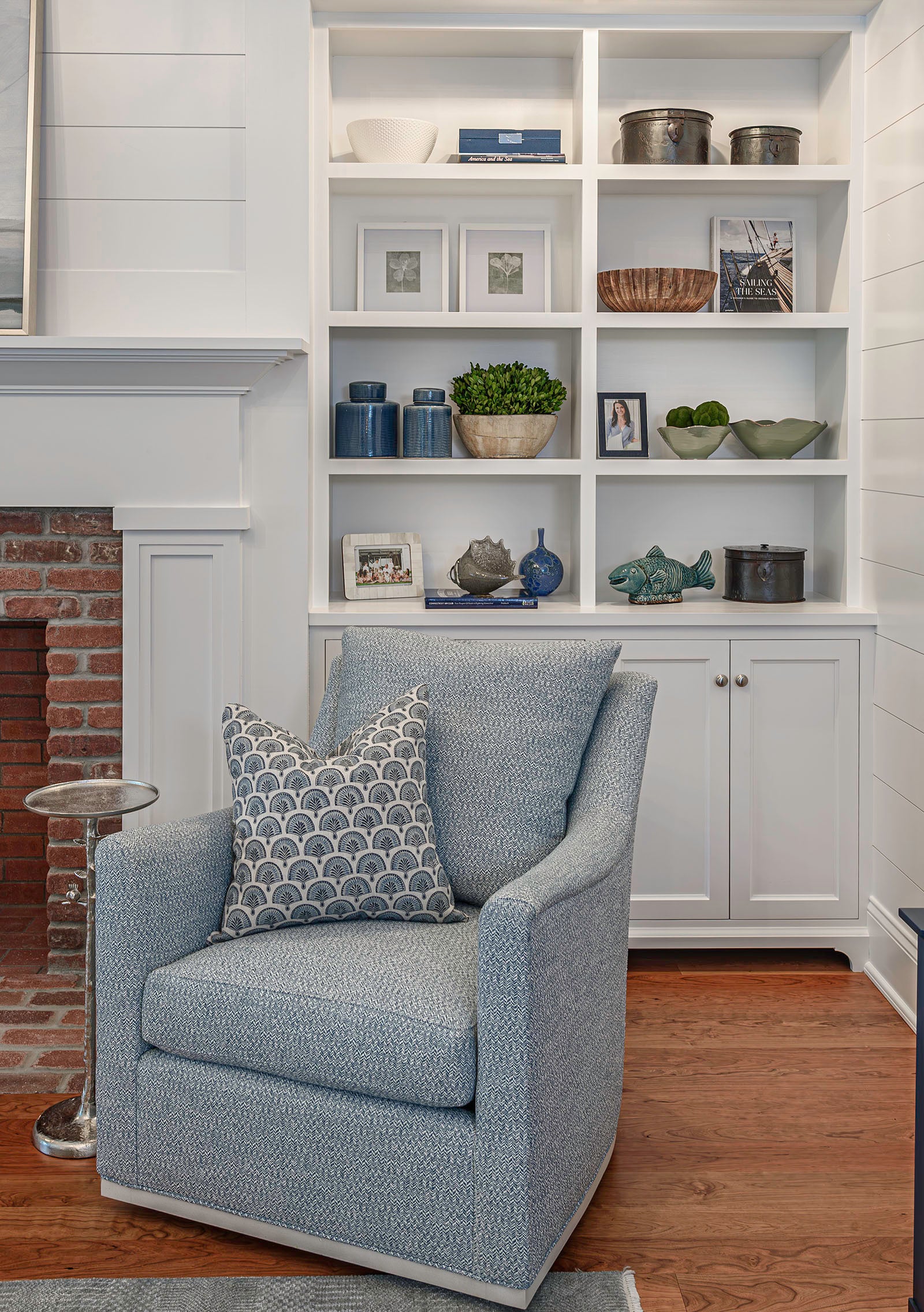 Designer Jackie has a knack for making built-ins shine their brightest. Using a thoughtful mix of accessories, artwork and some sentimental pieces from the homeowner, Jackie accentuated the beauty of the architecture with pops of color and texture without overdoing it.
