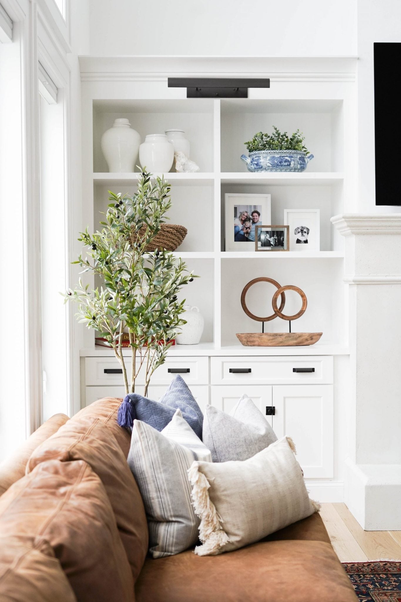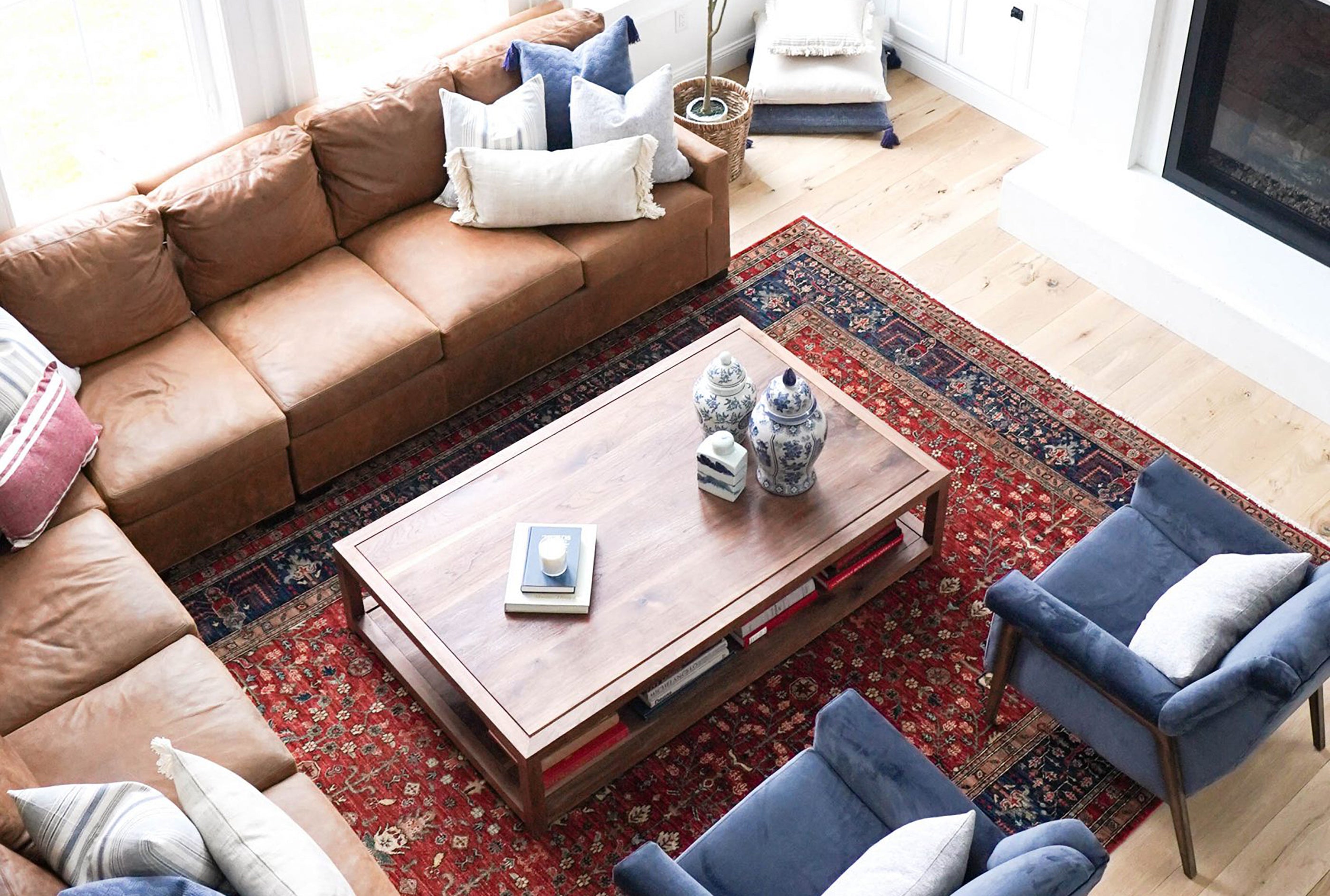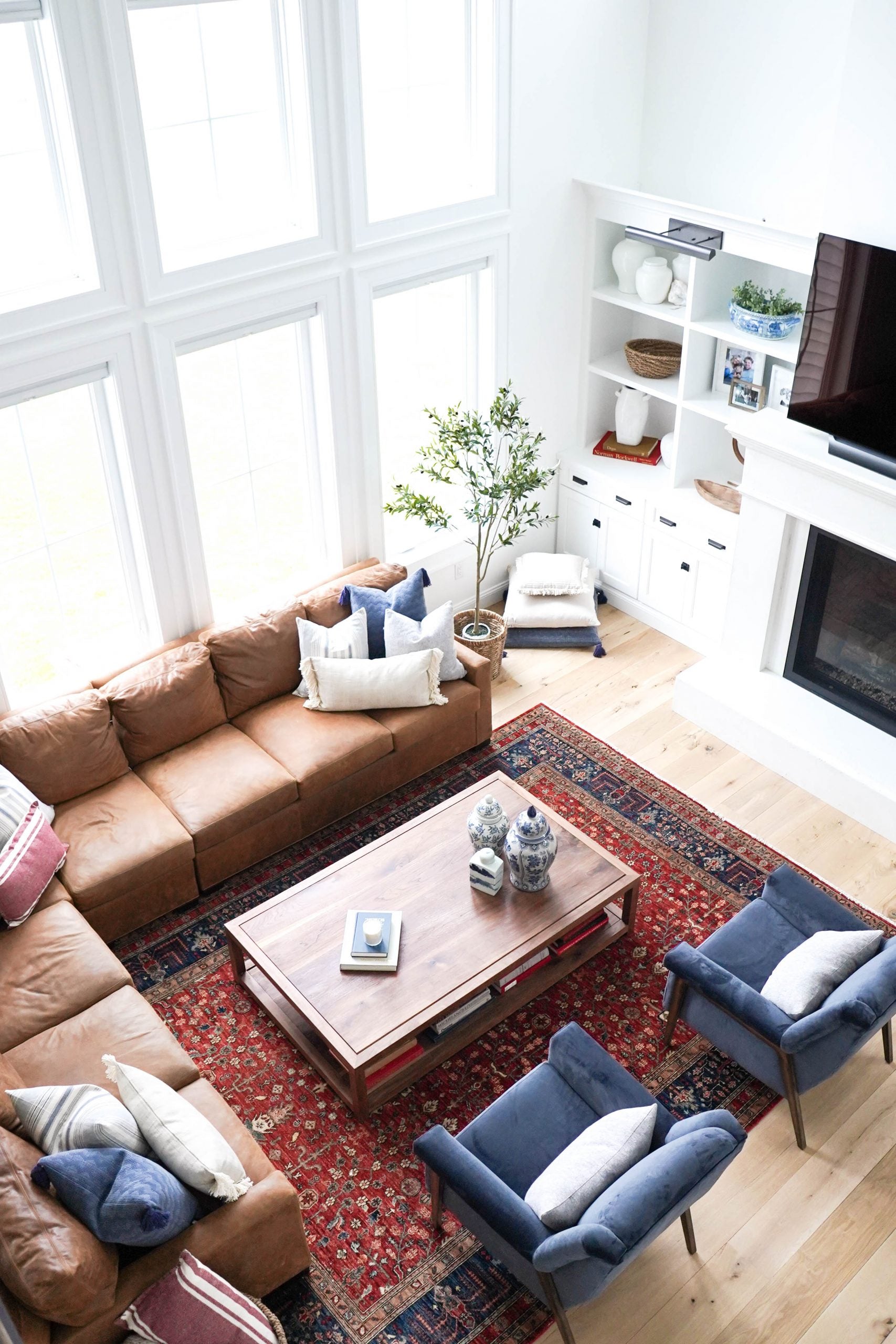 This great room design may have started with a large hand knotted rug and beautiful leather sectional, but it ended with all the perfect finishing touches with accessories in the client's color story.