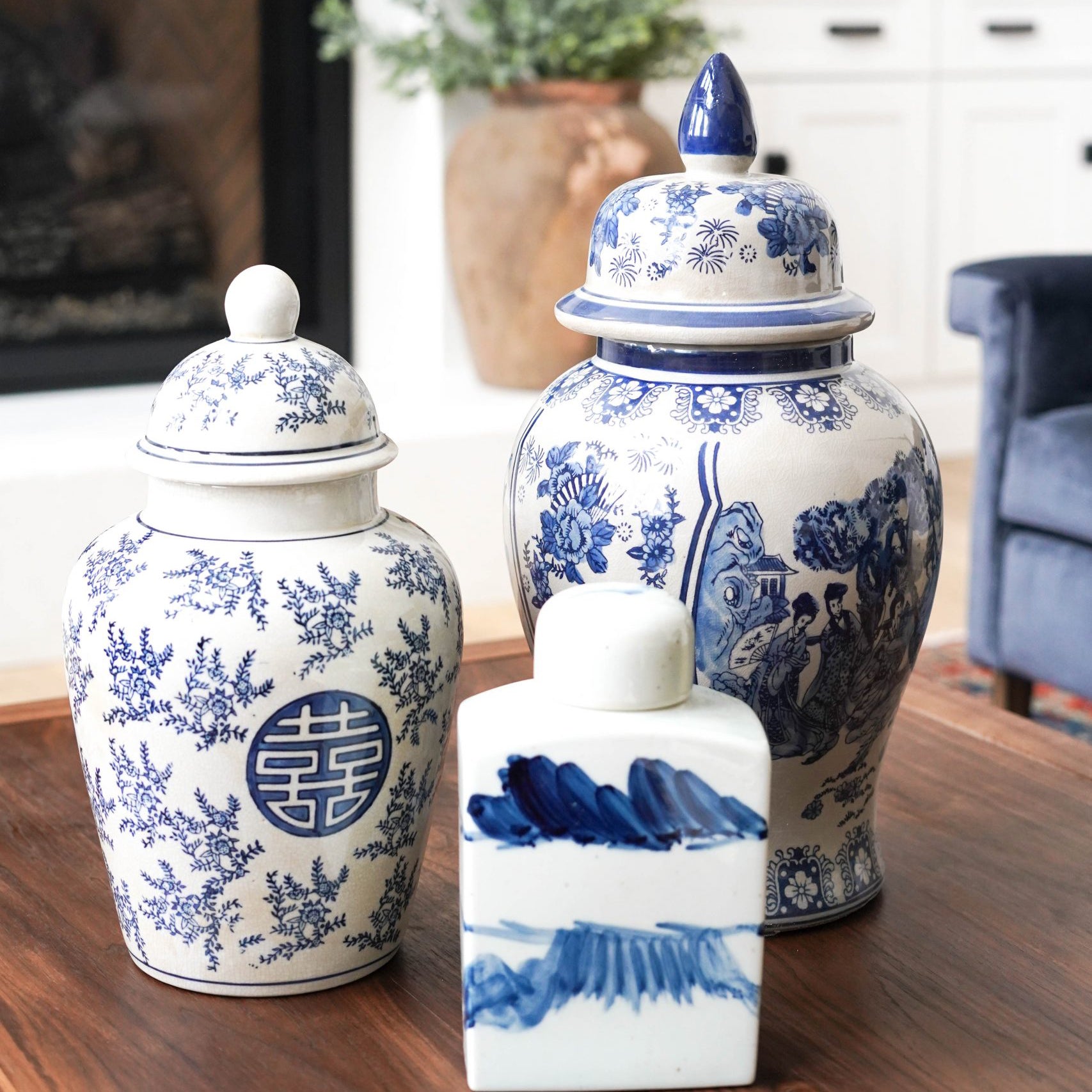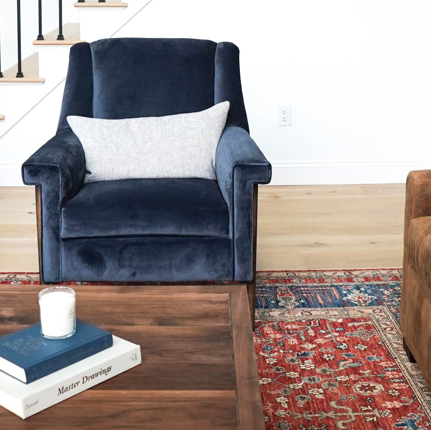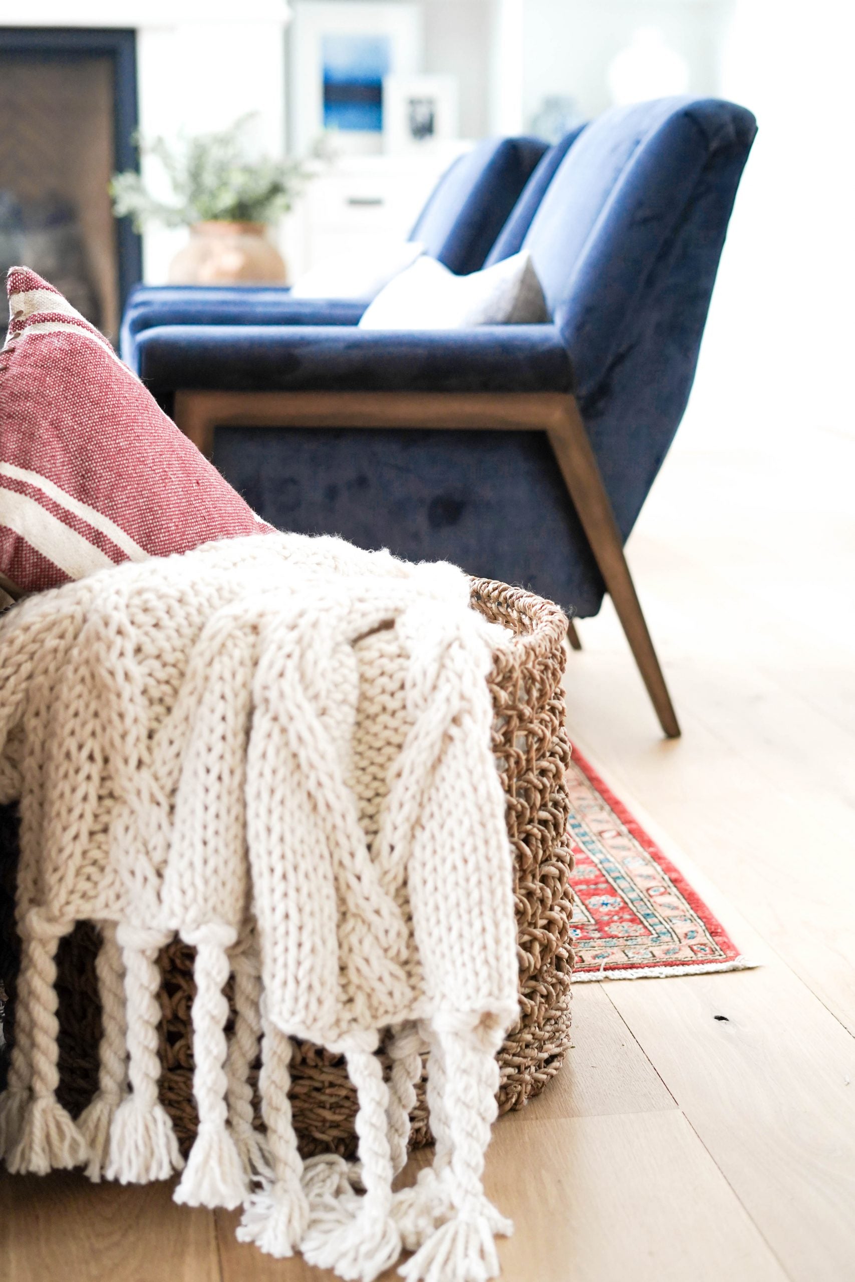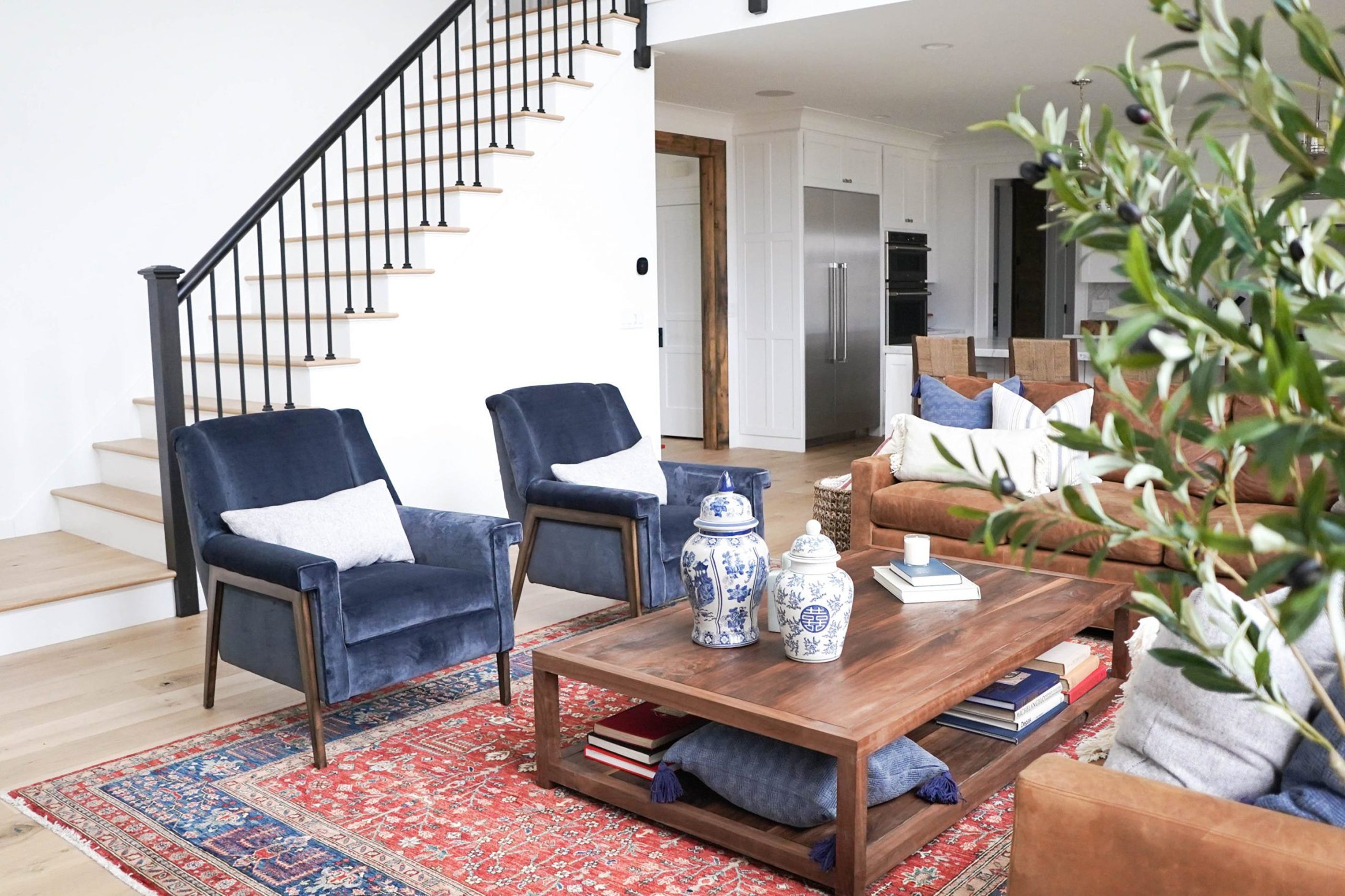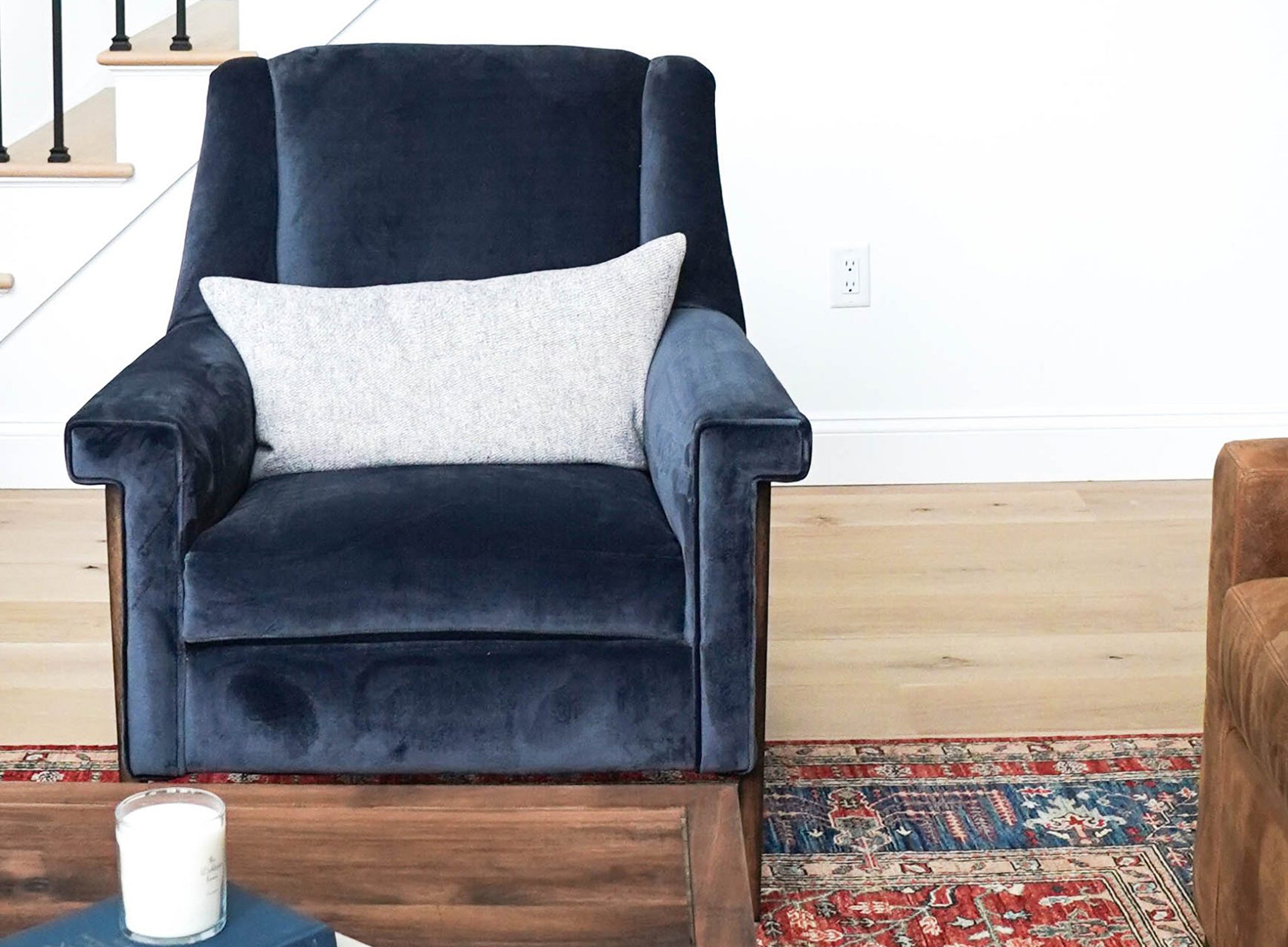 A pair of eye-catching velour chairs in the most stunning blue immediately command the room's attention.