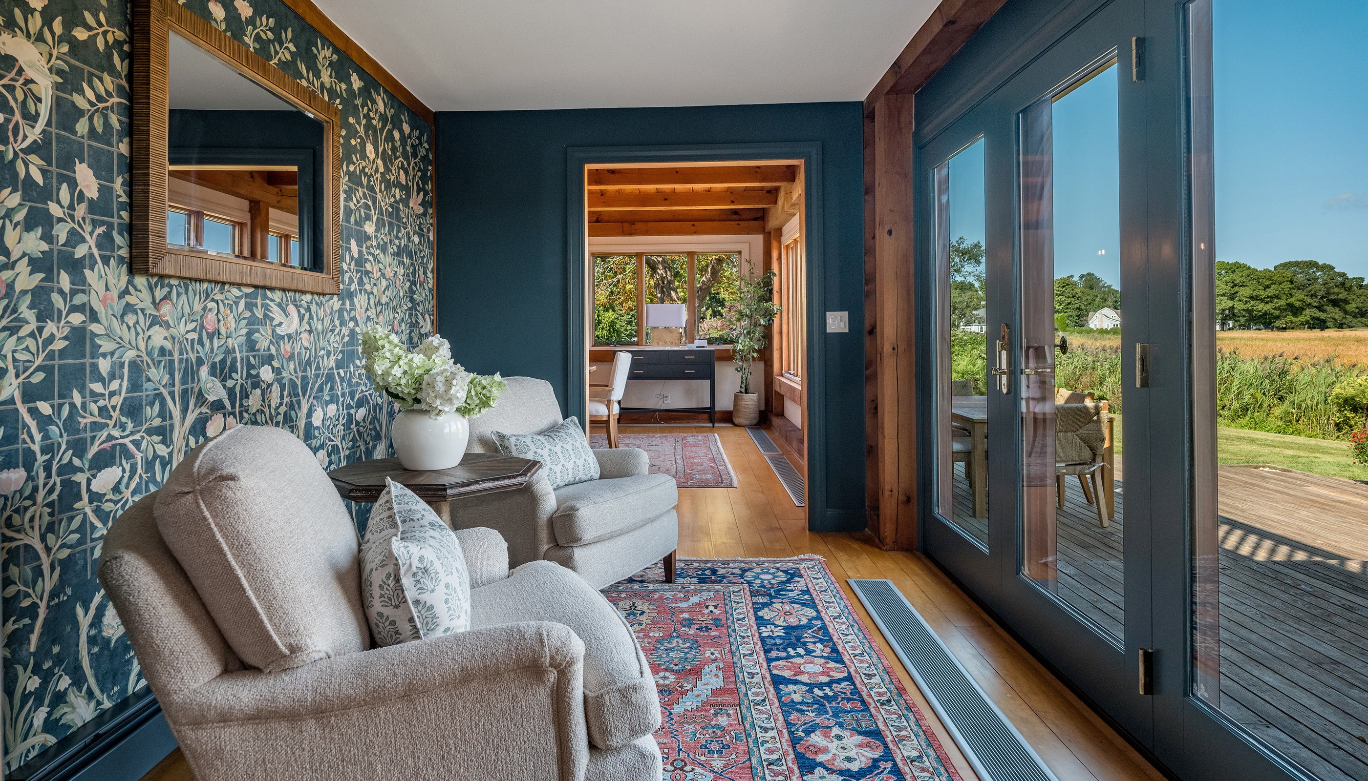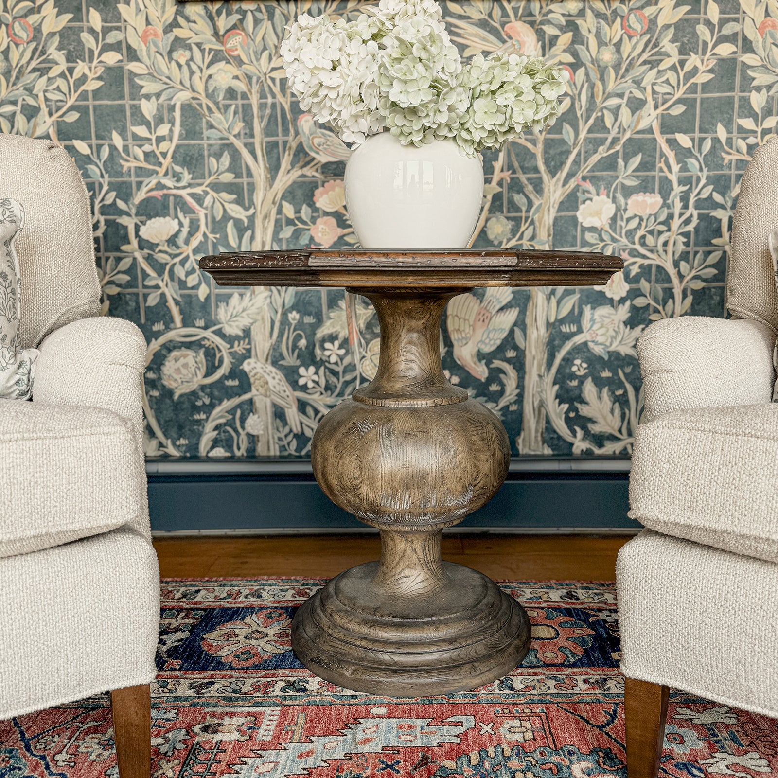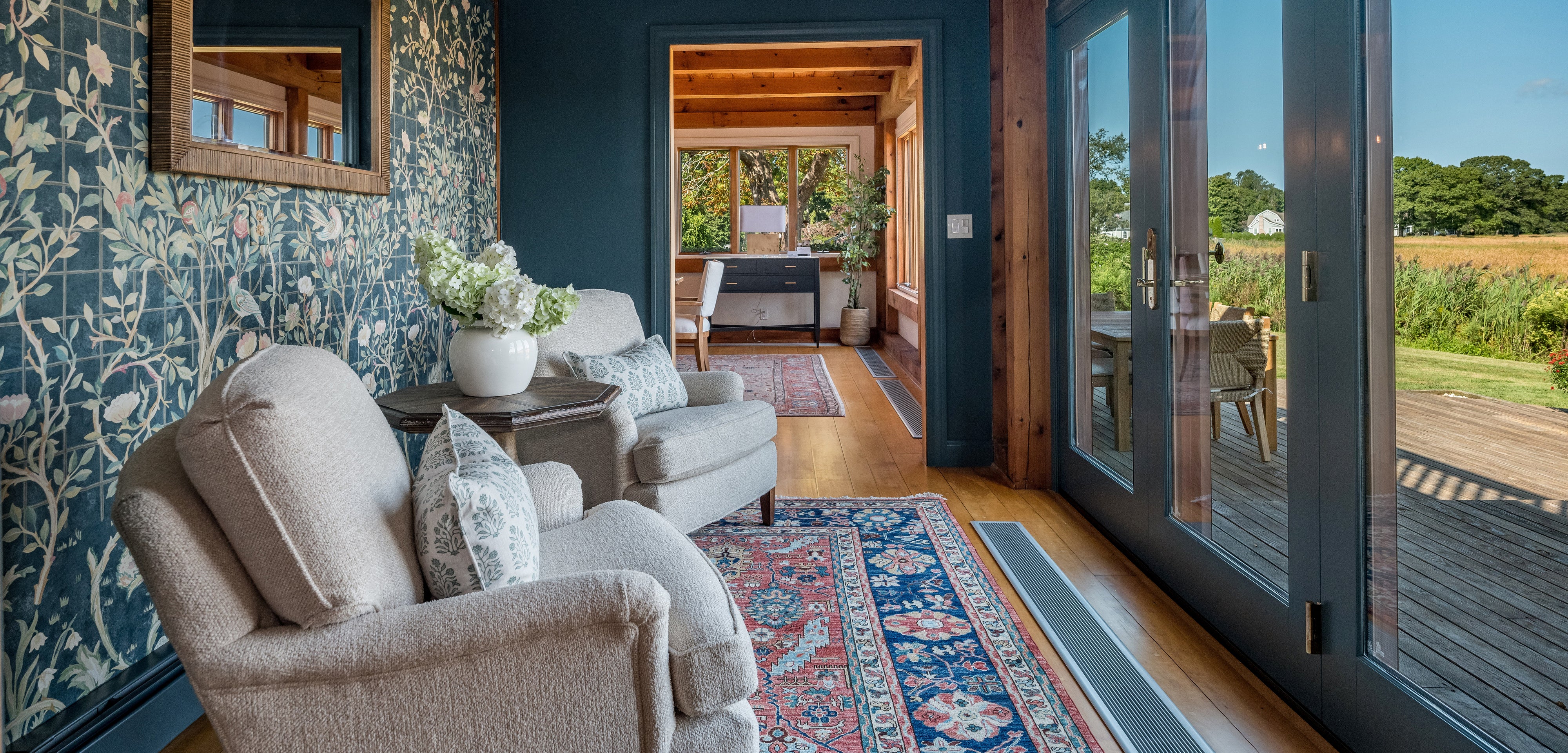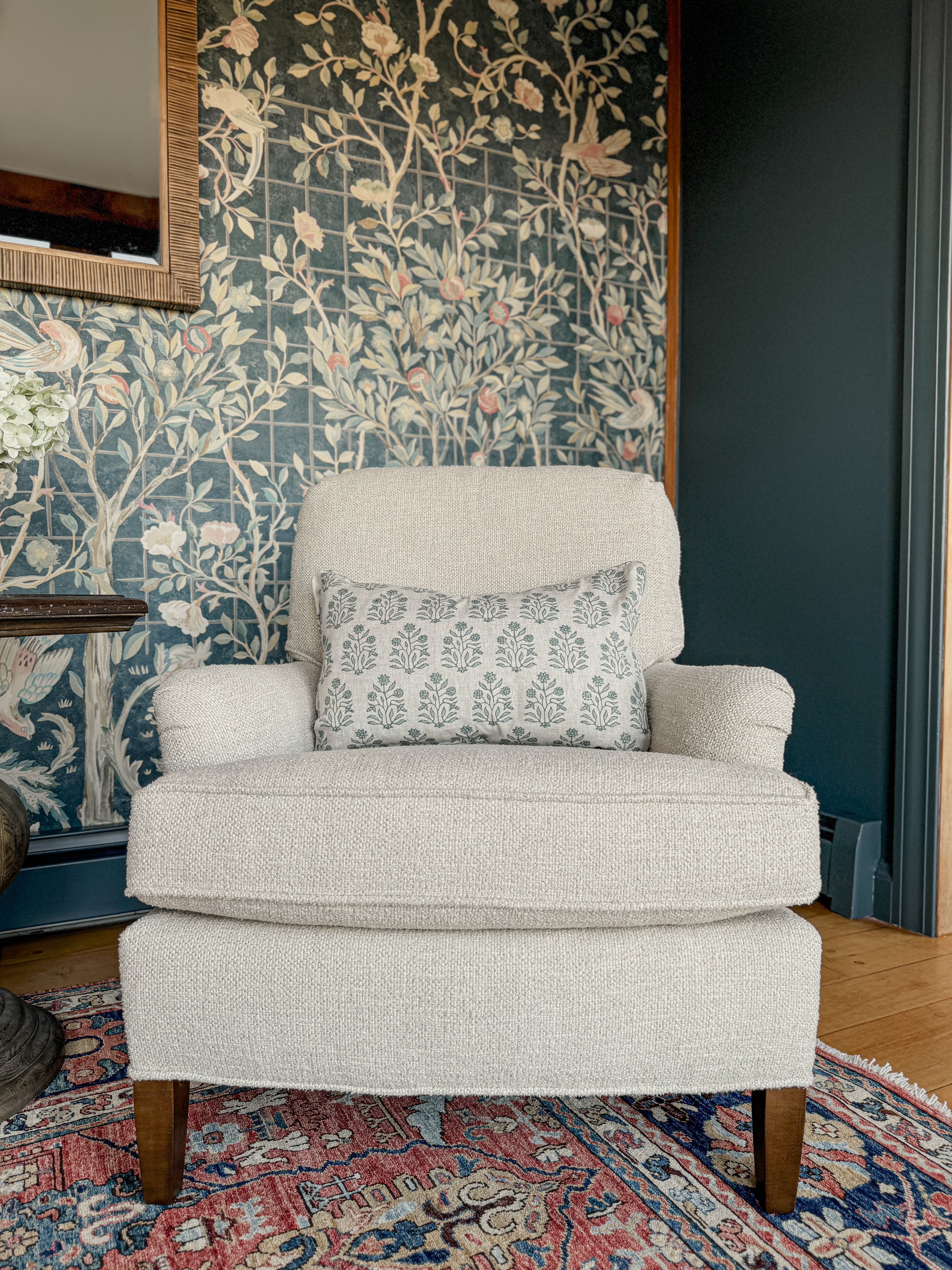 Designer Ashley didn't shy away from complementing the bold colors and patterns in the existing wallpaper with a hand-knotted Serapi in equally dramatic hues. She grounded the look with a pair of classic, English arm accent chairs in a neutral fabric.