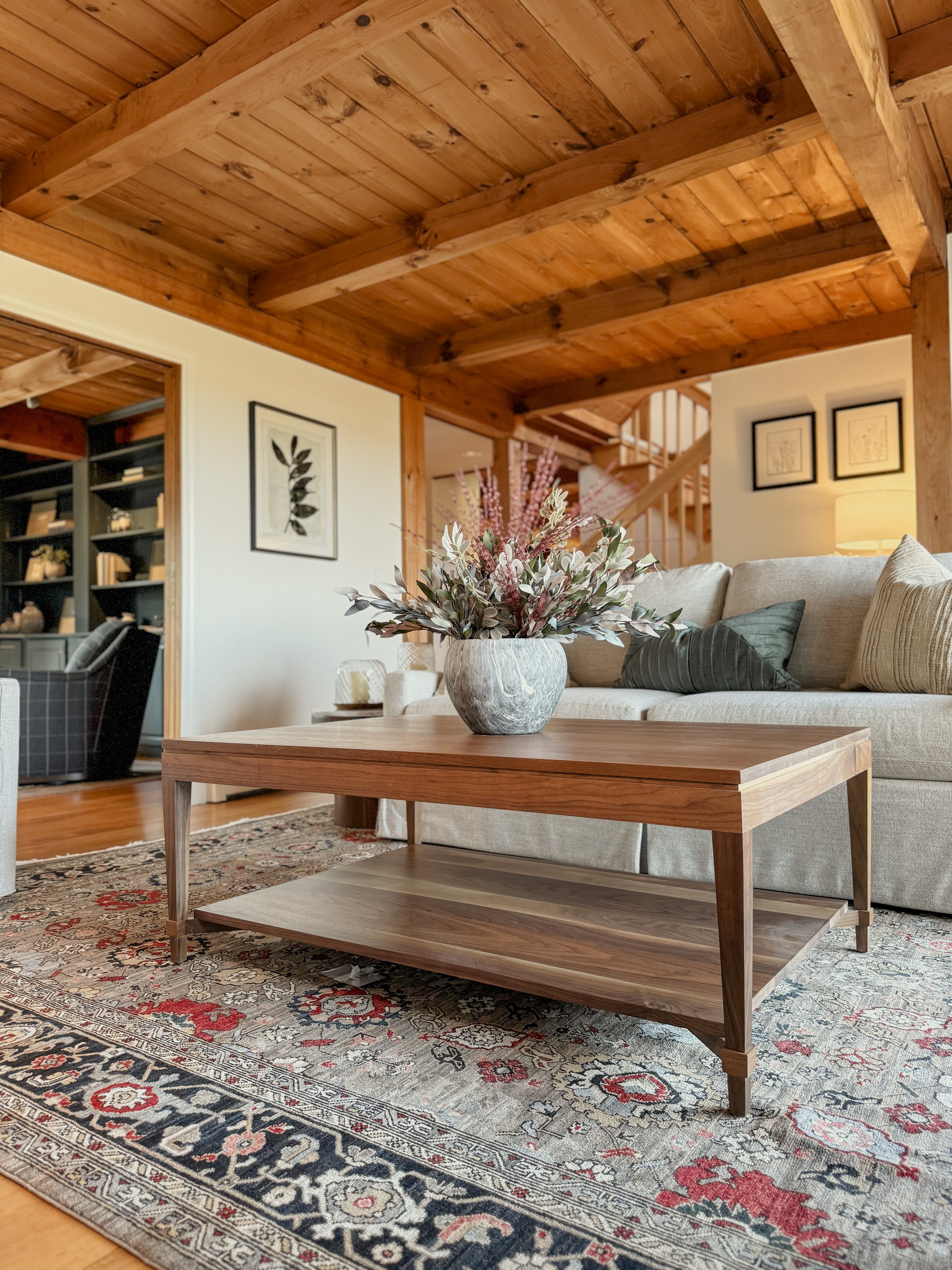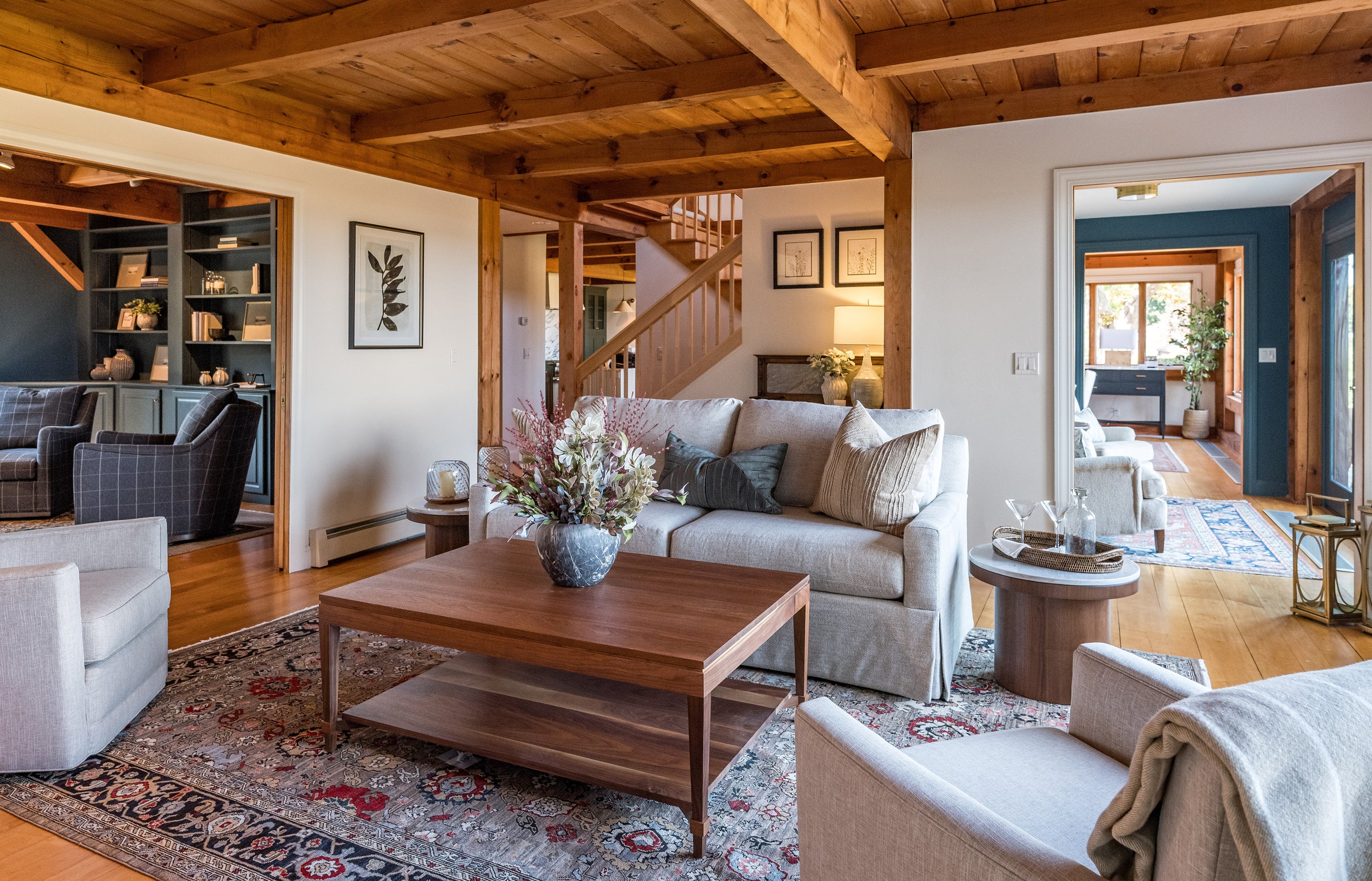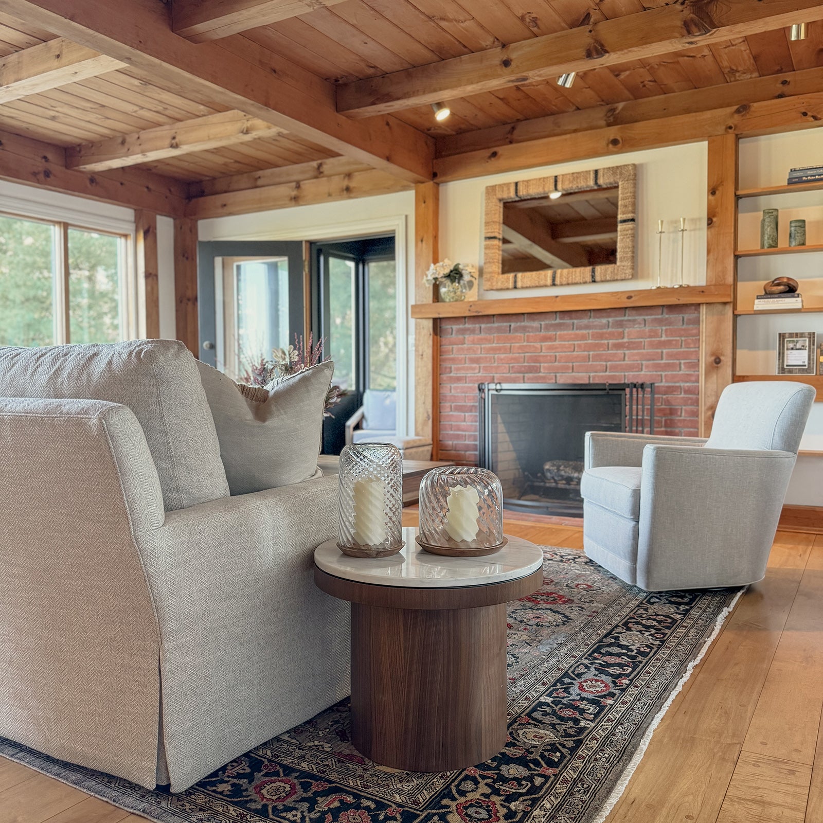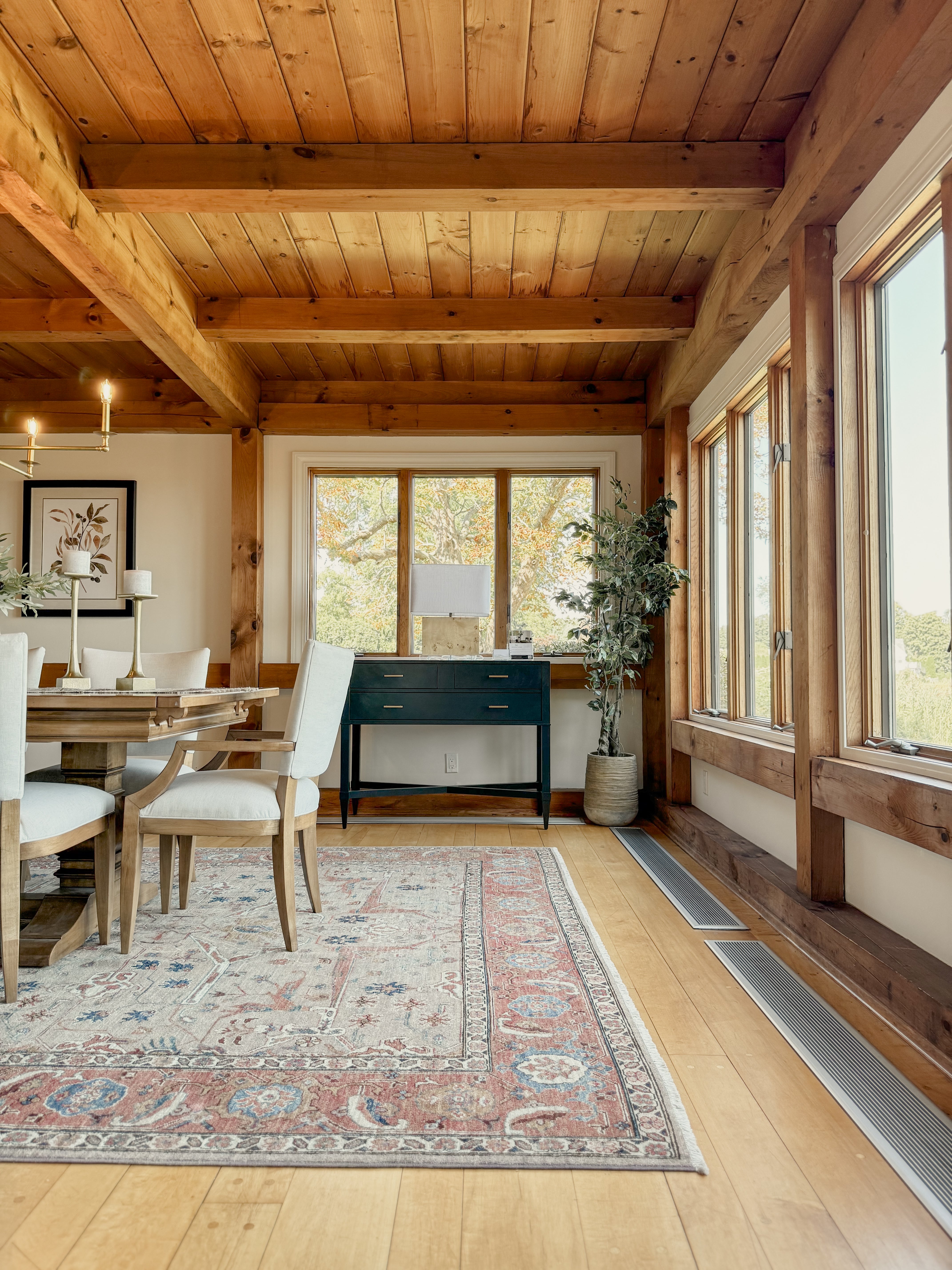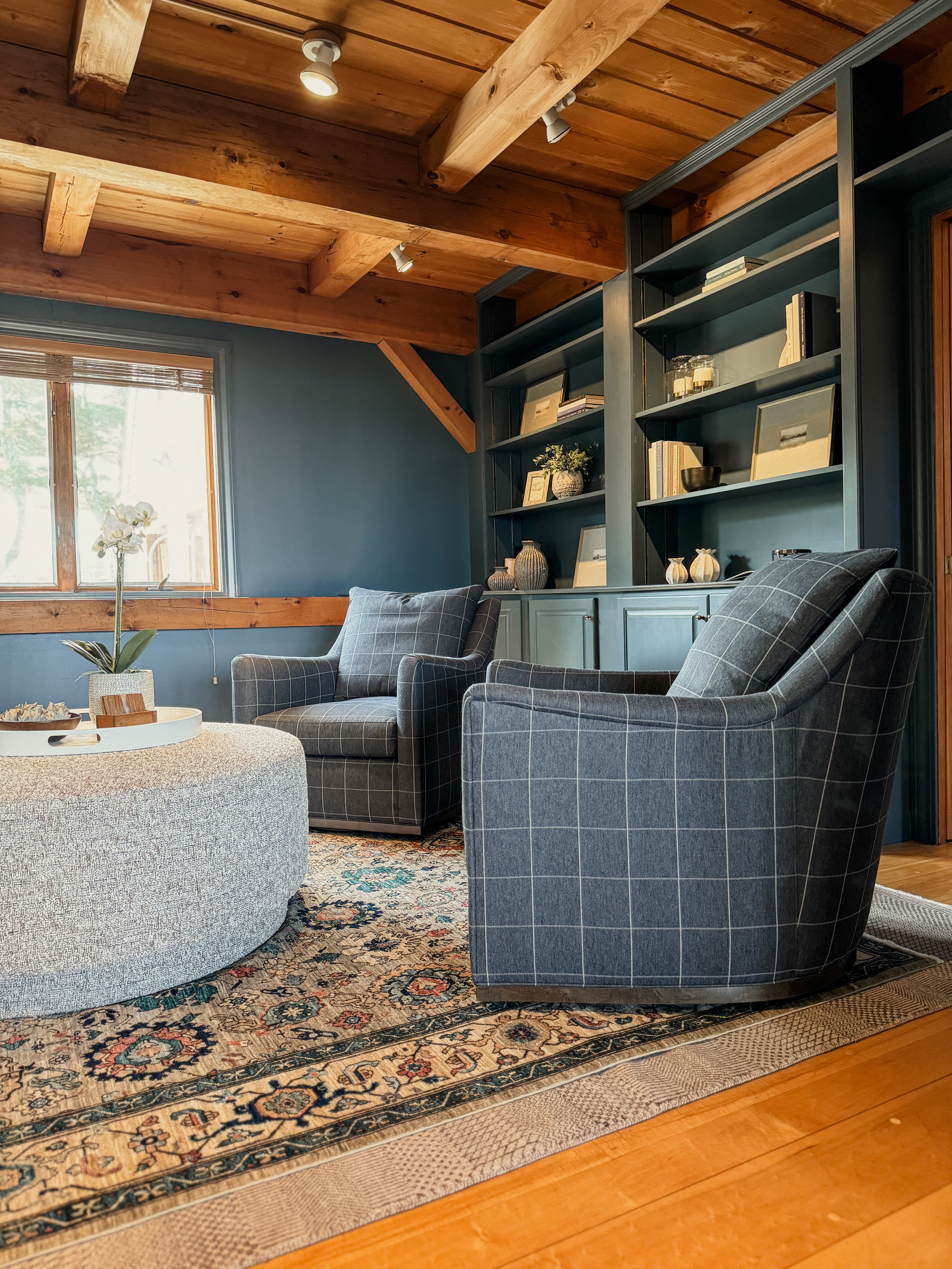 The home's timber framing and color palette inspired the direction our design team went in when selecting rugs, upholstery and case pieces. Layering in textural elements enhanced the overall look of the home and created cohesion.