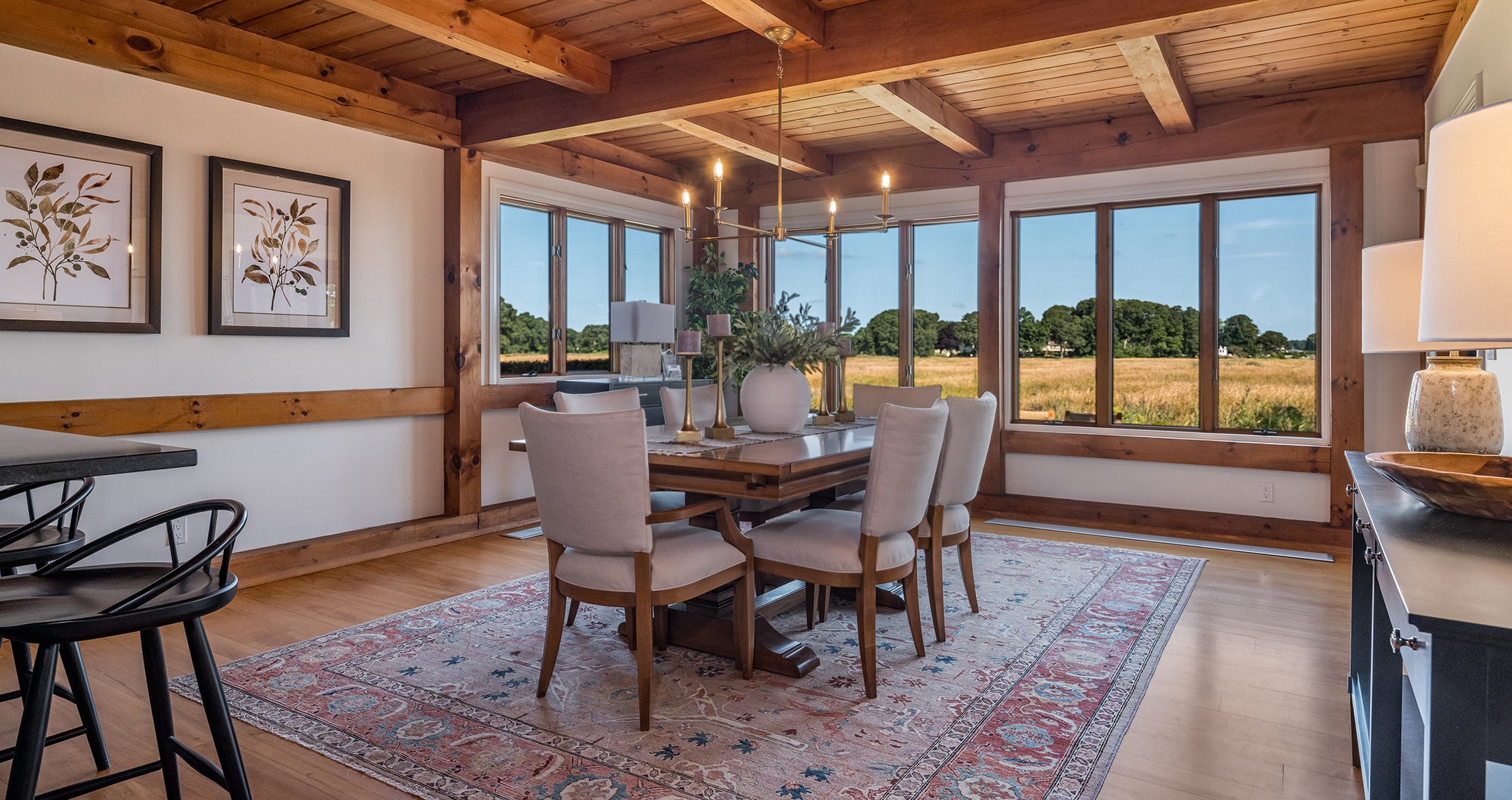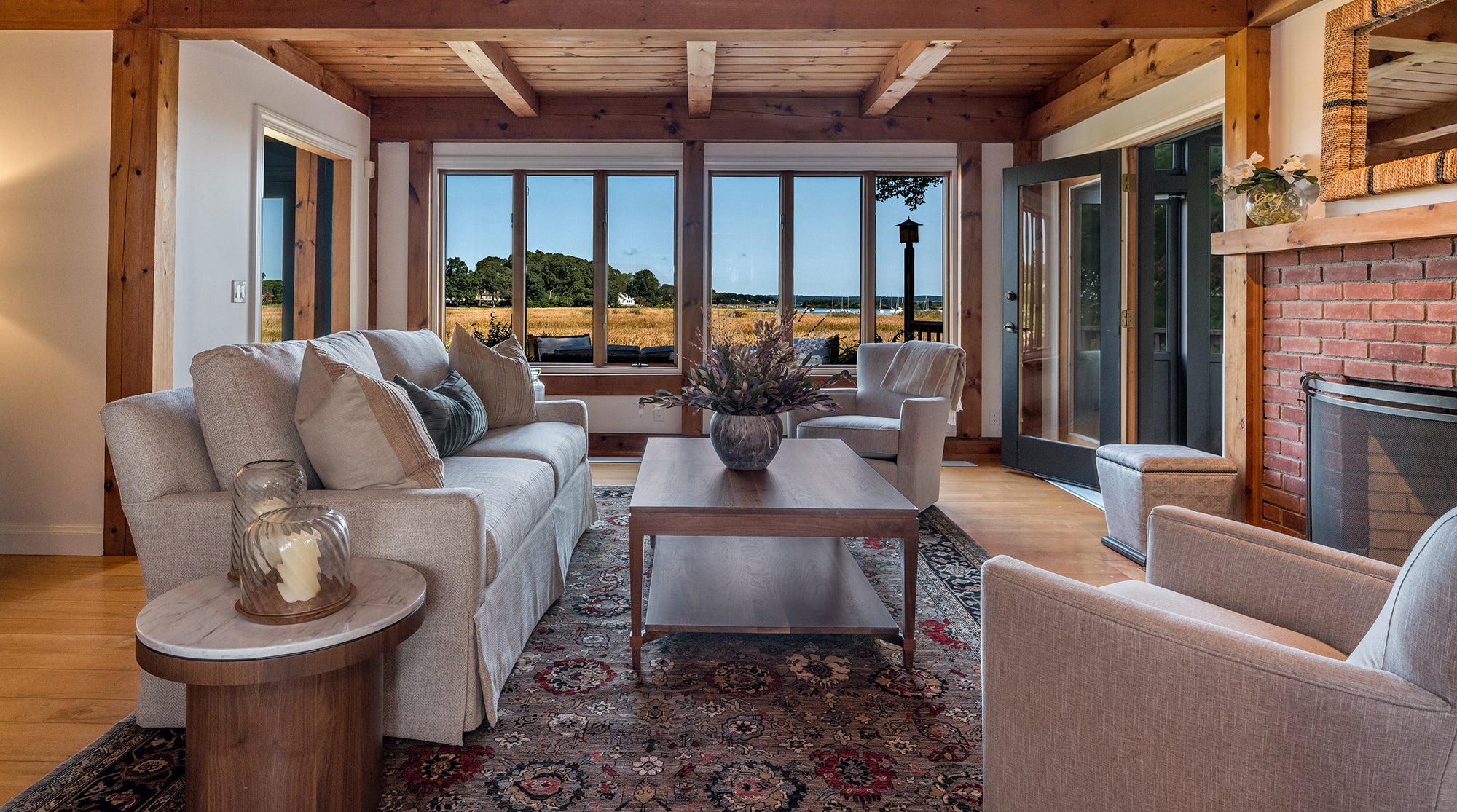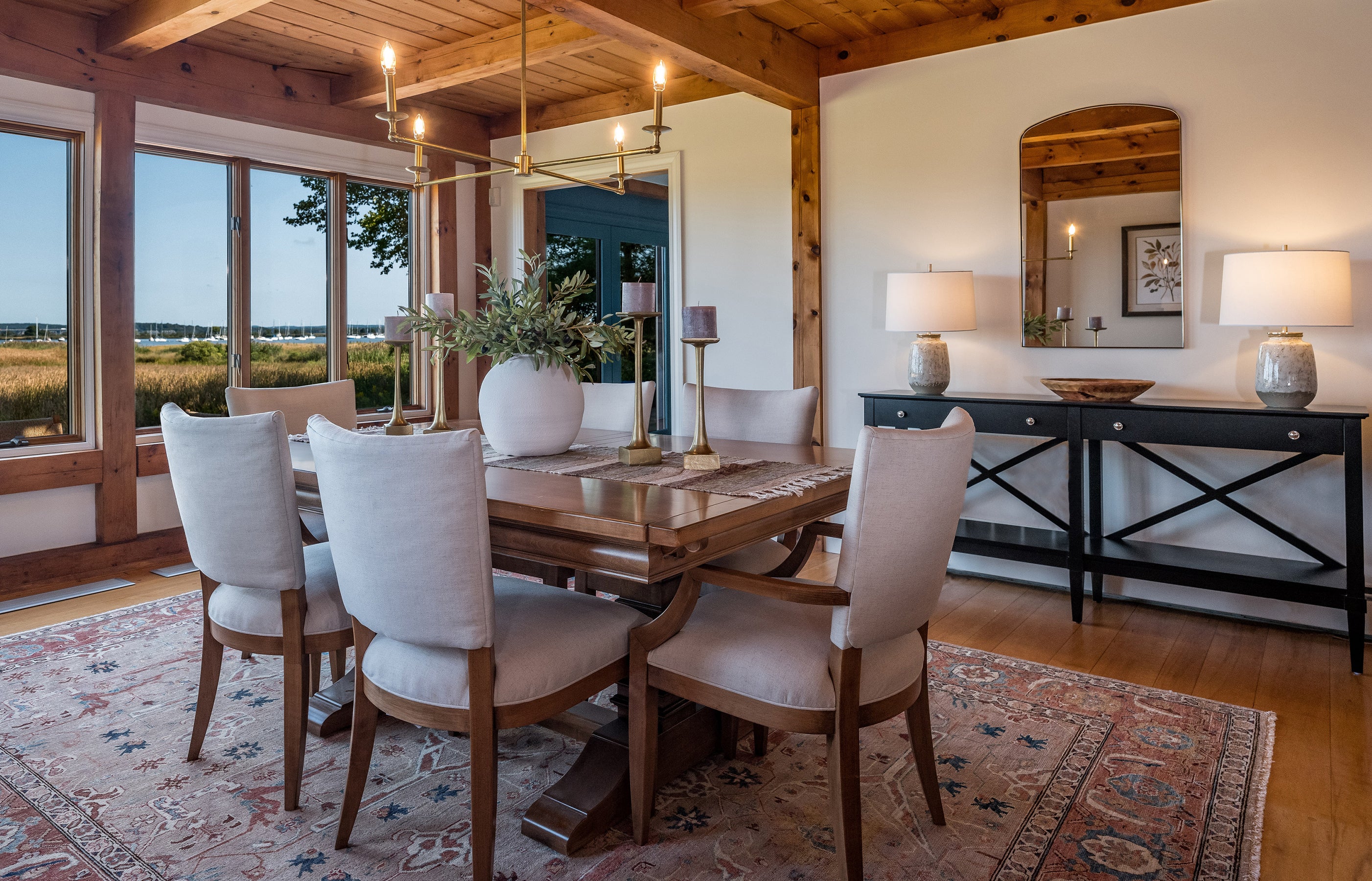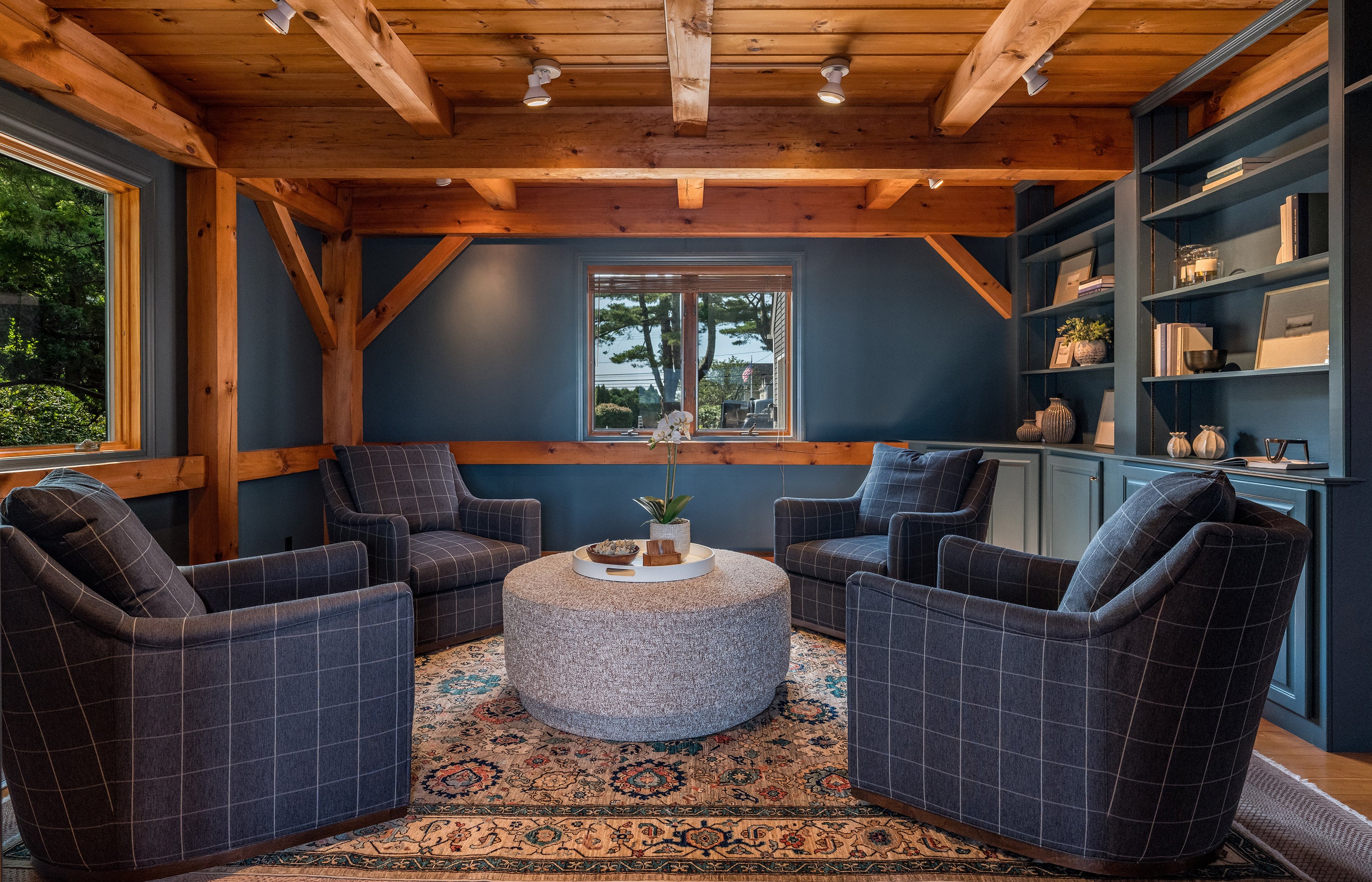 The home's timber framing and color palette inspired the direction our design team went in when selecting rugs, upholstery and case pieces. Layering in textural elements enhanced the overall look of the home and created cohesion.
