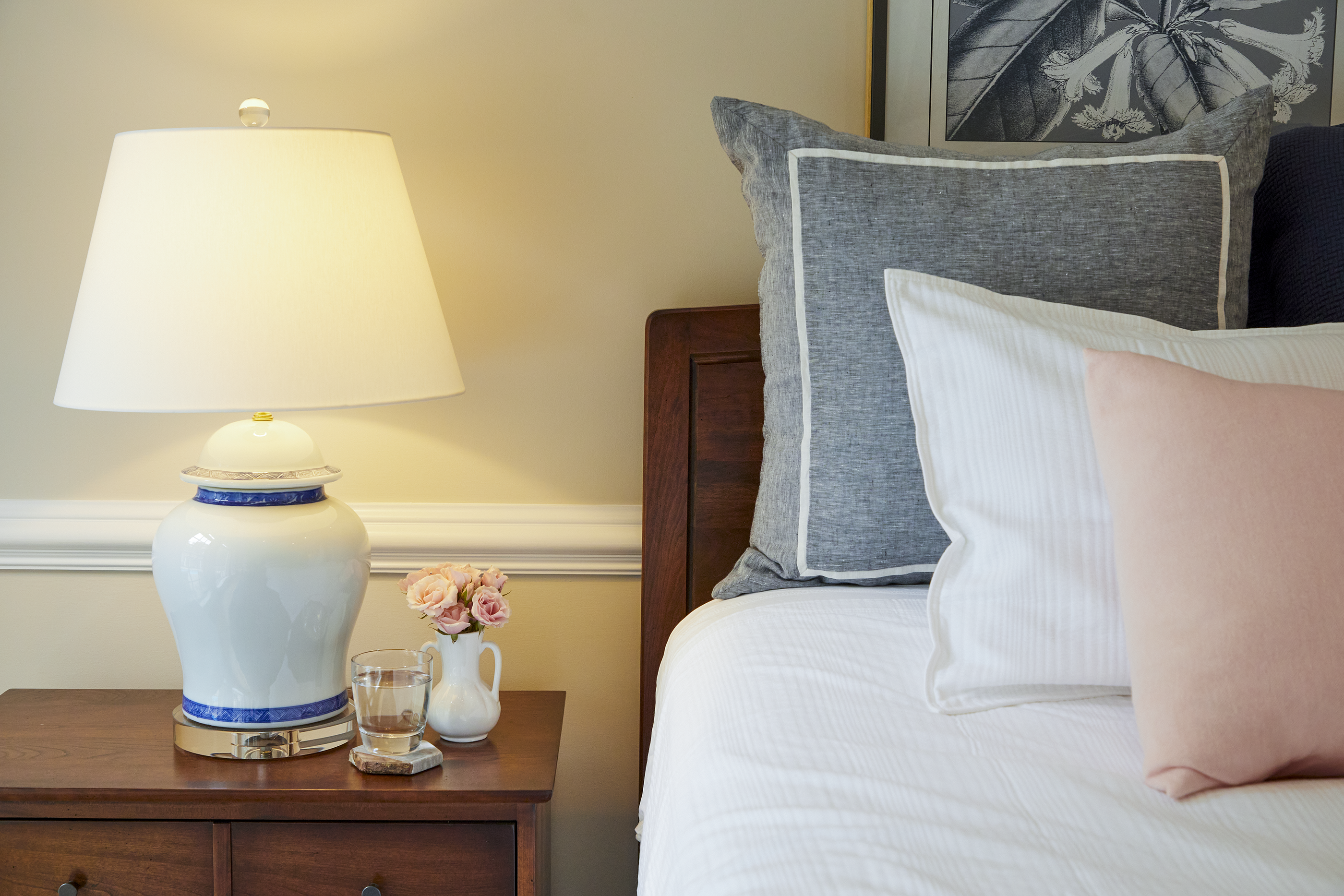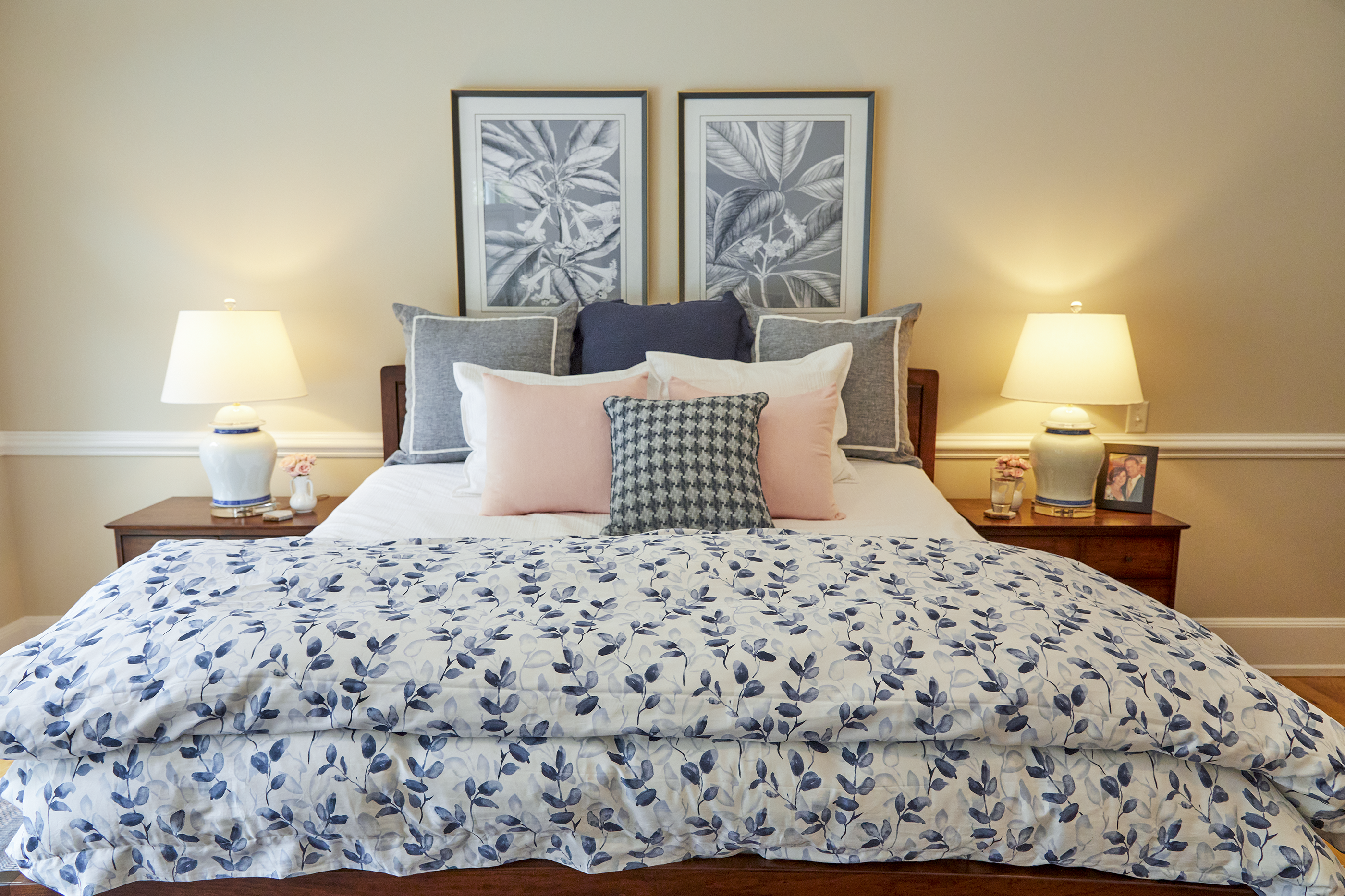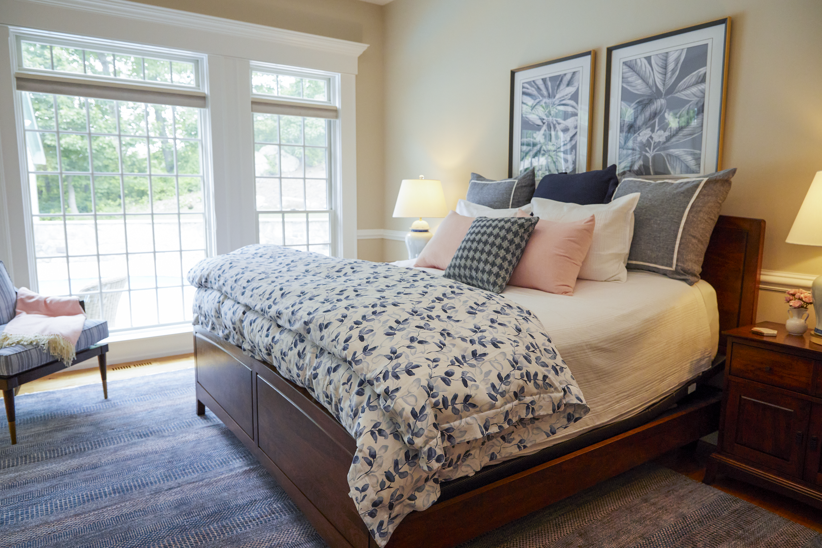 A mix of soft colors exude serenity. The primary bedroom is a peaceful retreat.