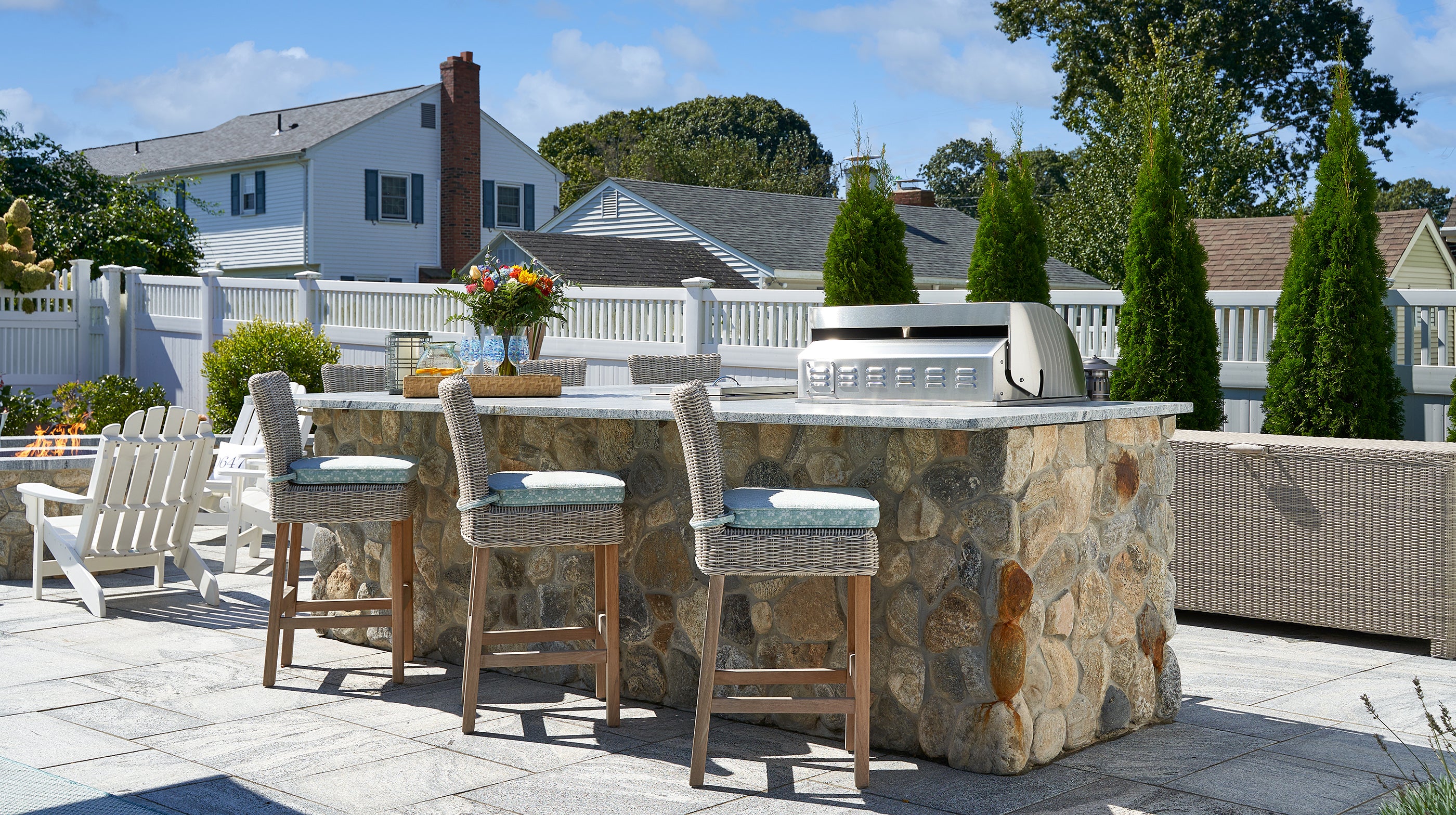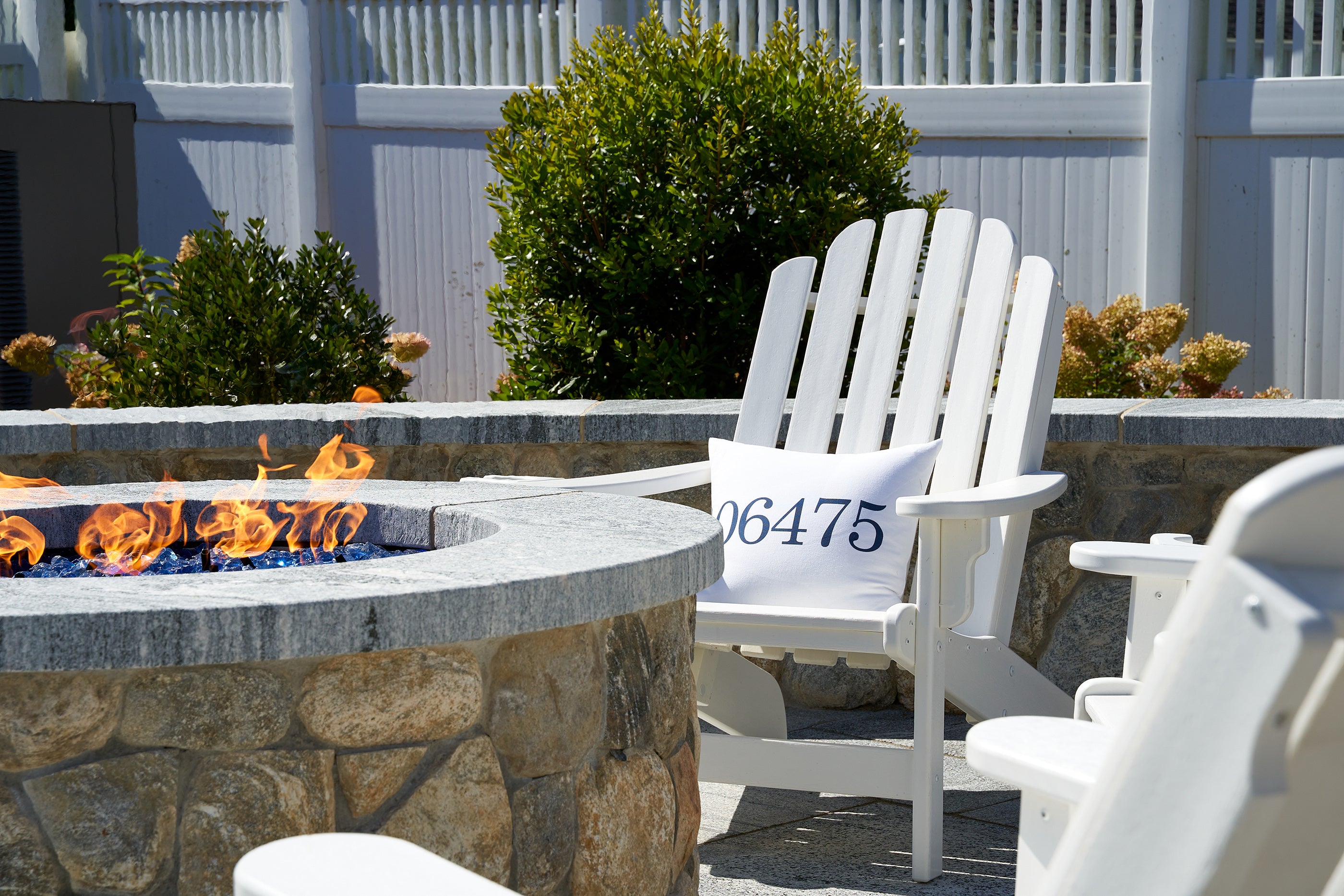 All-weather Adirondack chairs by the fireside are the perfect solution for comfortable, durable seating to enjoy year round.