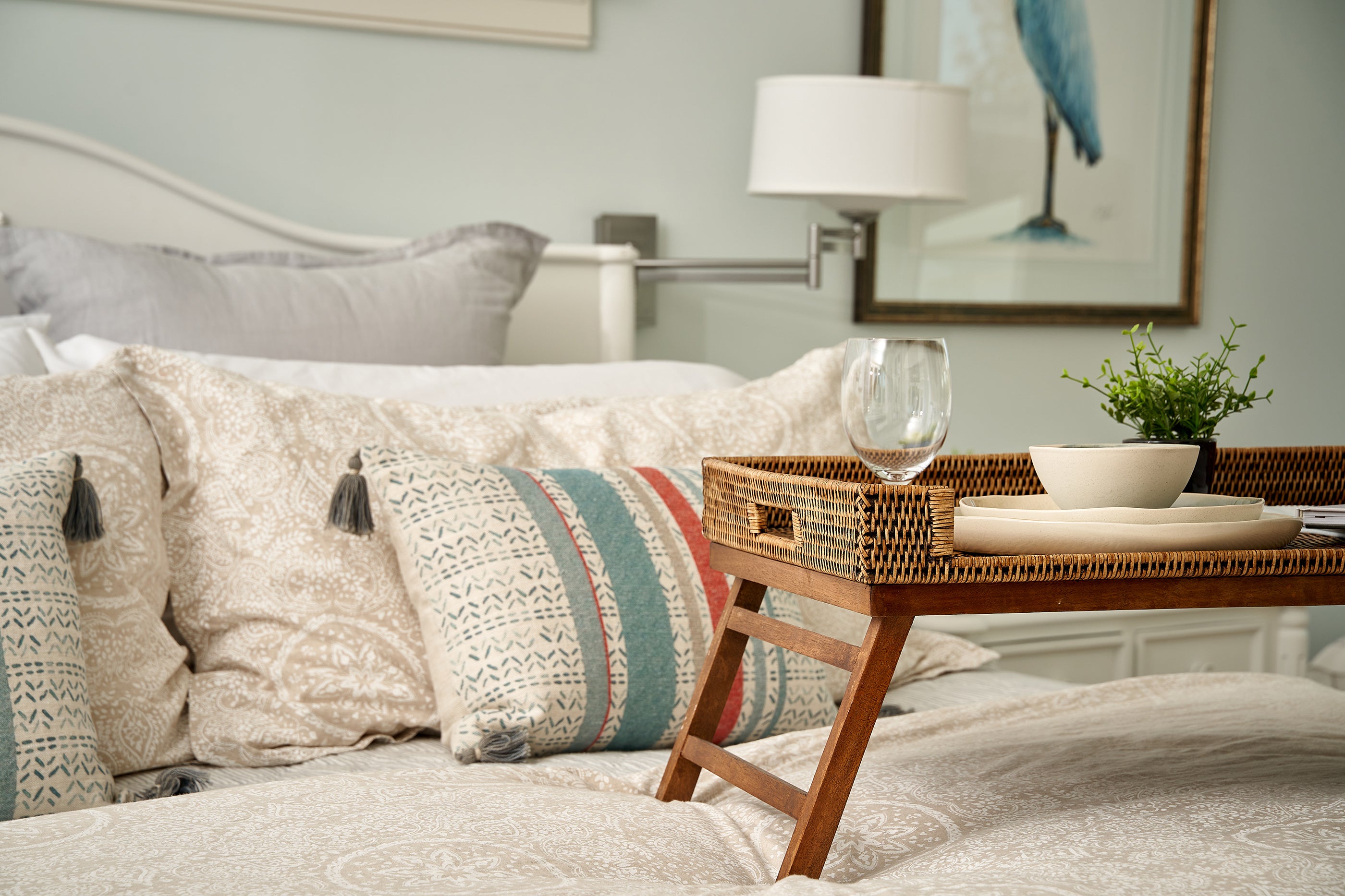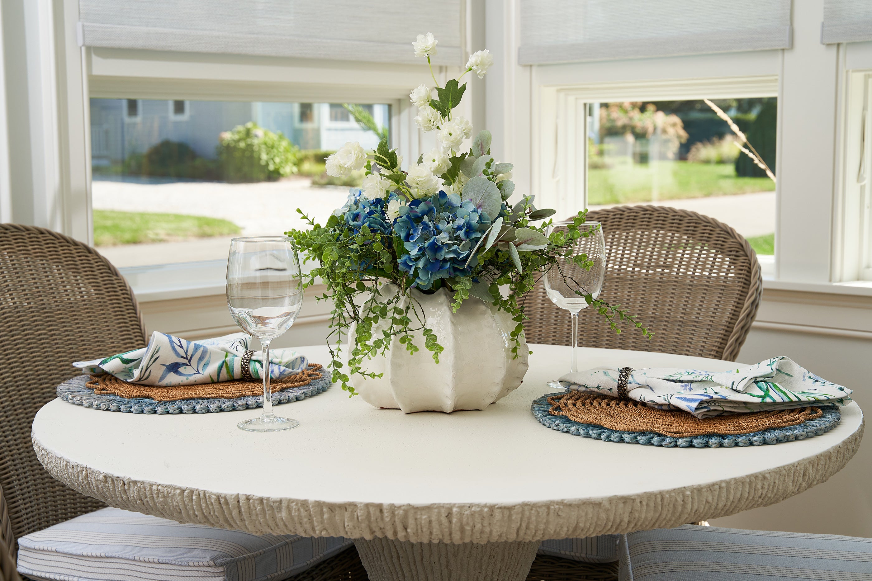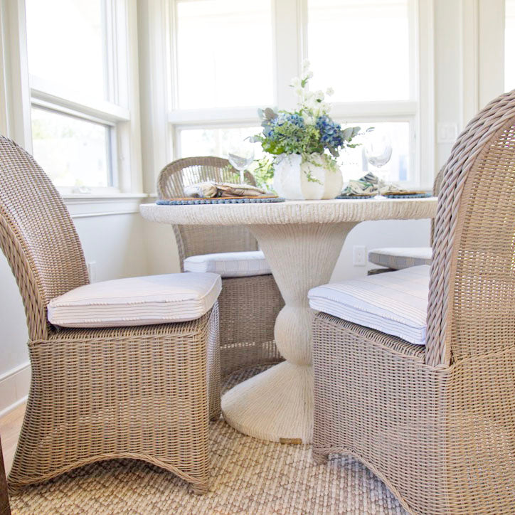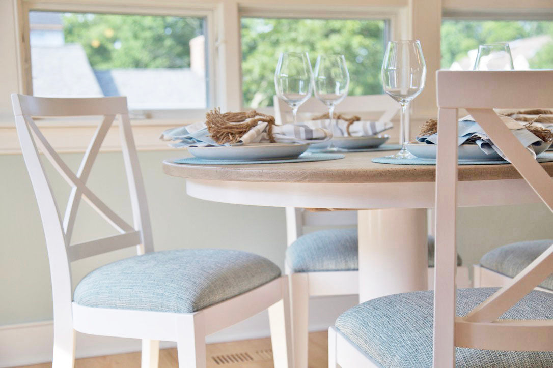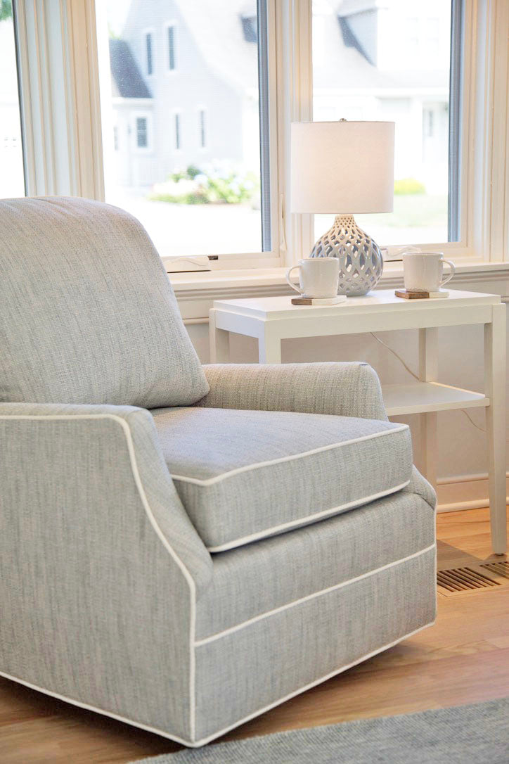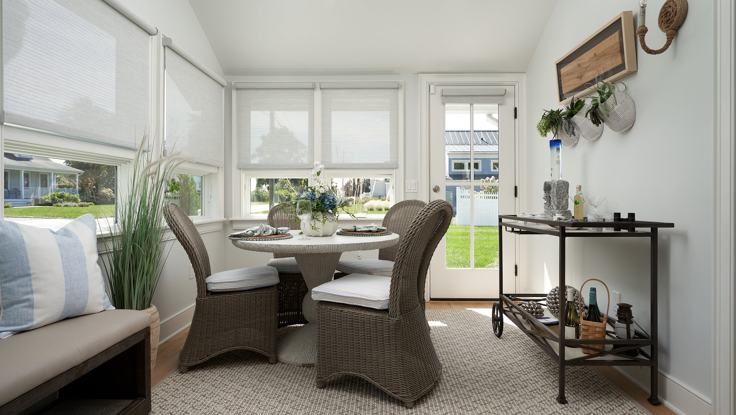The sunroom is the perfect spot for morning coffee. The color story translates perfectly to this space. Custom shades offer a practical solution without sacrificing style.