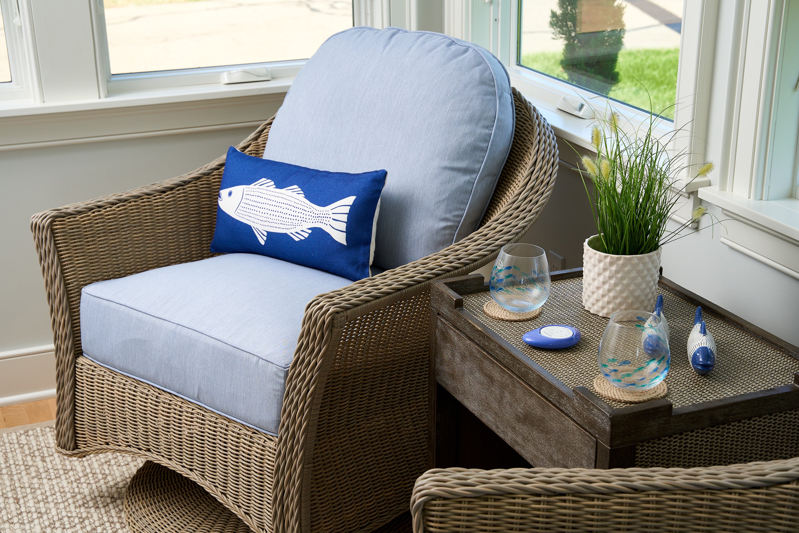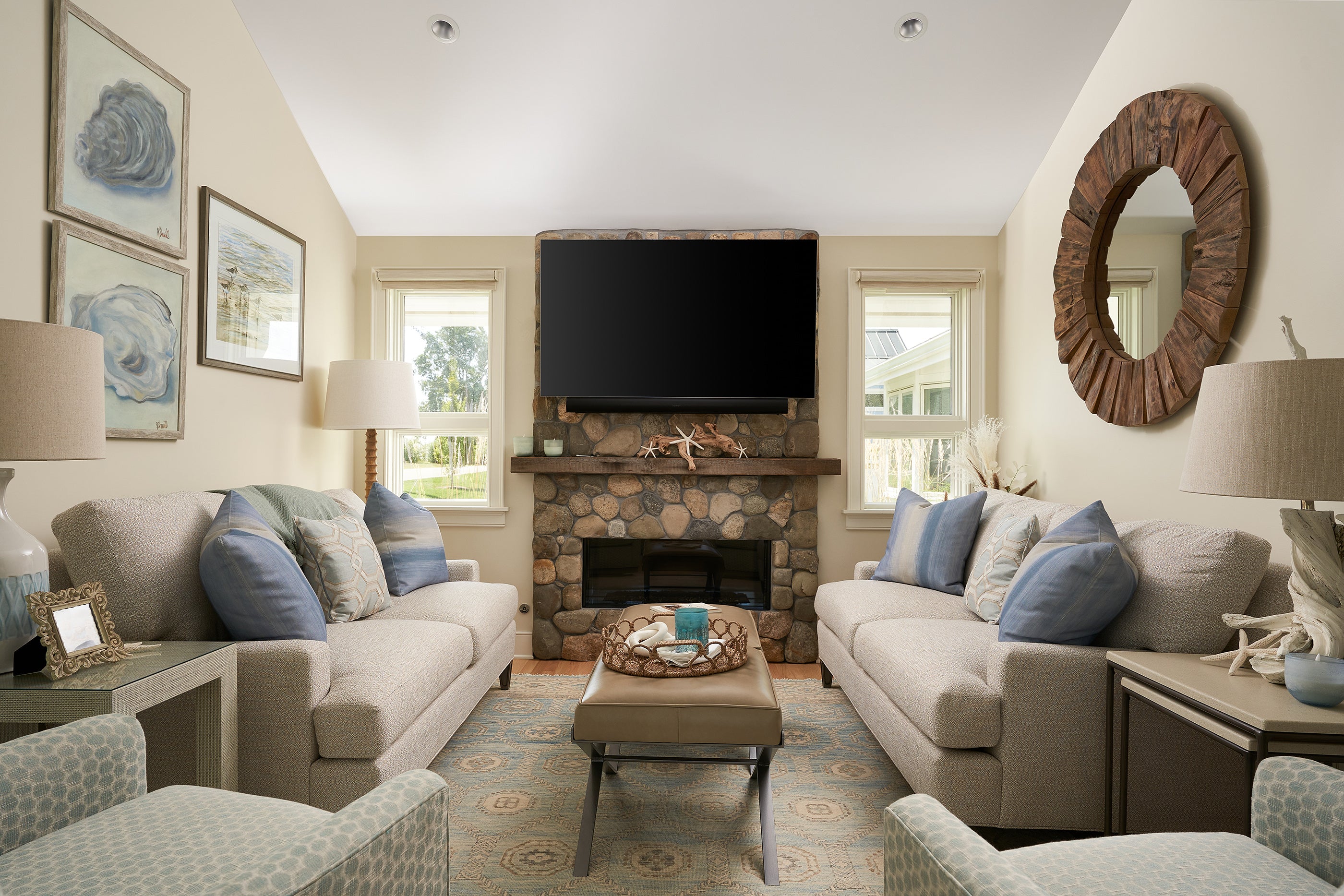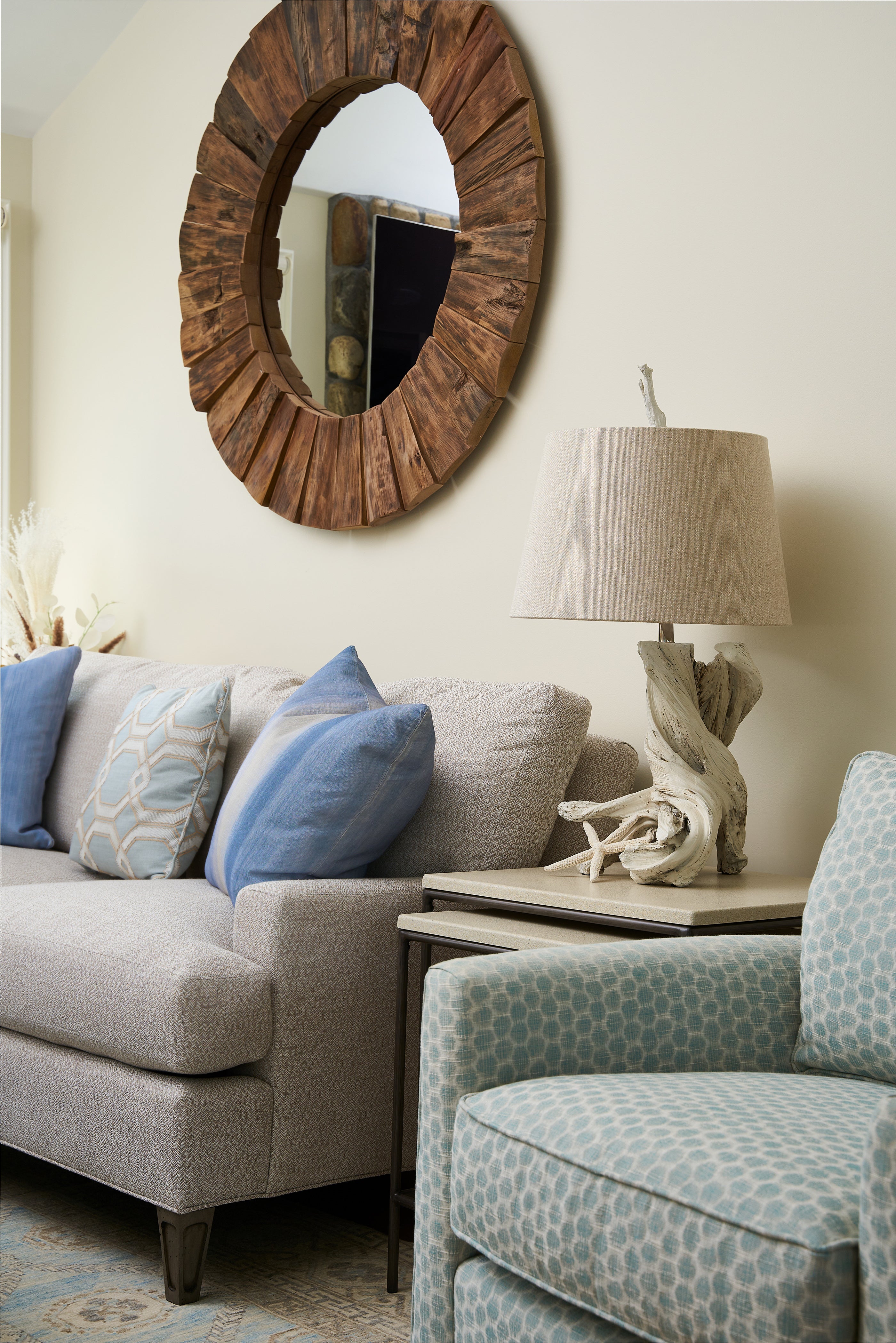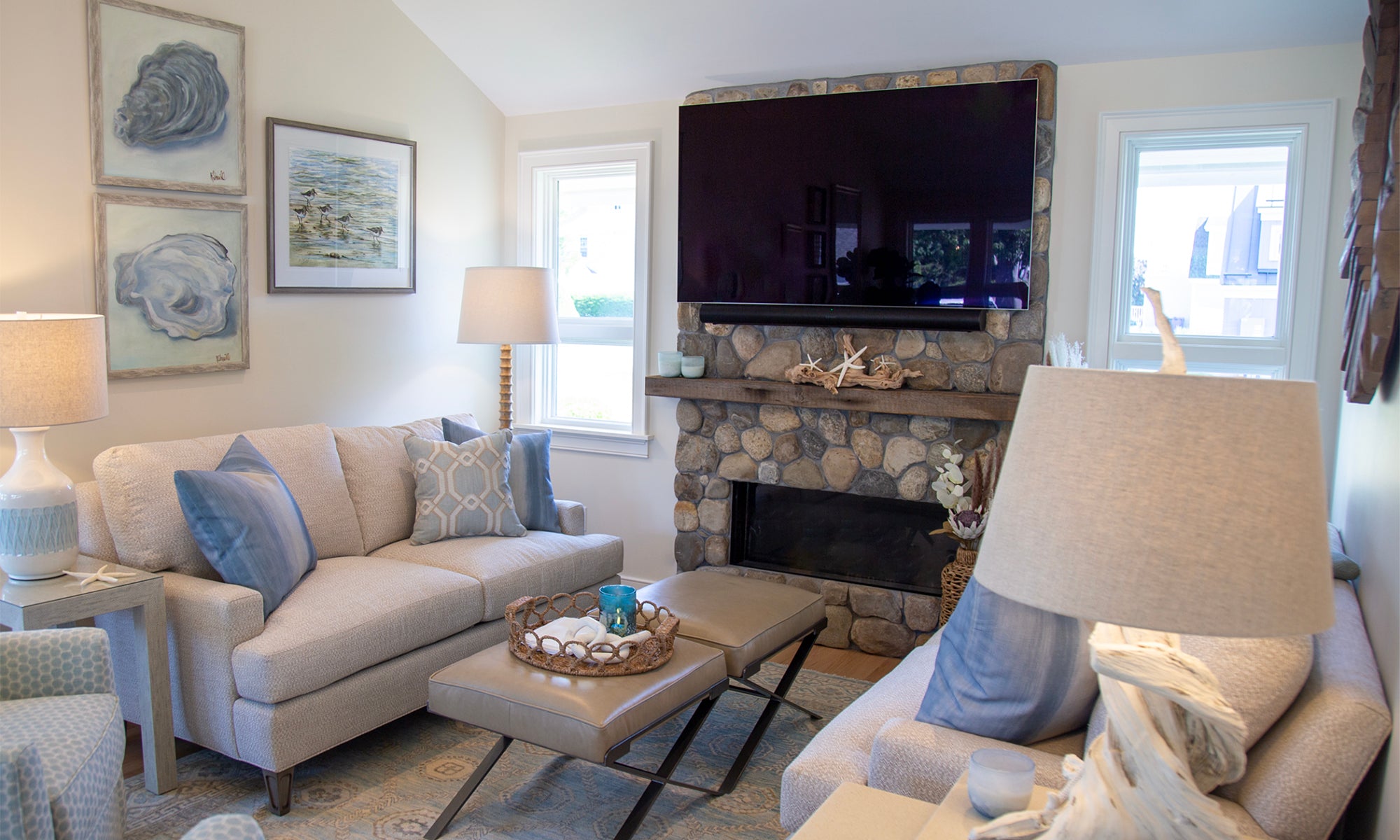 Inspired by the coastal vibe set off by the blue quartz kitchen countertop, Senior Designer Molly Dodd wanted to create cozy, yet inviting spaces with touches of the sea sprinkled throughout.