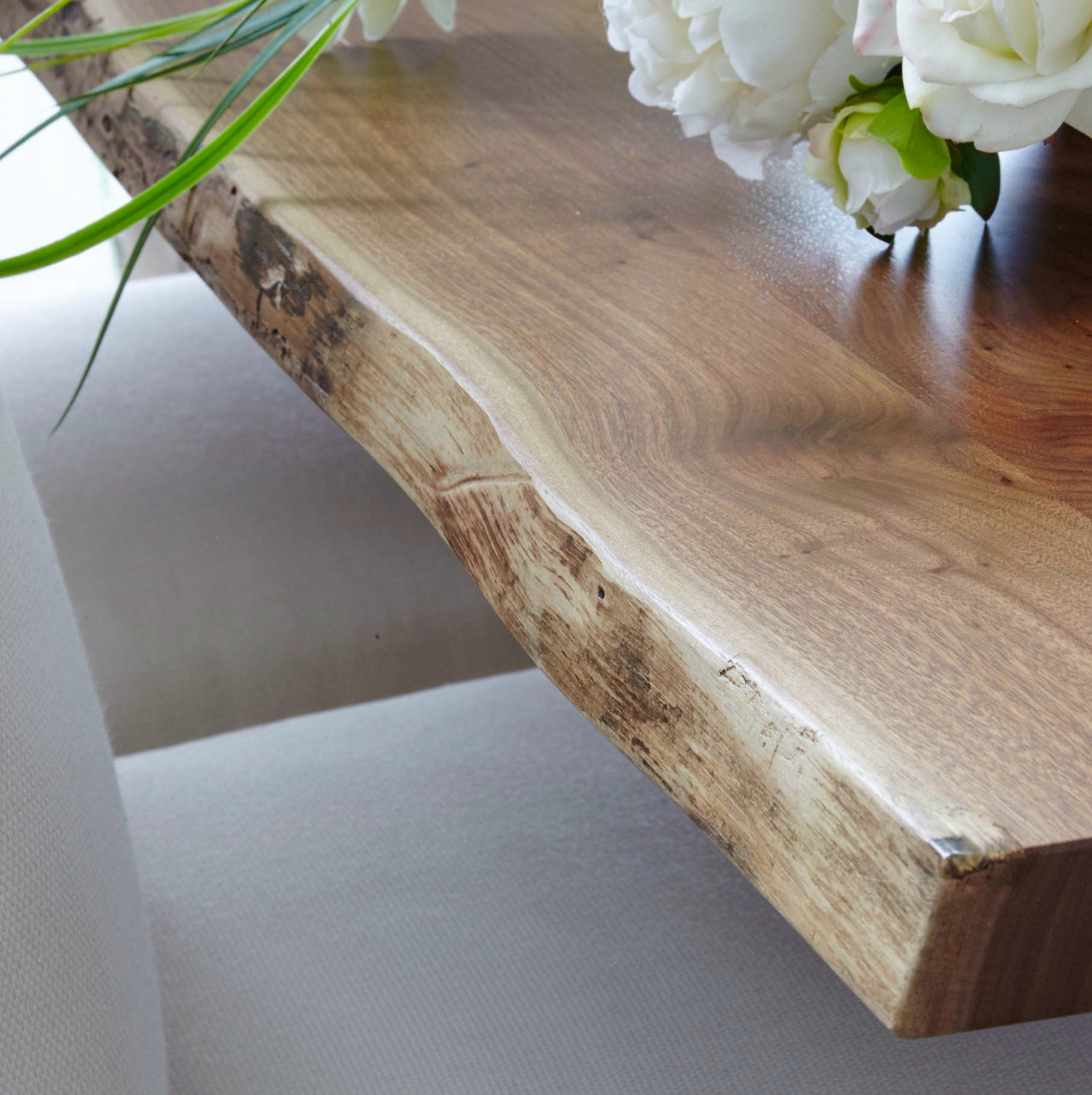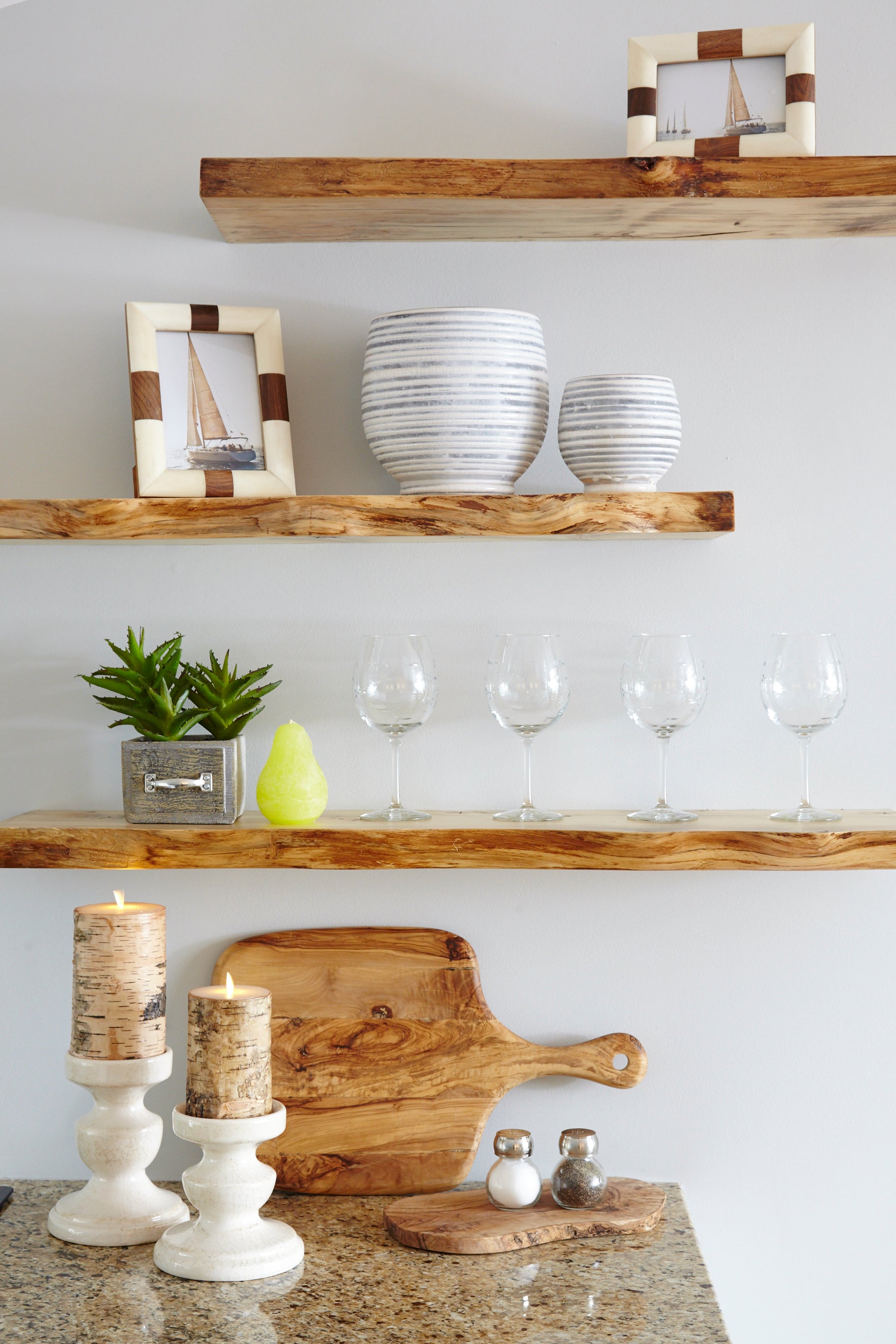 Along with the water view hues, natural elements, such as a live edge dining room table and shelving add natural interest to the space.