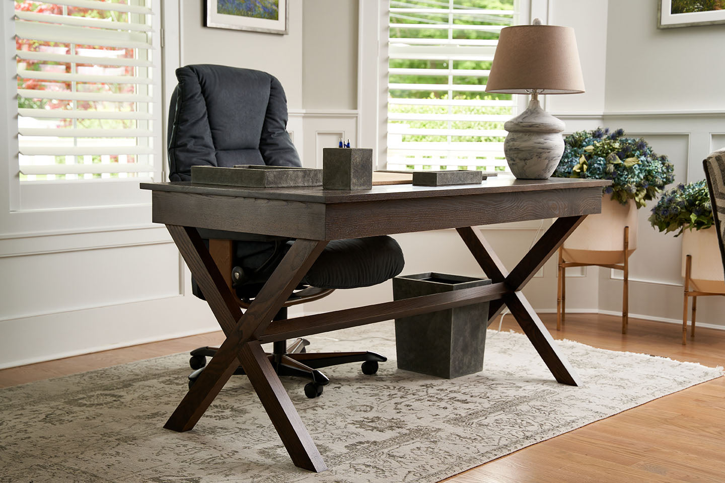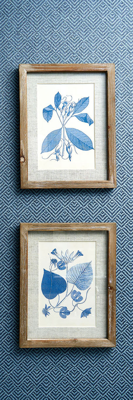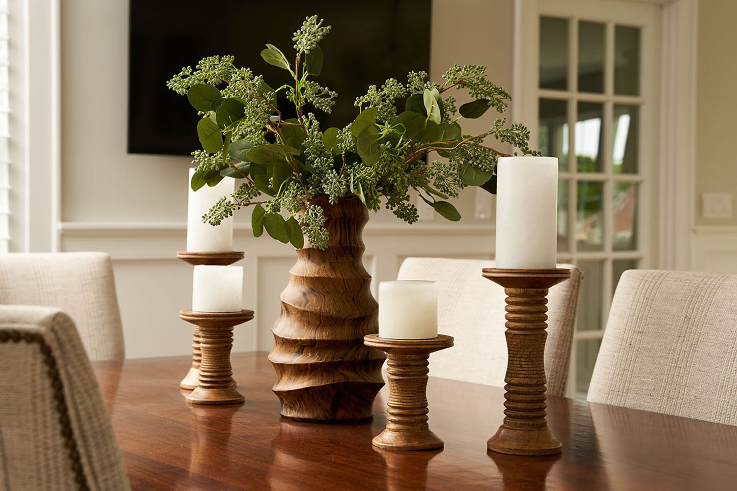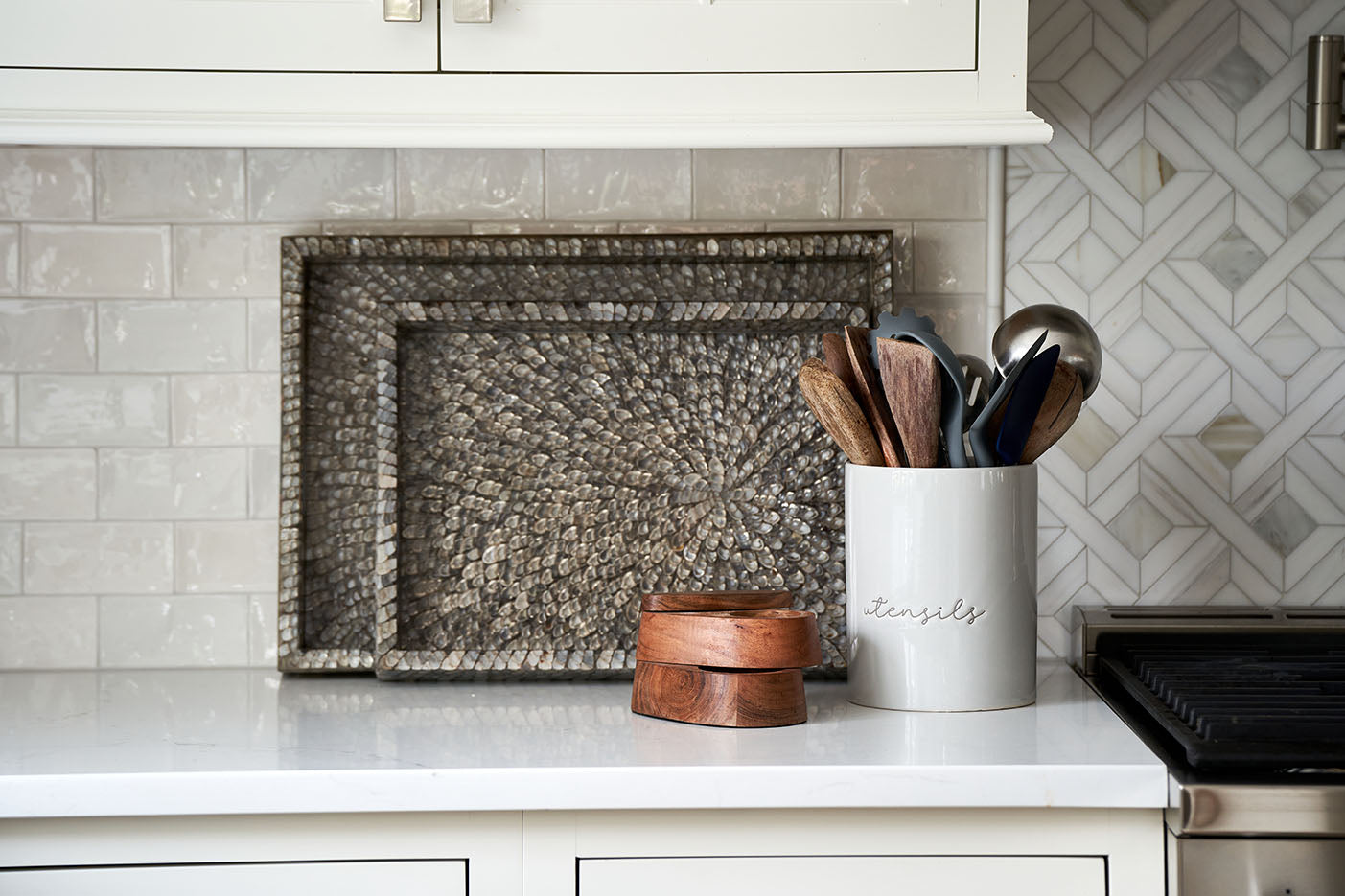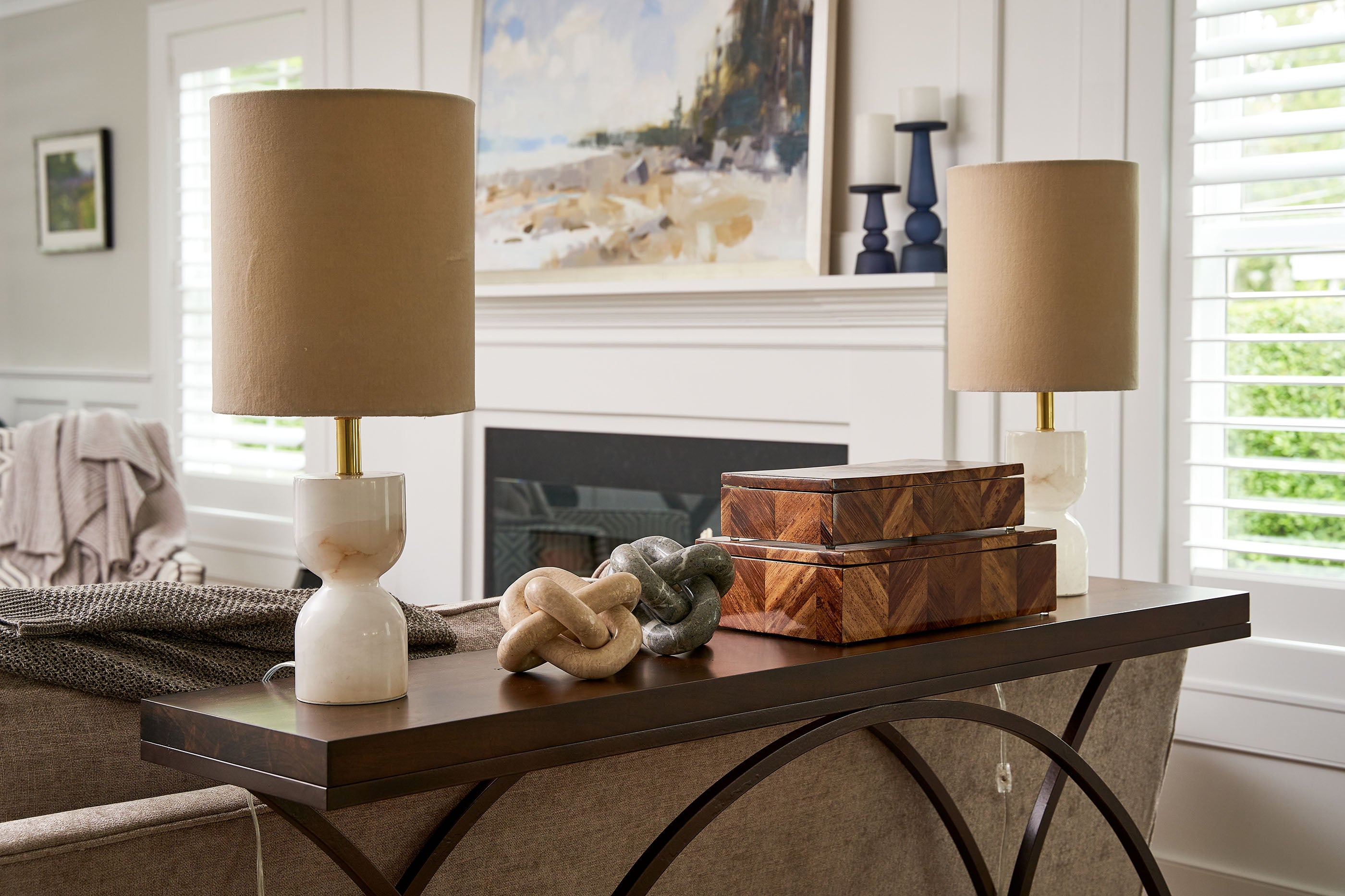 Jackie used a lot of mixed materials - iron, wood, marble, wicker - for added interest. A great example of this is the nesting coffee tables in the living room - one with a wood top, and the other with marble. Other elements in the living room, such as the leather recliners, the glass and metal console table under the television and the upholstered sectional reinforce this theme.