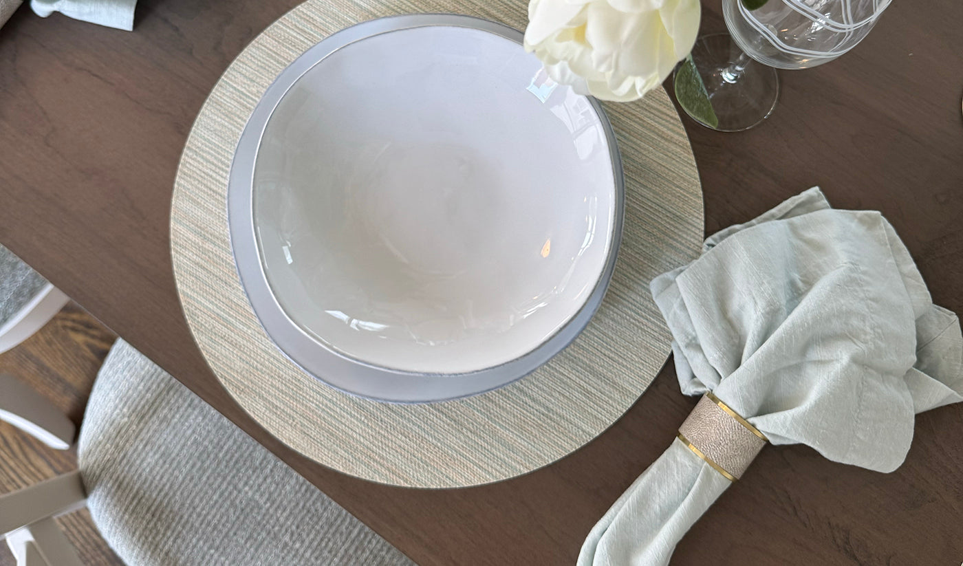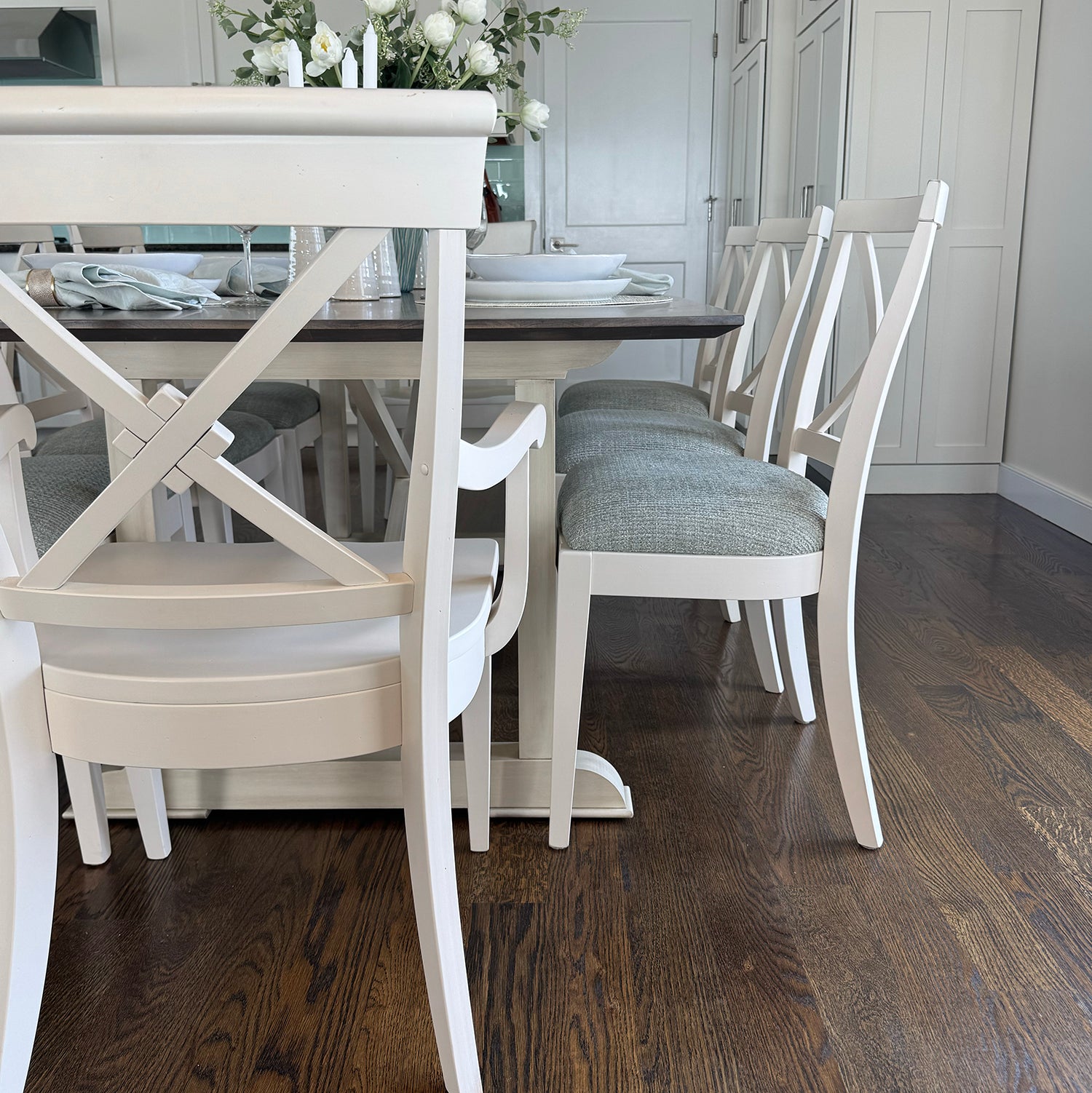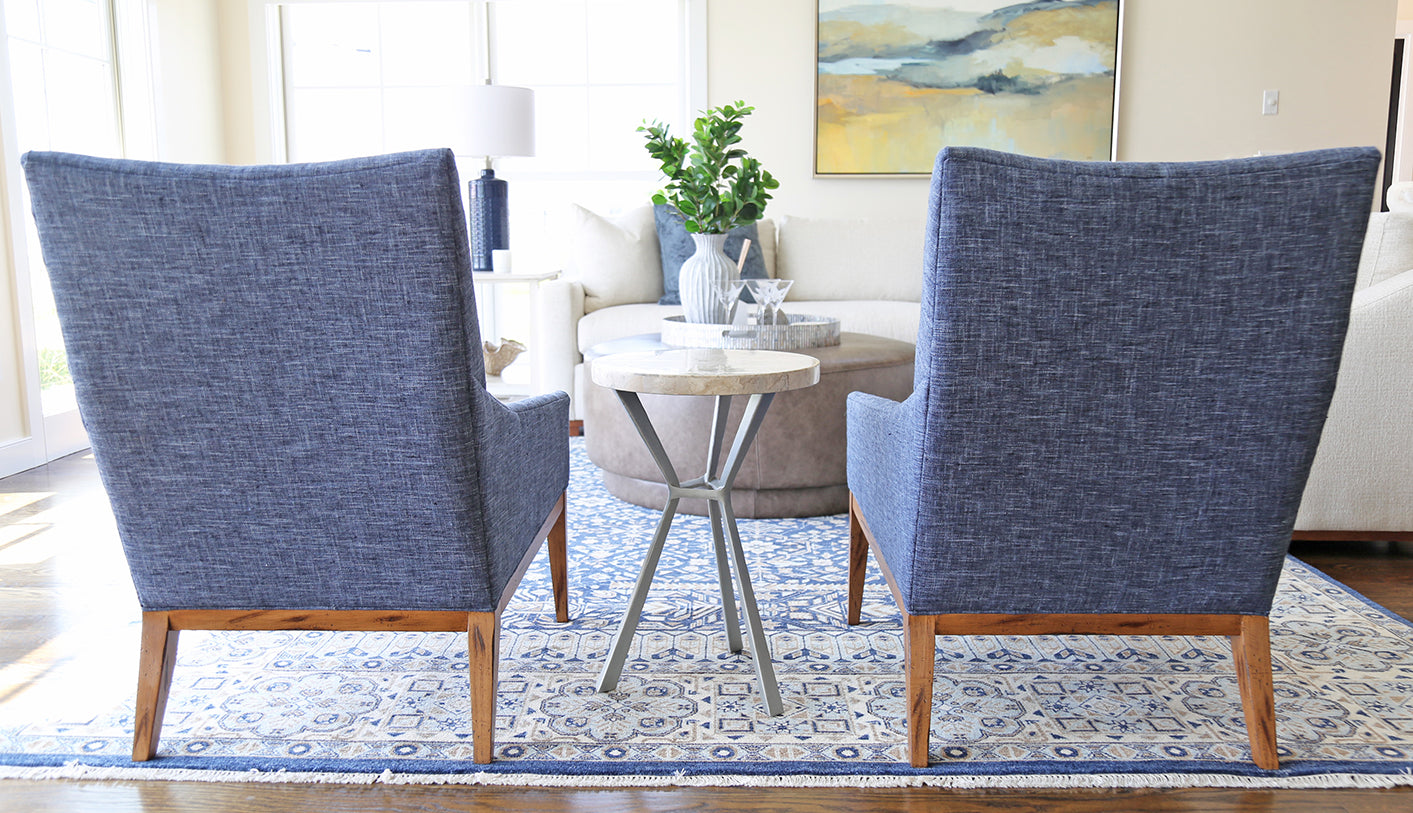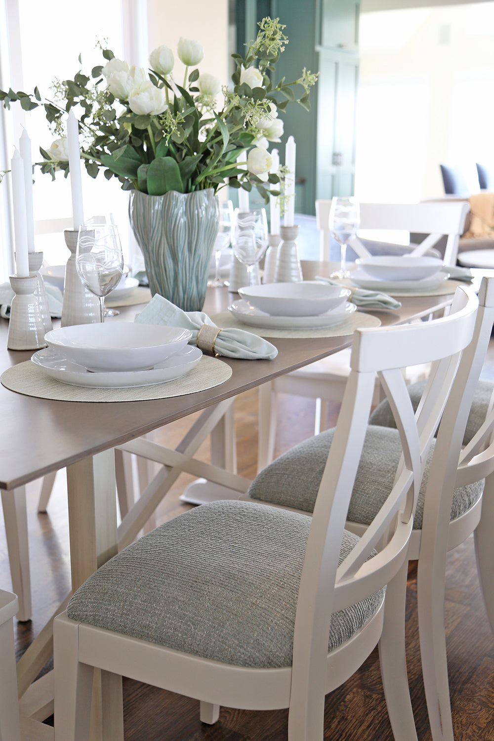 The coastal vibe of the home called for Kensington Chairs with an exquisite seafoam performance fabric seat cushion.